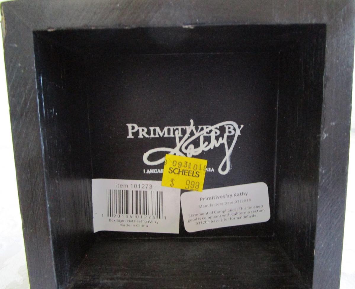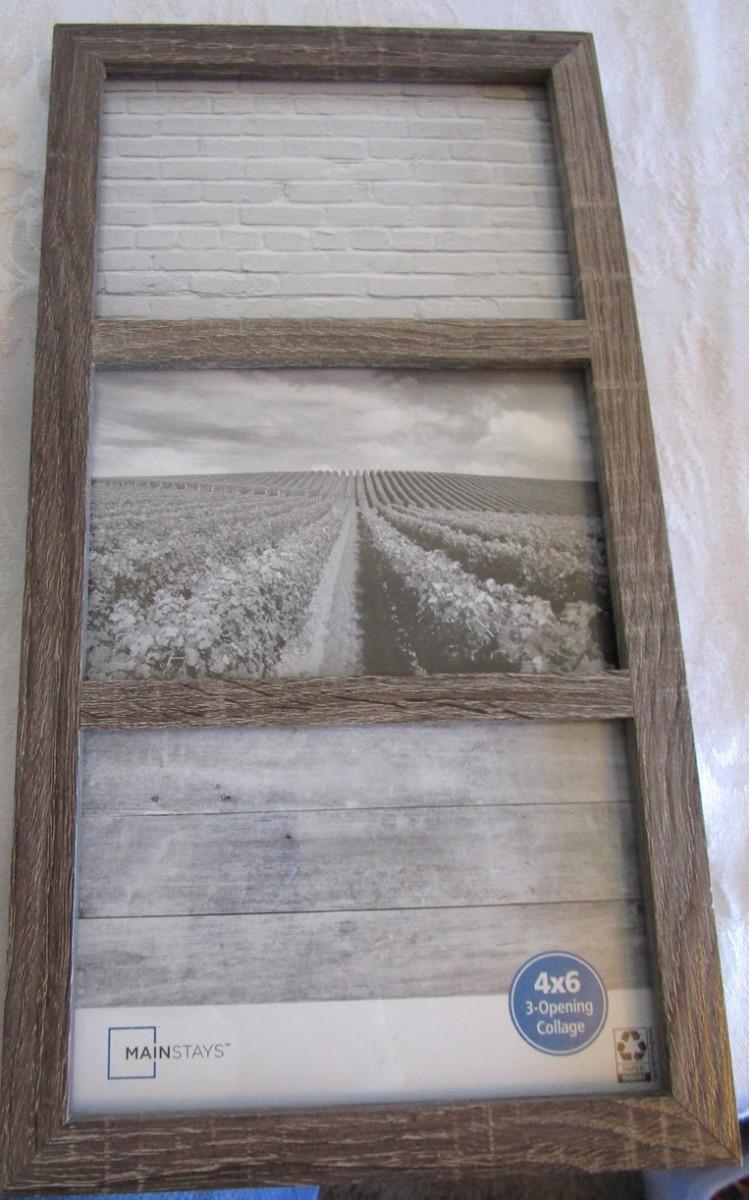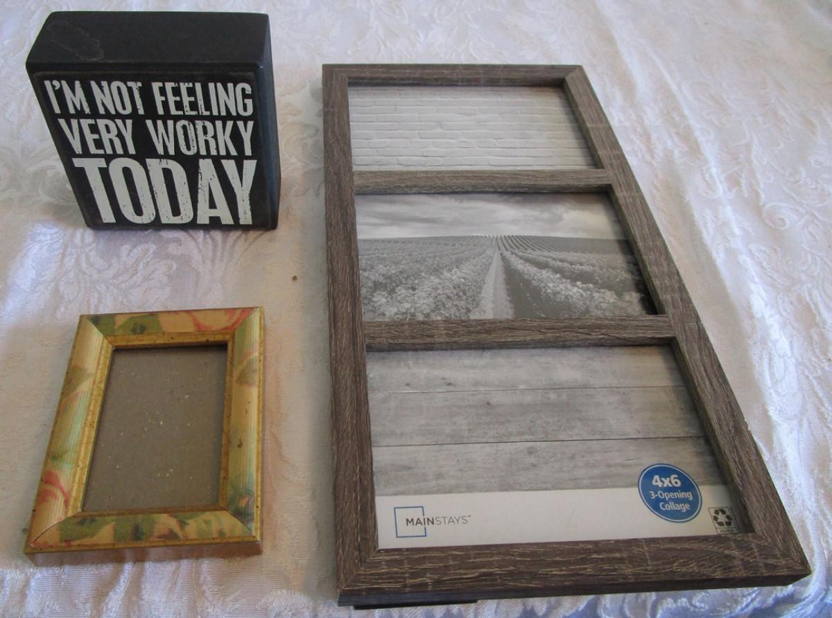 1 frame is 13" x 7" with 3- 4 x 6 picture slots; 1 frame is 3-1/2 x 4-1/2; 4" x 4" plaque says "I'm Not Feeling Very Worky Today"