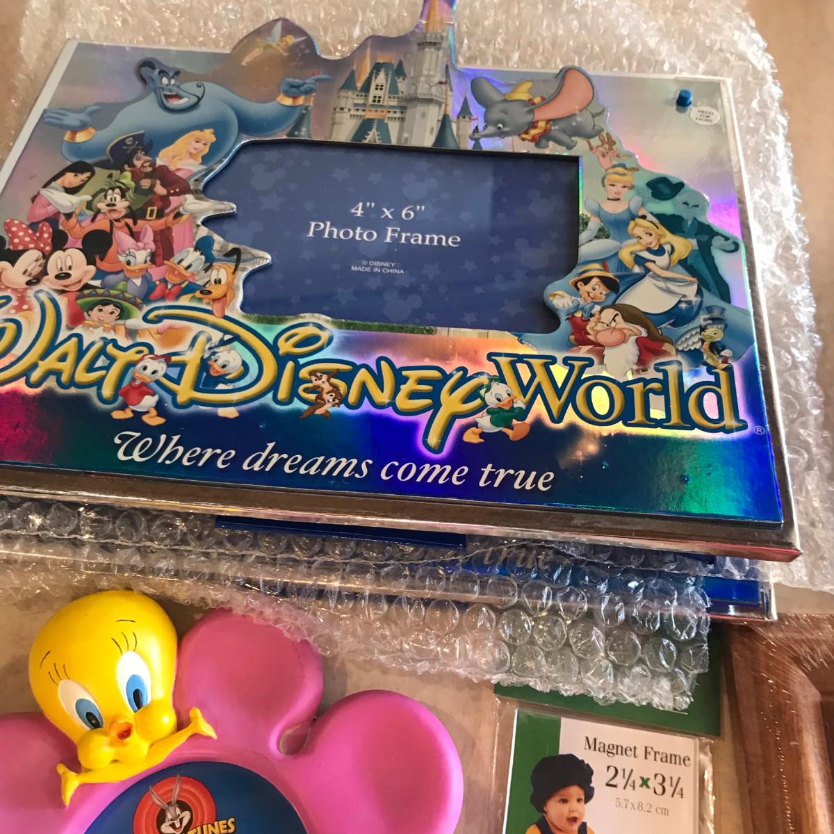Disney World picture frames (2), are new in bubble wrap. Tweetie bird is cool! I see JR even has a photo in this lot!