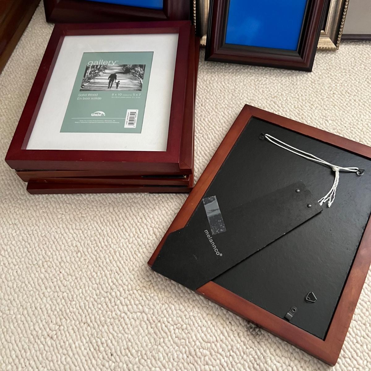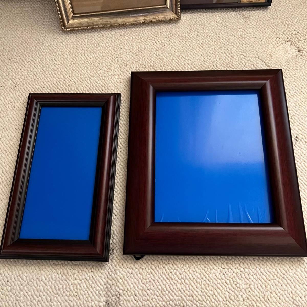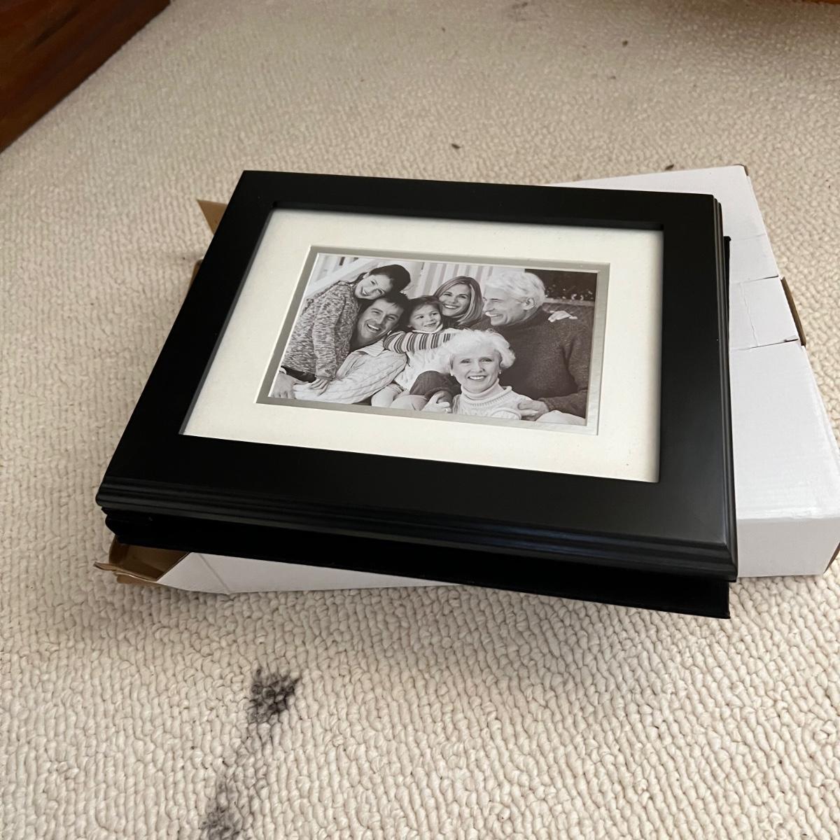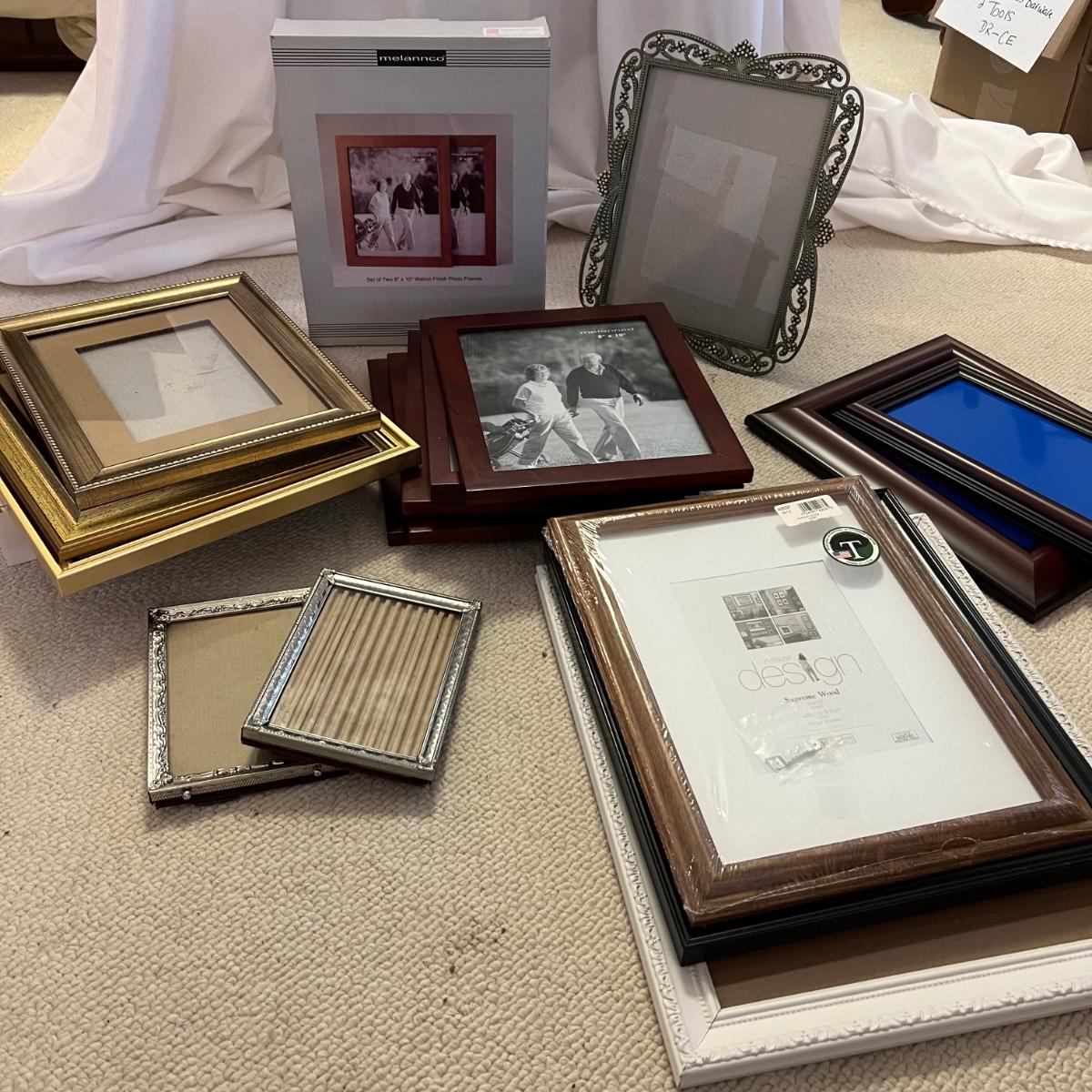 Over 15 frames in this lot, some of which are brand new. Frames are either wood or metal. Lot also includes a new in box photo album.