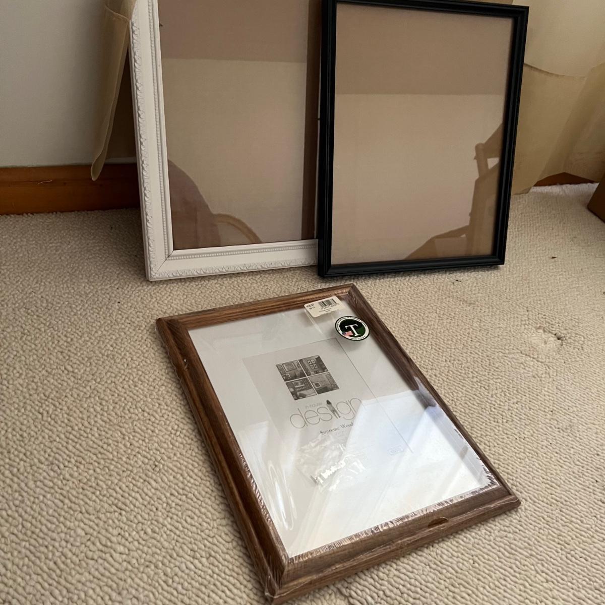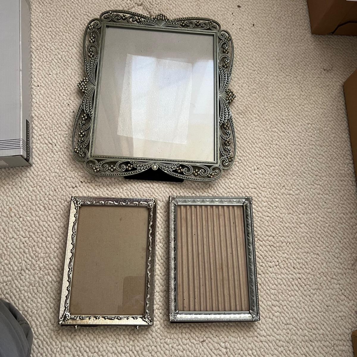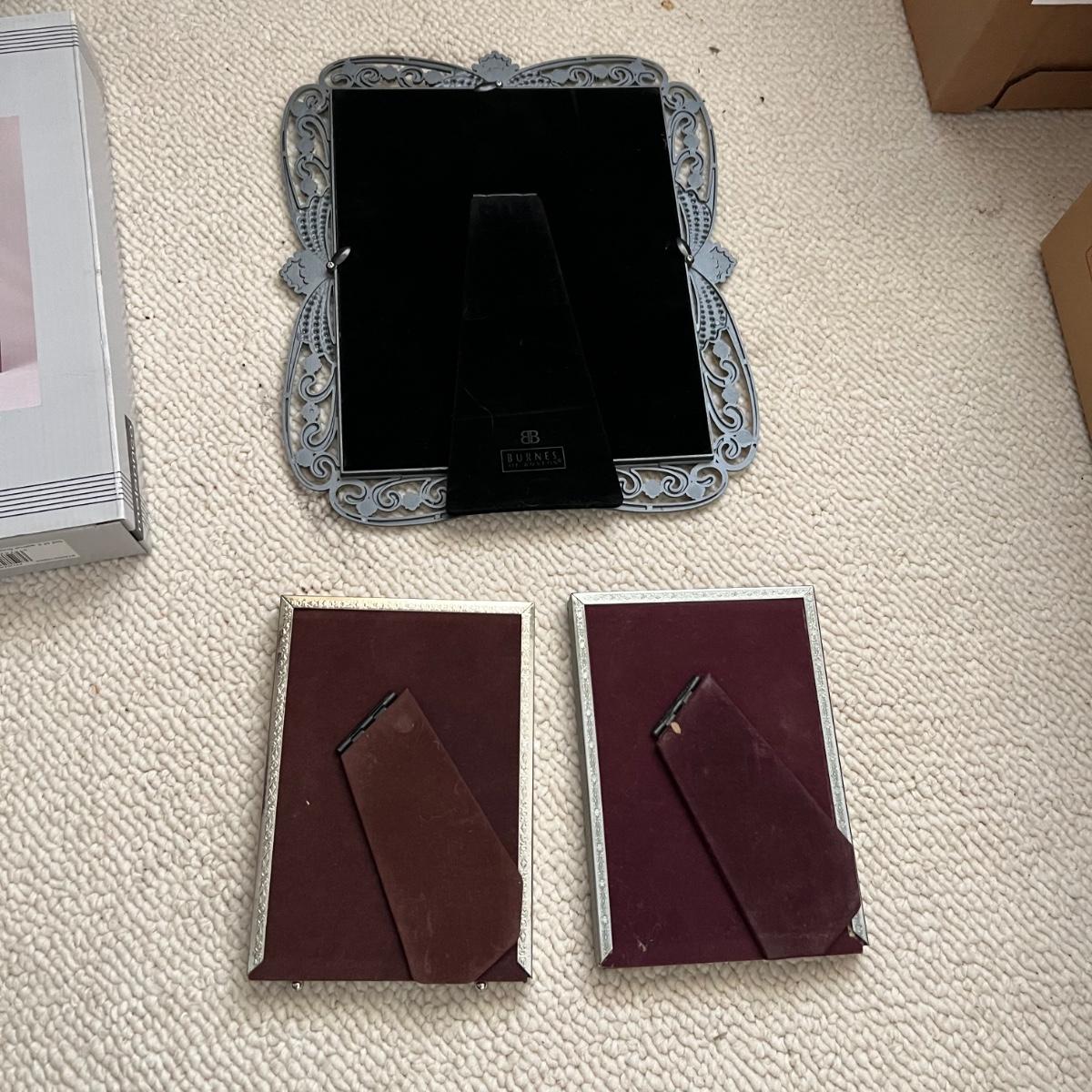 Over 15 frames in this lot, some of which are brand new. Frames are either wood or metal. Lot also includes a new in box photo album.