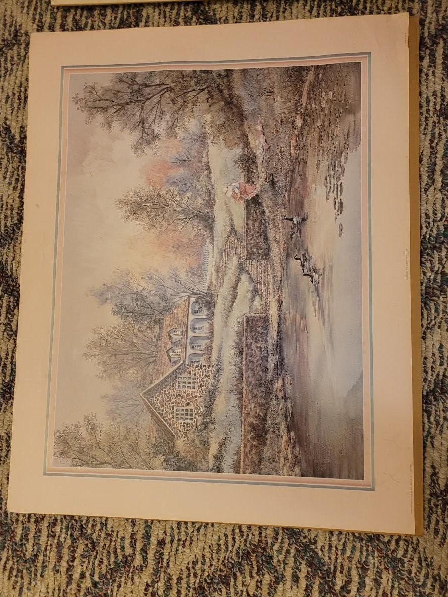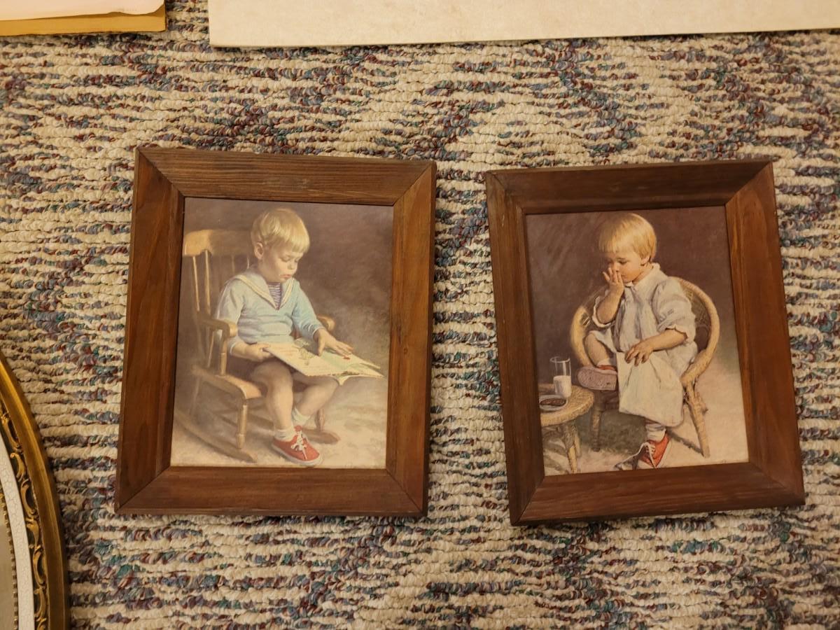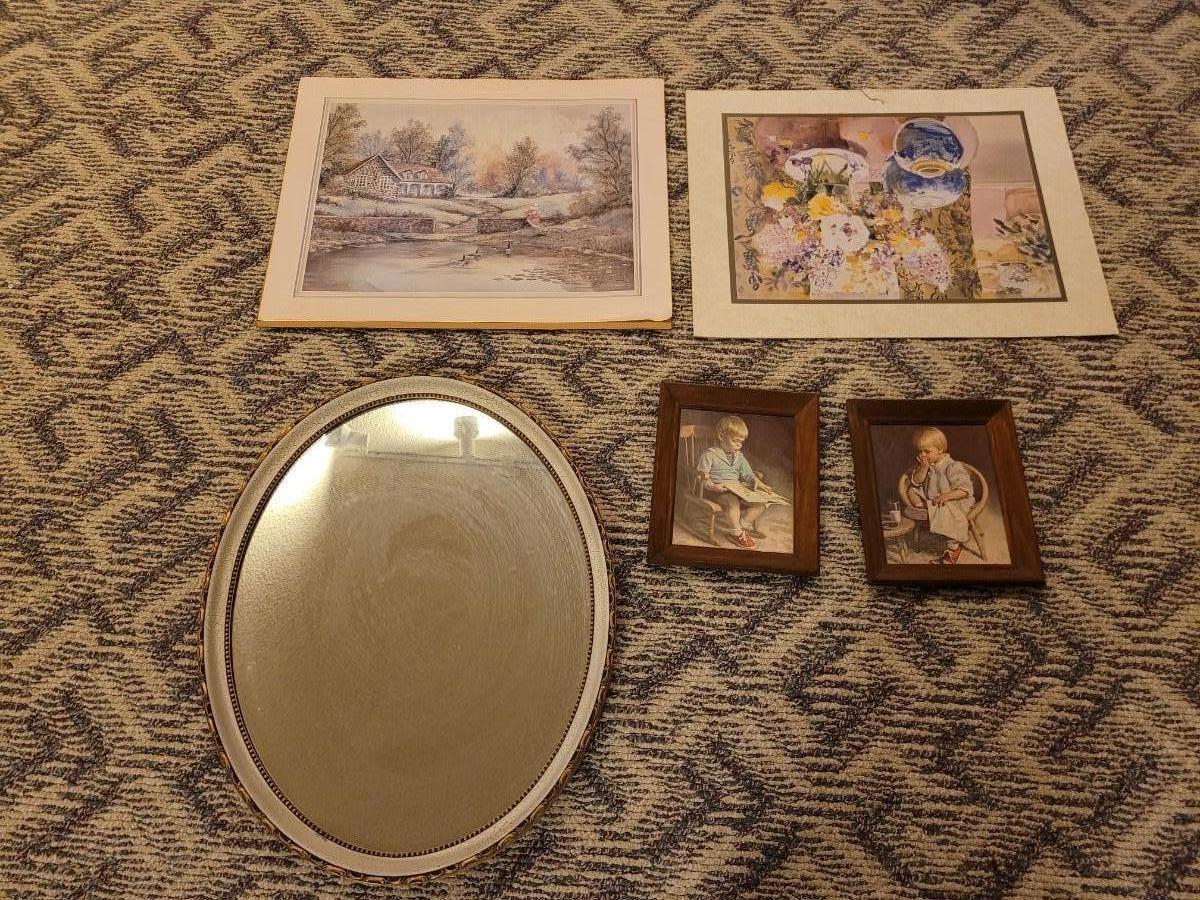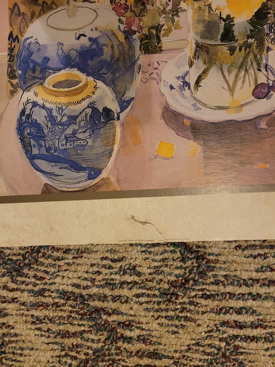 As pictured, top two pieces have no frame but have a backing. Top right piece has a tear that shoild be covvered by the matte. Downstairs living room,
