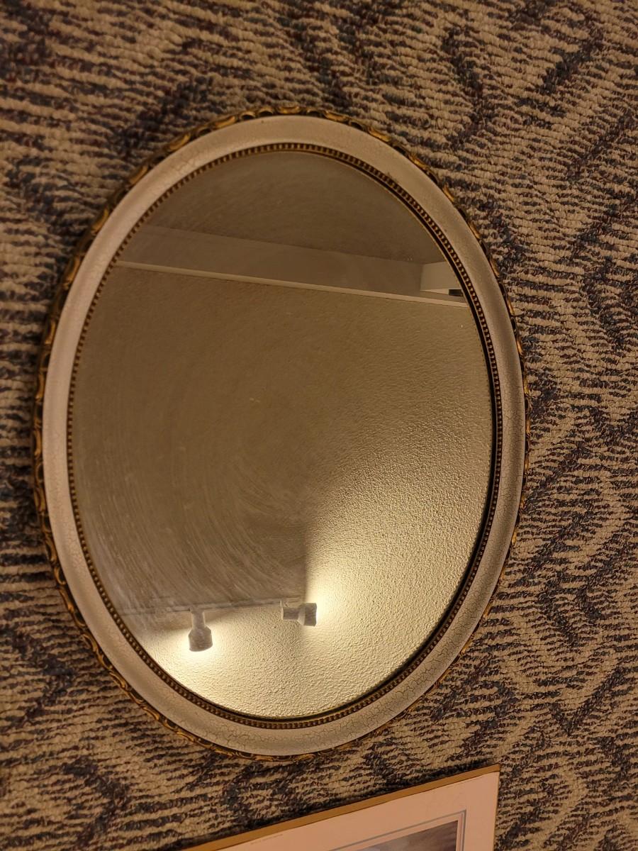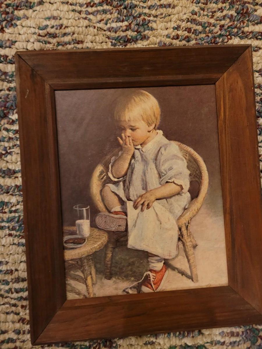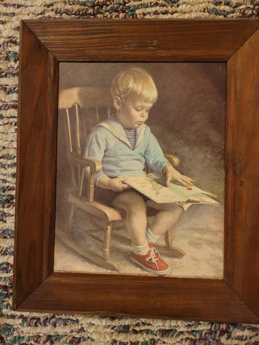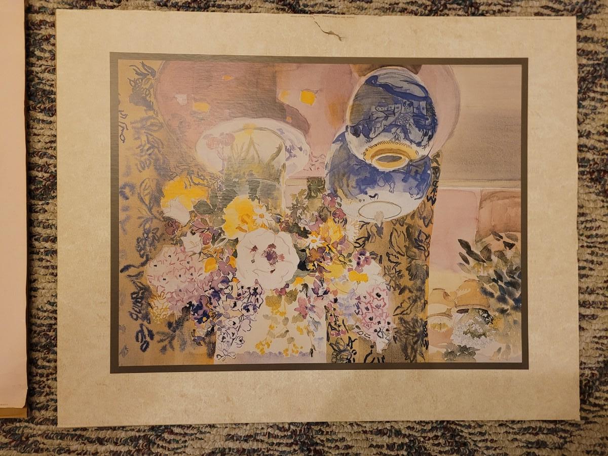 As pictured, top two pieces have no frame but have a backing. Top right piece has a tear that shoild be covvered by the matte. Downstairs living room,
