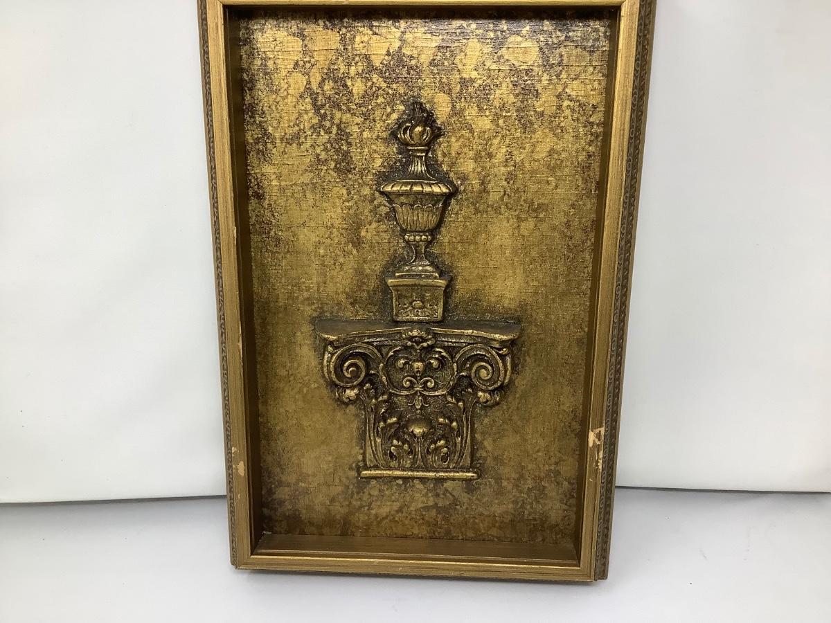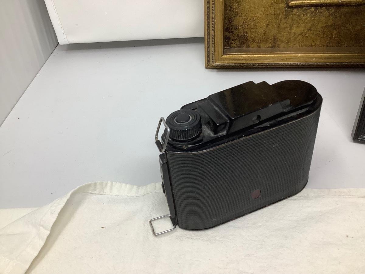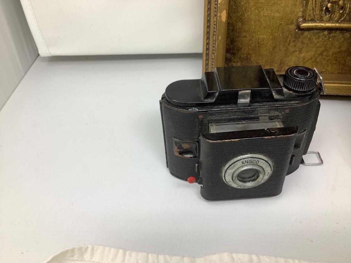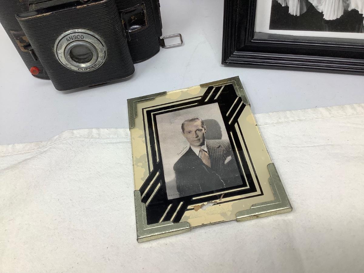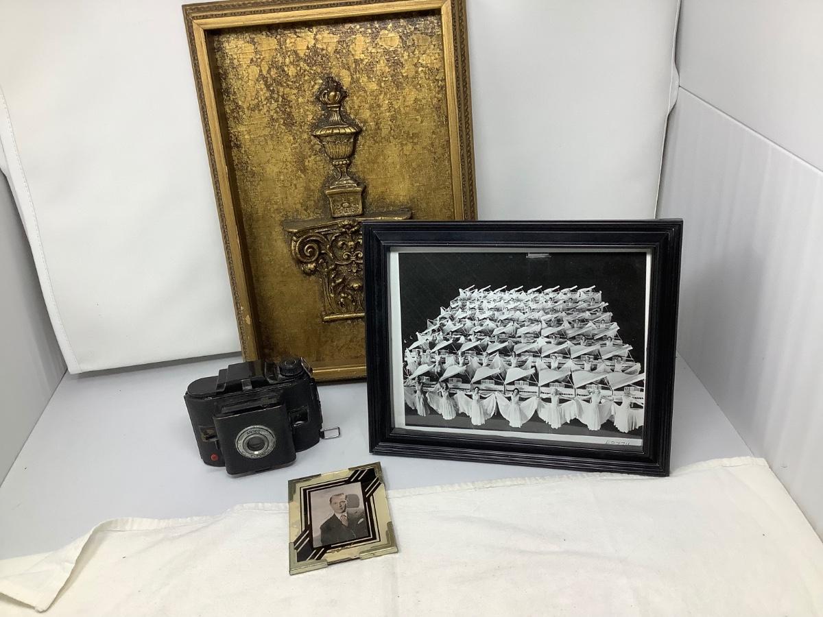 You get a vintage Ansco camera, Lady dance picture, young man vintage picture, and Gold wall hanging decoration.