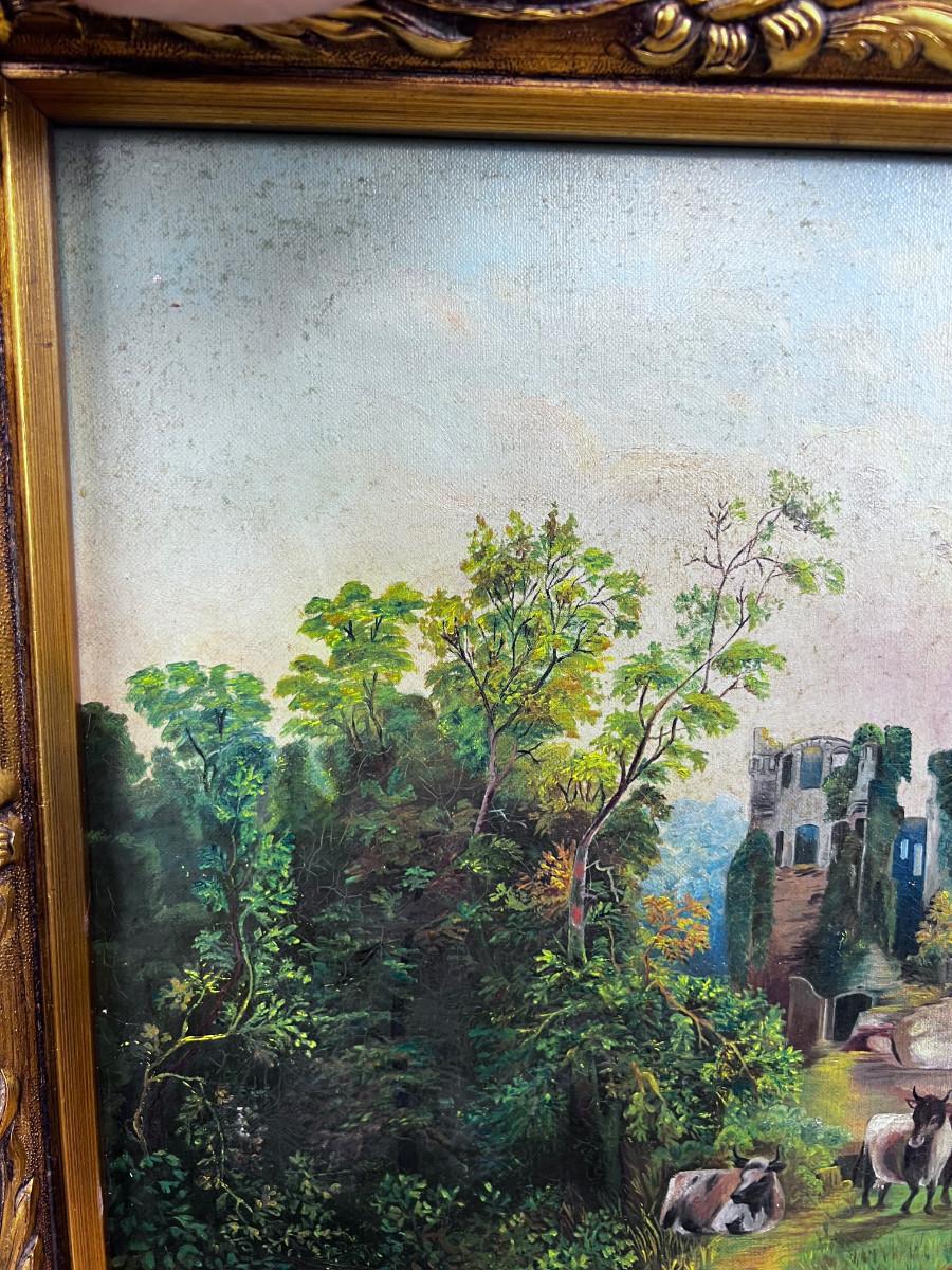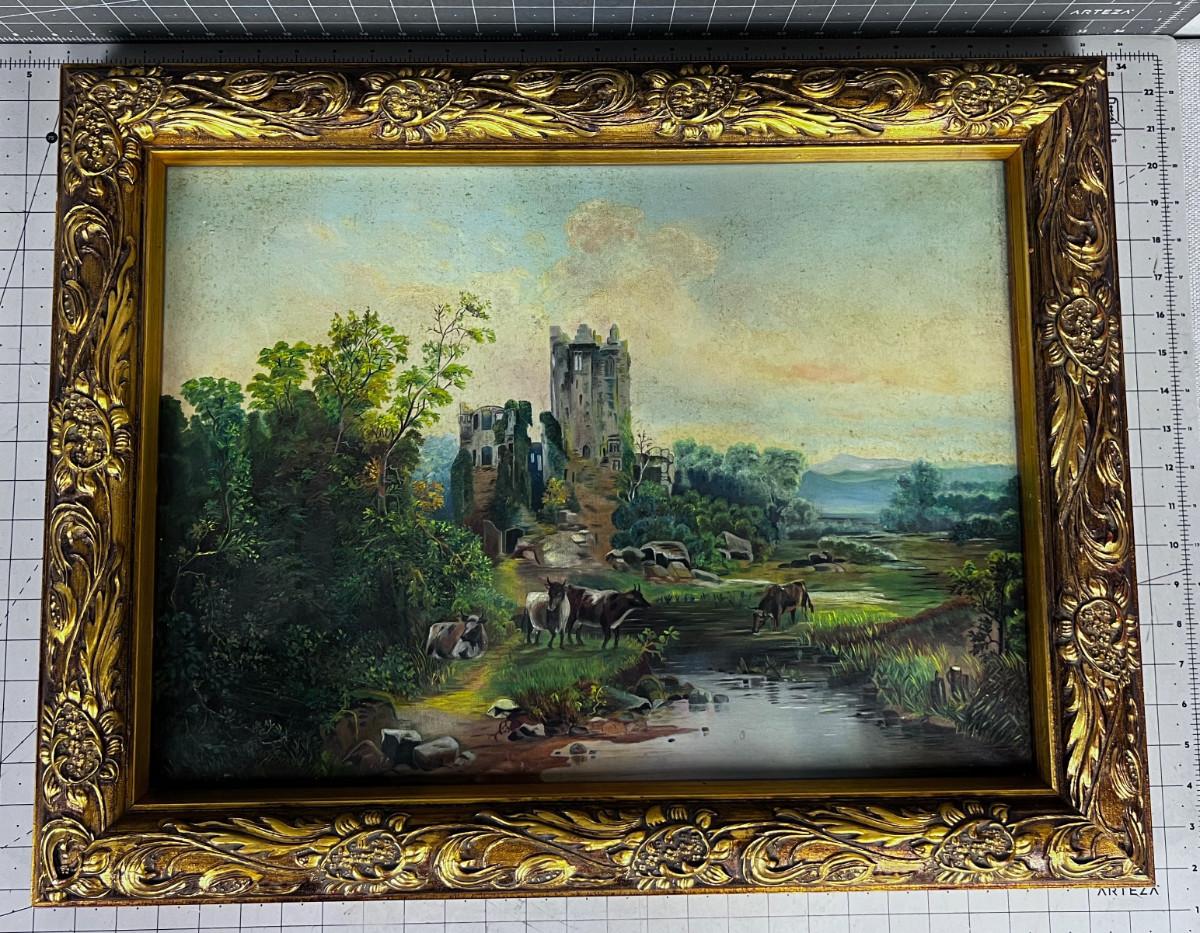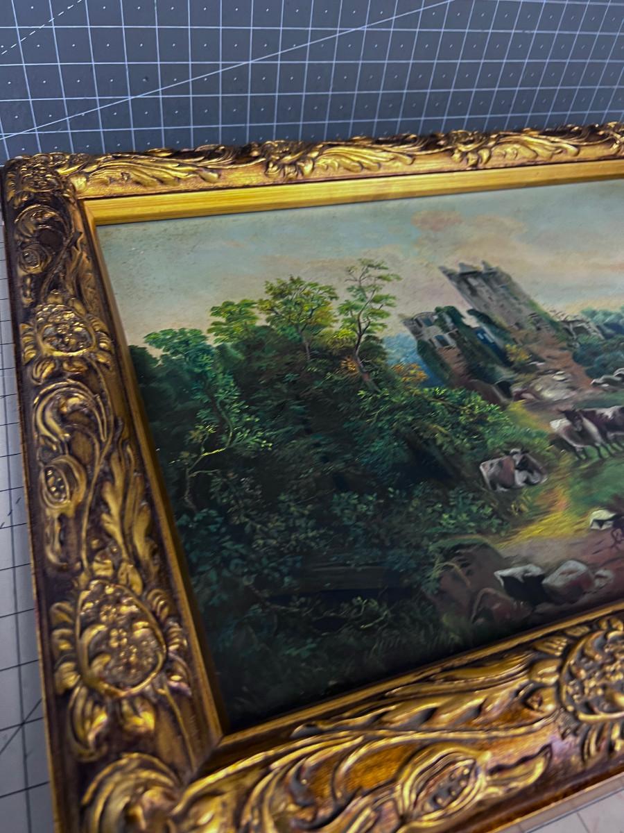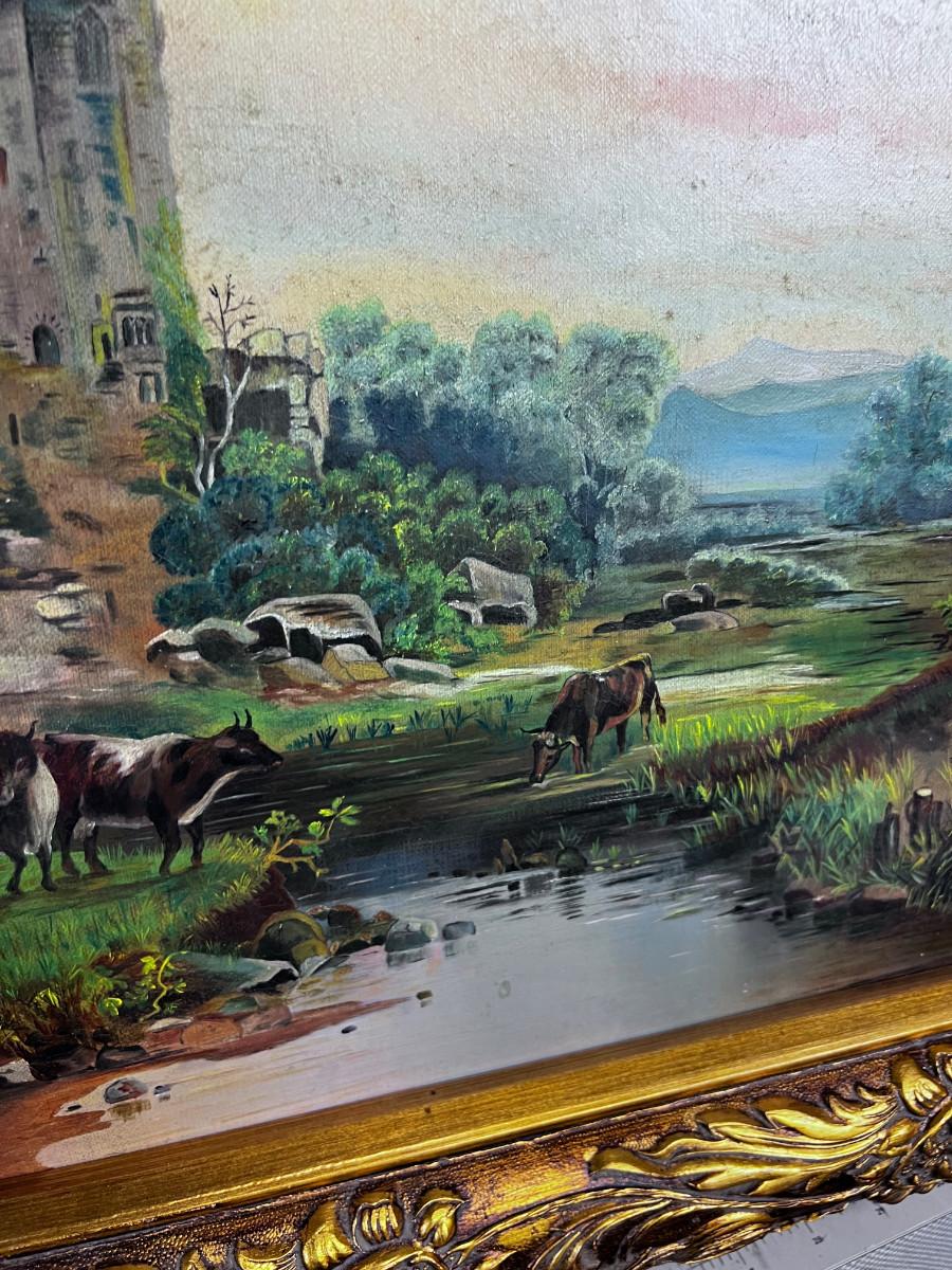 Picturesque! Antique European Oil on Canvas Painting, Castle and Cows