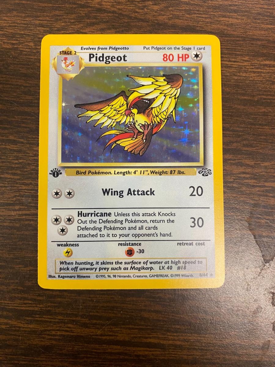 Pidgeot Pokemon card with 80 HP, identified as 1st Edition from the Base Set. The card features Wing Attack (20 damage) and Hurricane (30 damage). Condition noted as light play with some wear consistent with light usage. Refer to images for exact condition details.