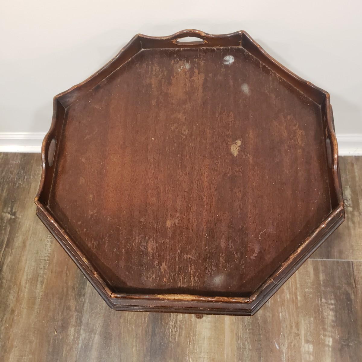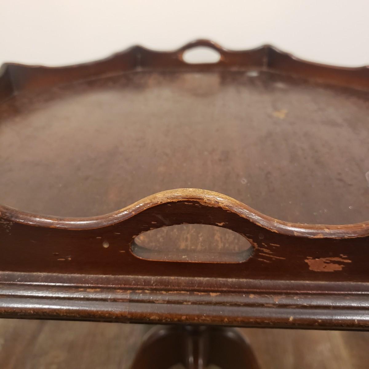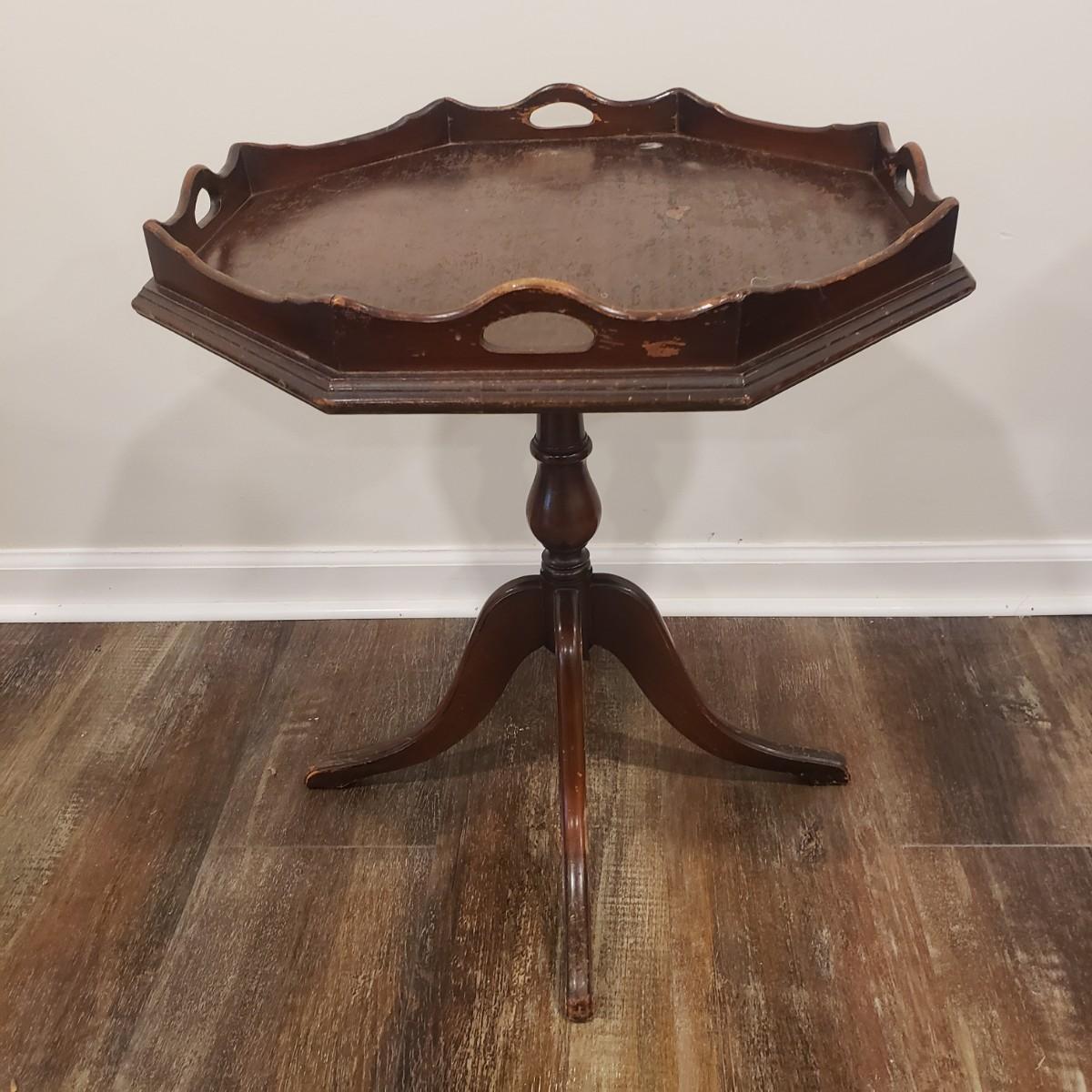 This adorable side table has a scalloped lip and handles on top. The table stands on a four leg pedestal base. The finish has blemishes, yet adds to it's charm. The table measures 20" x 22"H.