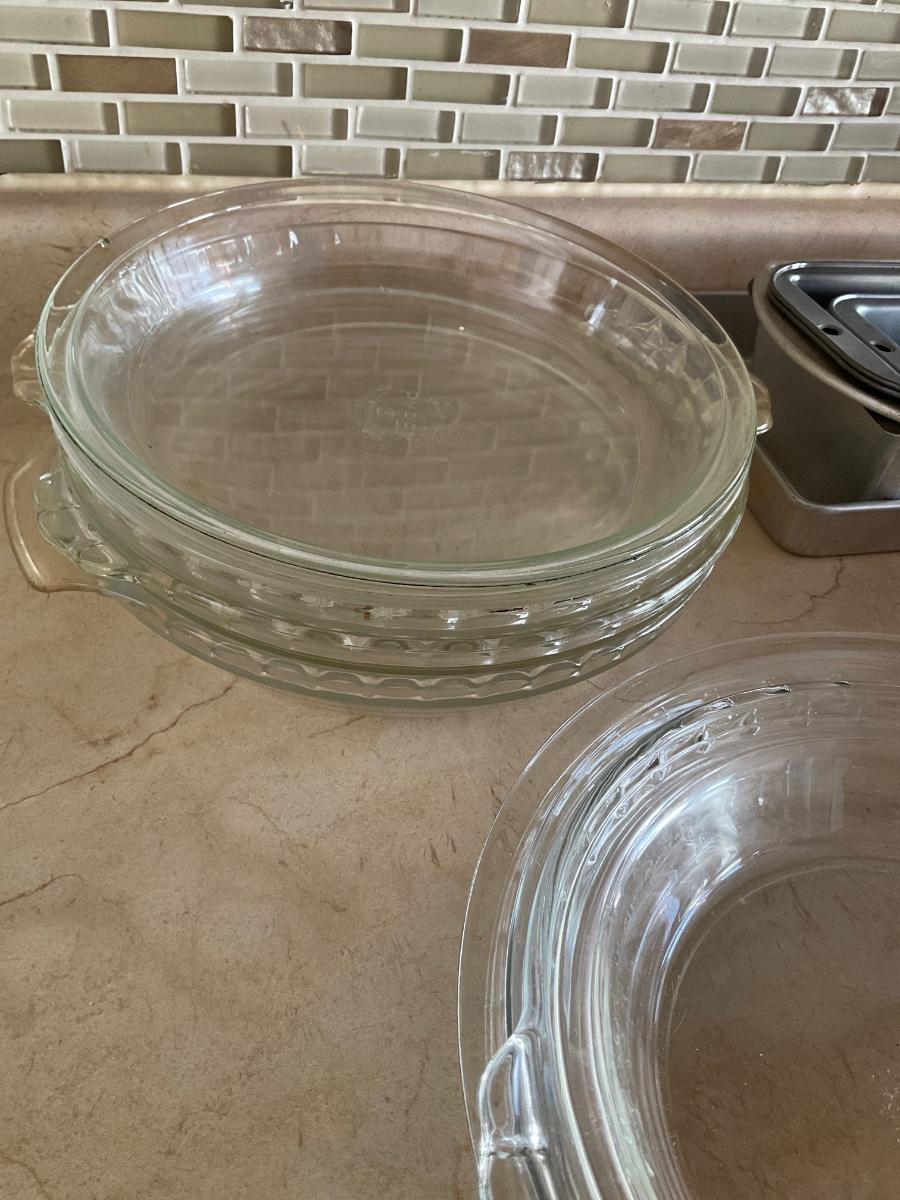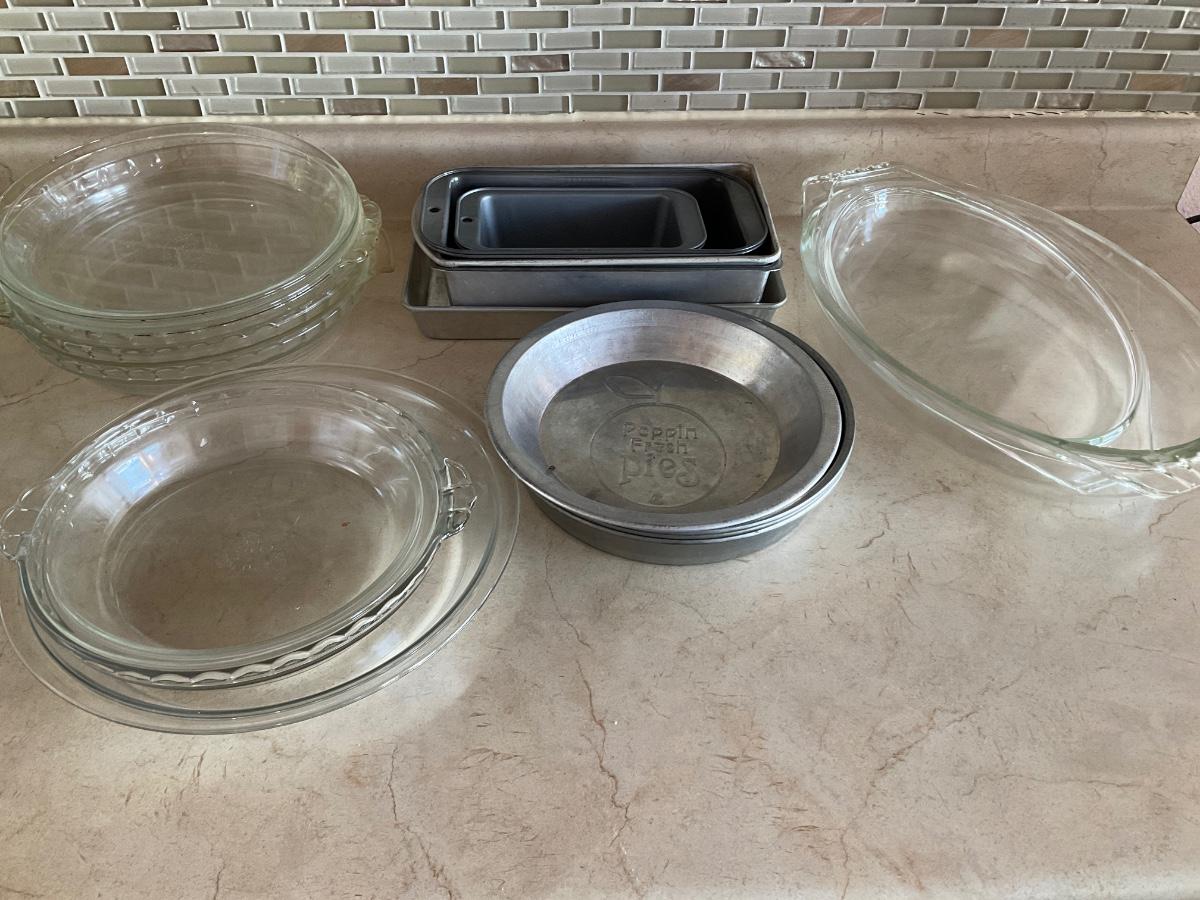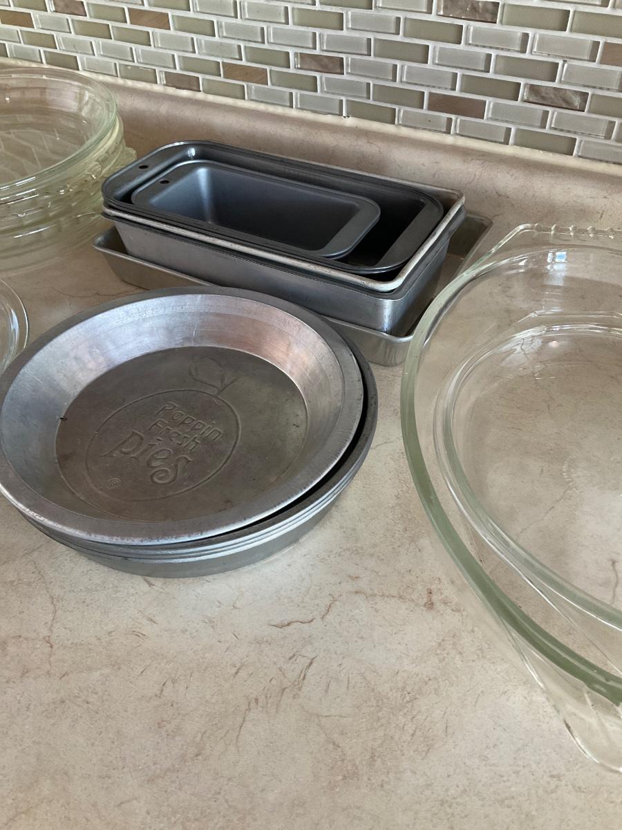 Multiple pot pie plates, loaf tins and one casserole dish