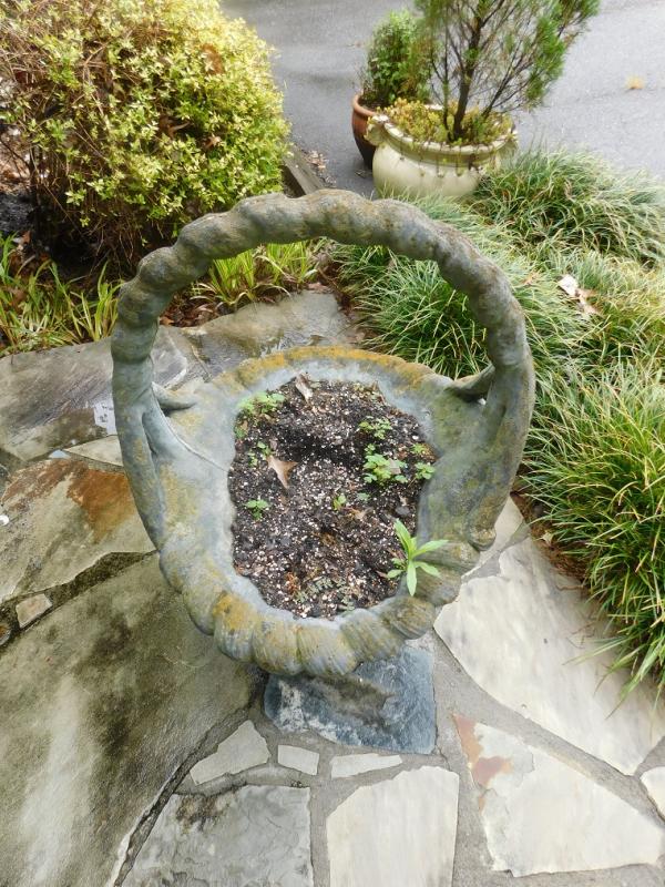 Piece 1 of 3 Large Concrete Basket needs cleaning, has weathering, and may have chips or cracks.