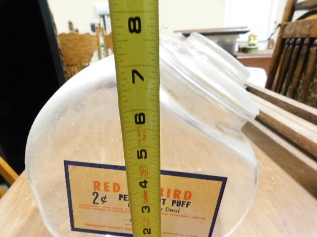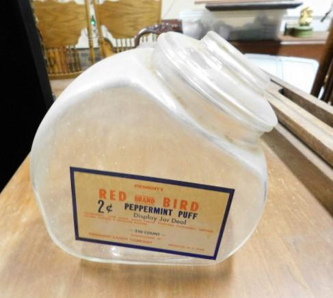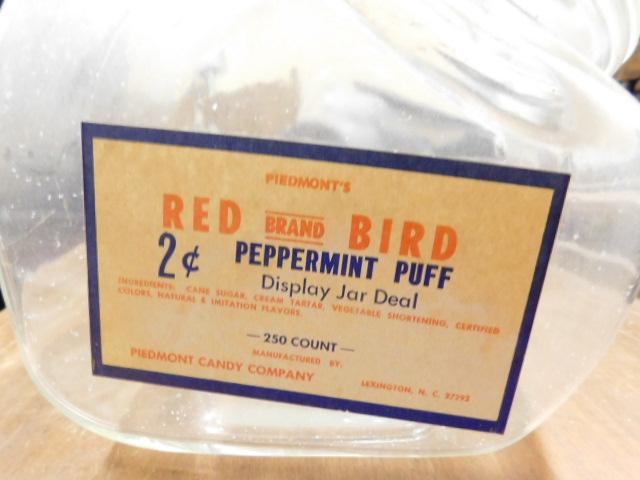 Piedmont Candy Company Display Jar Red Bird 2 Cent Peppermint Puff Label