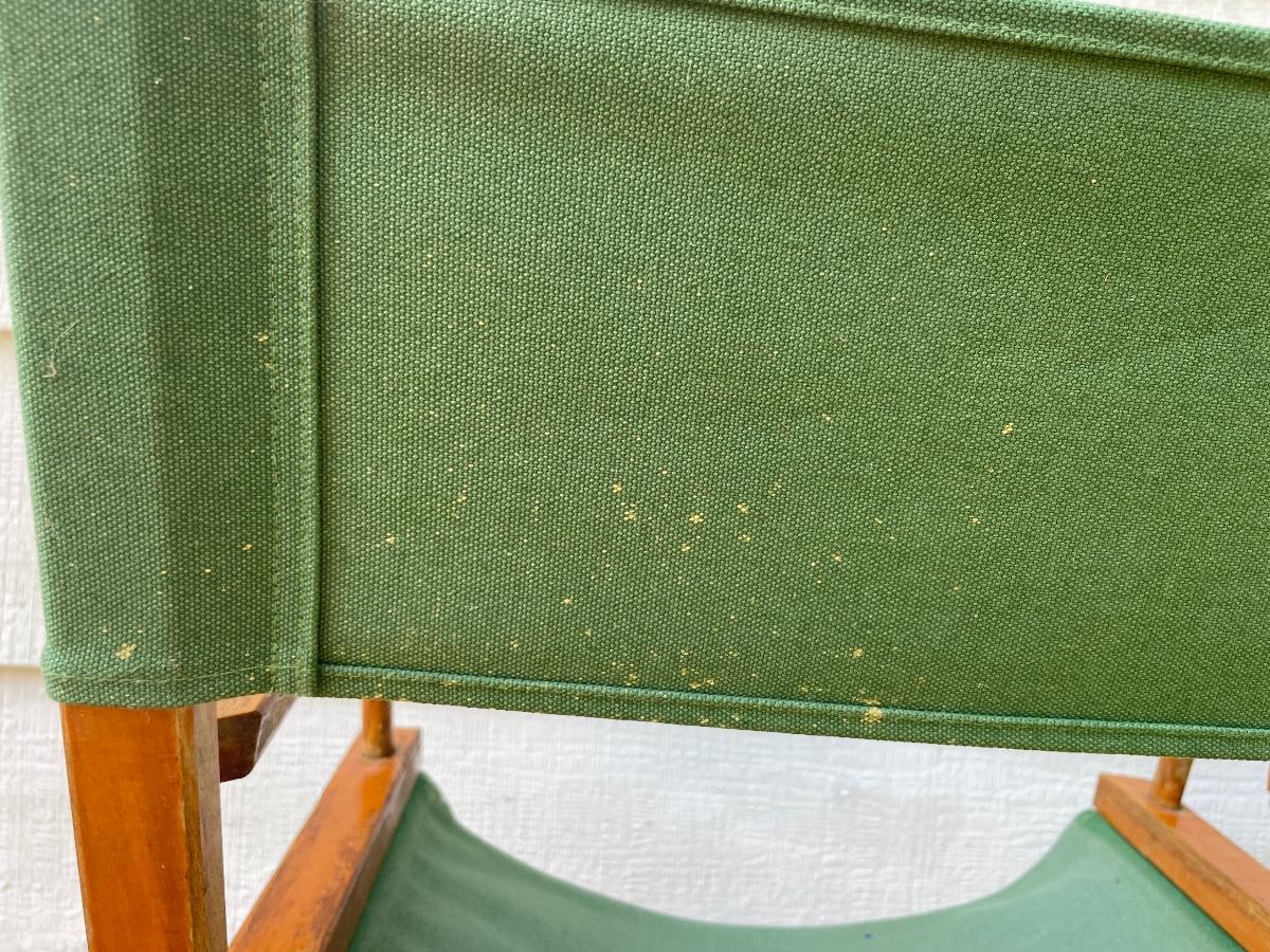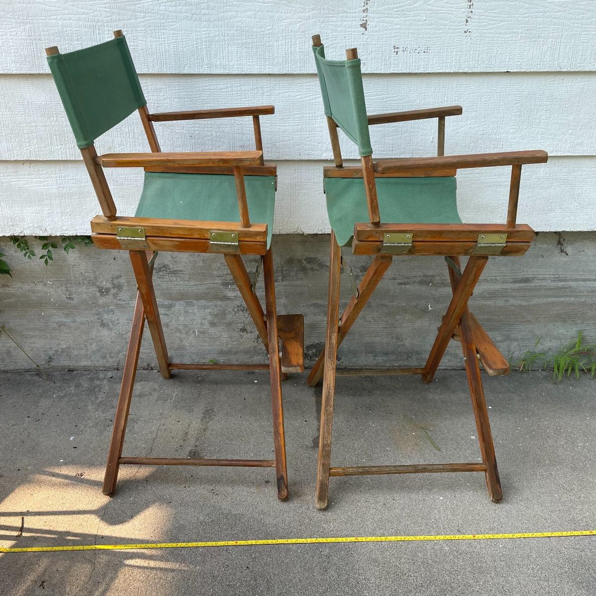 The finish on the wood does have wear all over both. No rips or holes found in fabric, however the poles in the seat fabric that keep them in the grooves seem to be broken/missing - easily fixable with a small wooden dowel. (Seat fabric still stays in place when open). There are also some yellow spots on the back of the fabric on one chair, as shown. Approx 15” deep, seat sits approx 27-28” off the ground, back is approx 46” tall.
