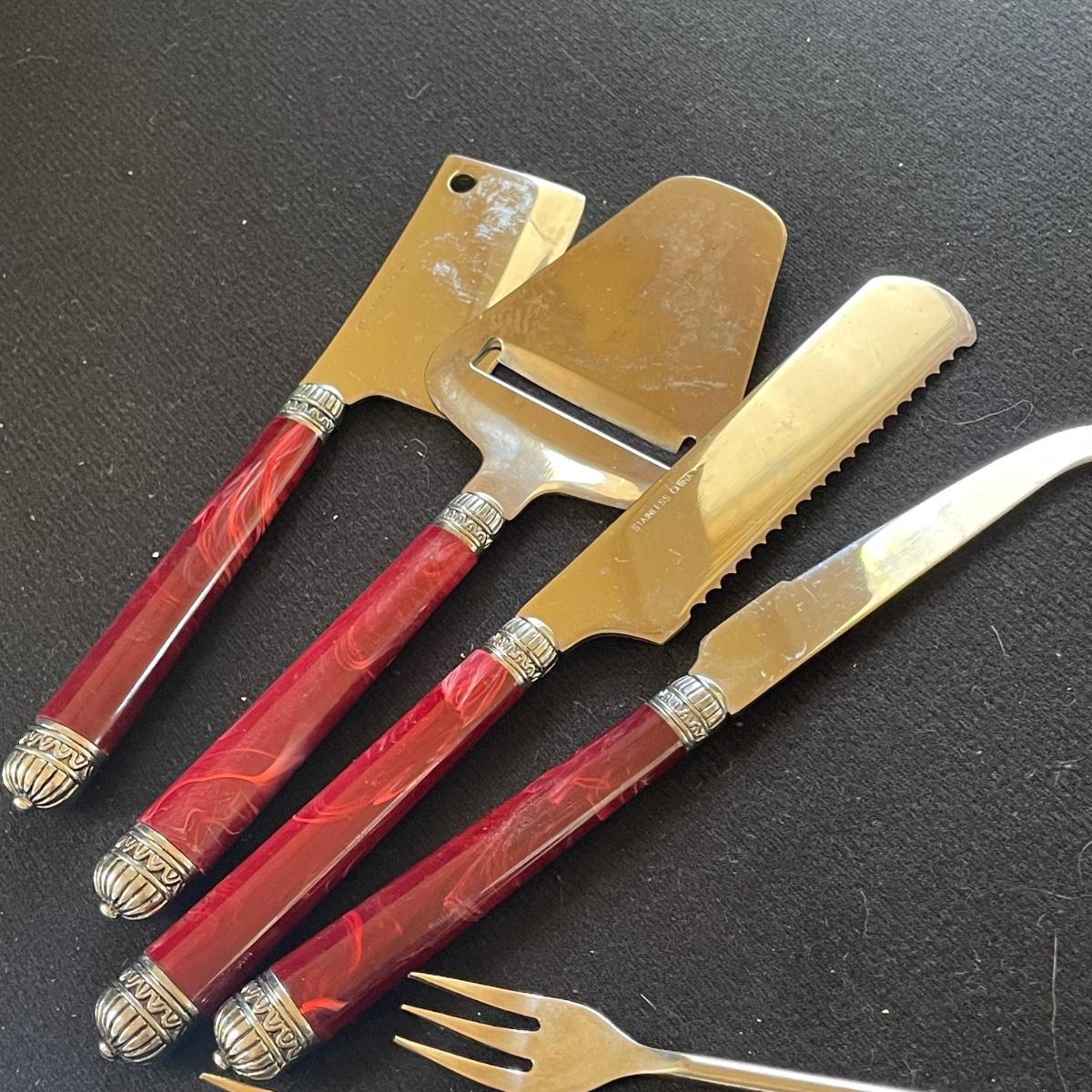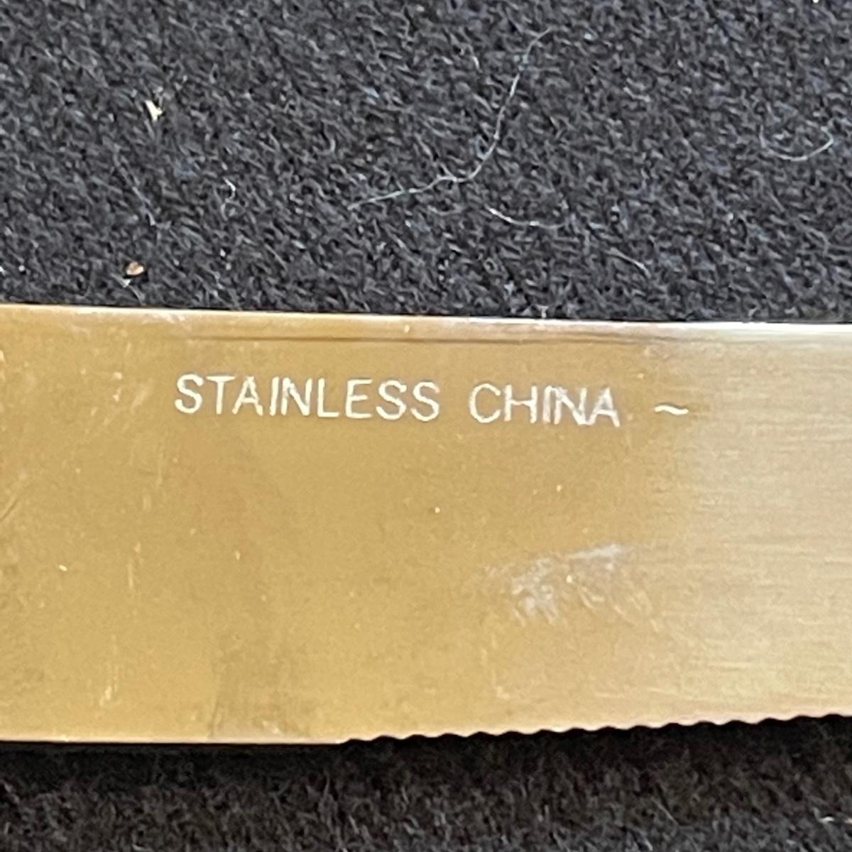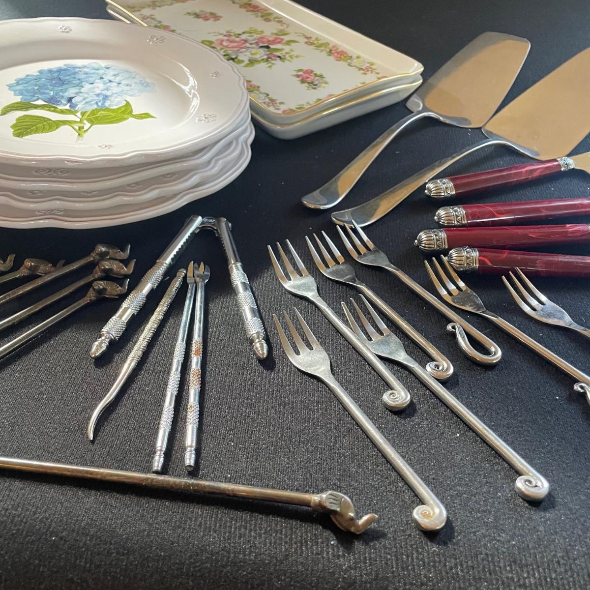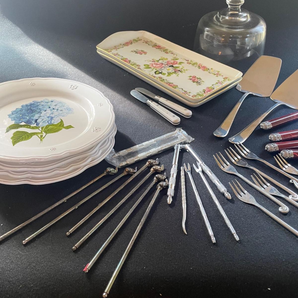 These 4 floral plates from Pier 1 Imports are ceramic. Lot also includes 2 floral China serving platters, a glass cheese dome, metal desert forks, cheese serving utensils and more. Marks found are shown in photos. The elephant metal sticks appear to be cocktail stirrers. Items are in good condition with just some minor scratches in the stainless.