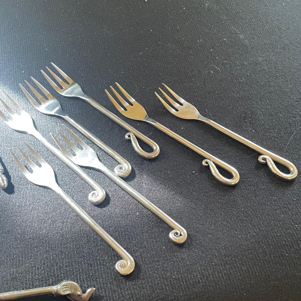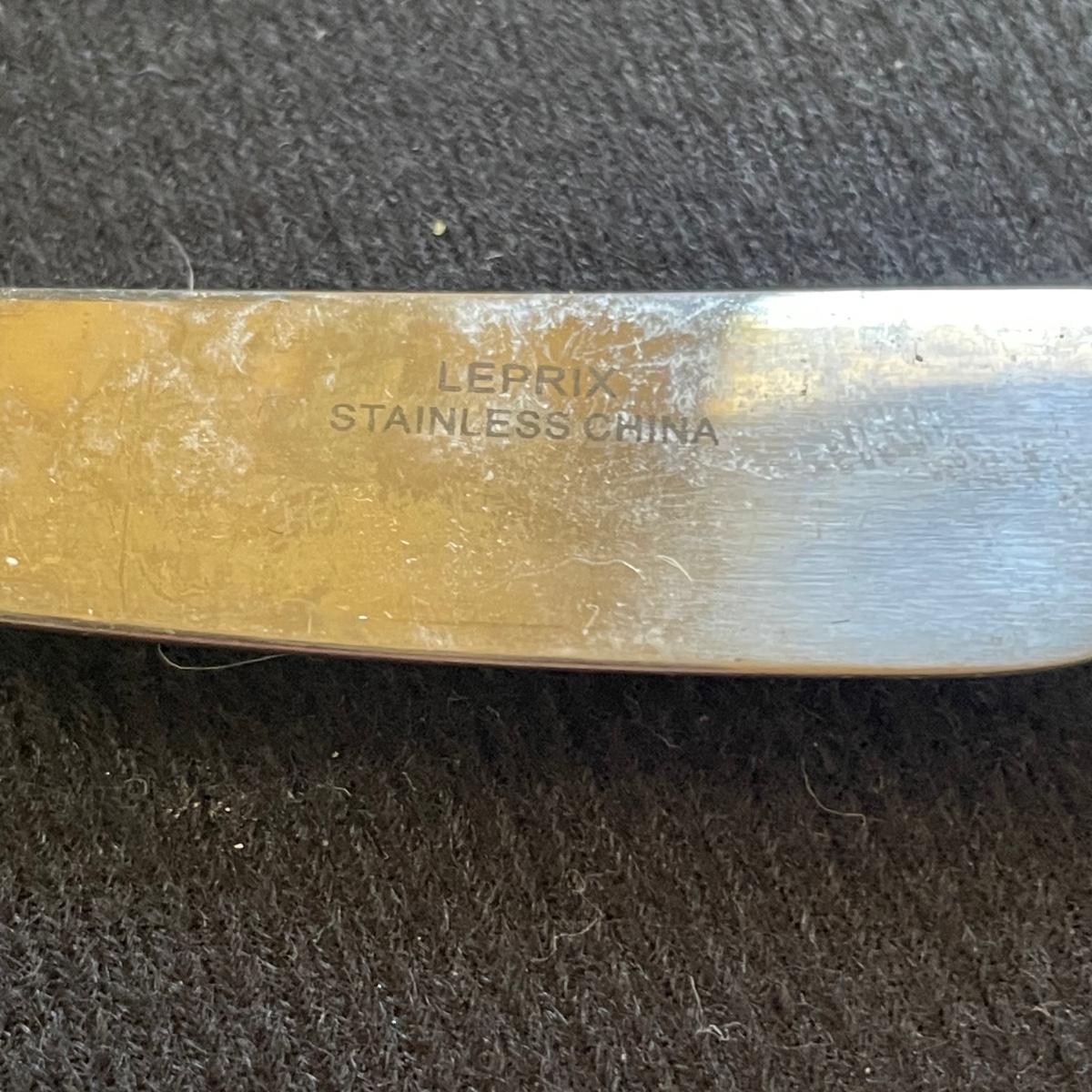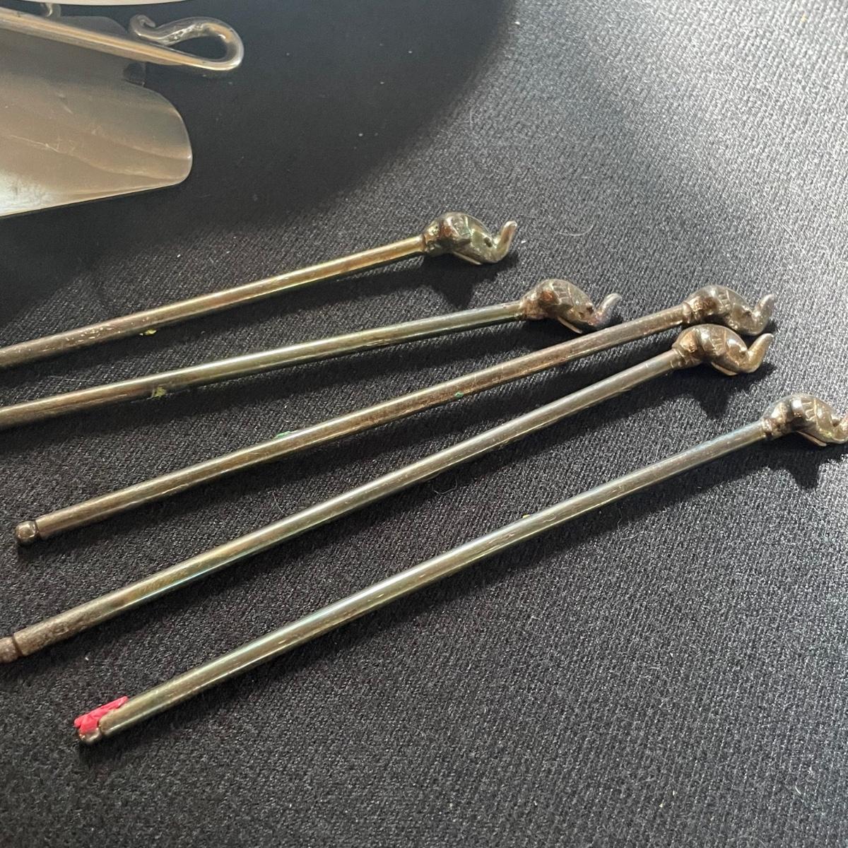 These 4 floral plates from Pier 1 Imports are ceramic. Lot also includes 2 floral China serving platters, a glass cheese dome, metal desert forks, cheese serving utensils and more. Marks found are shown in photos. The elephant metal sticks appear to be cocktail stirrers. Items are in good condition with just some minor scratches in the stainless.