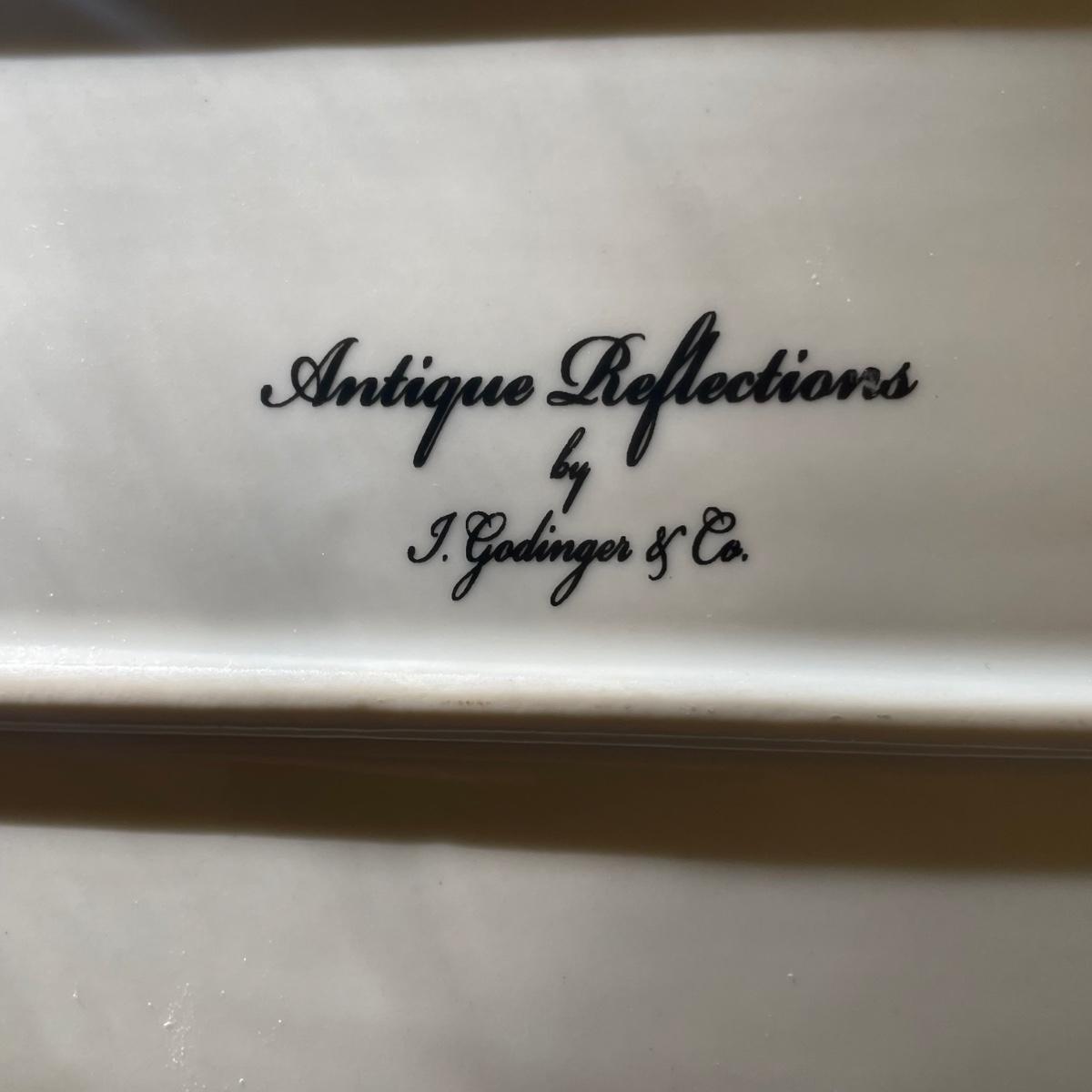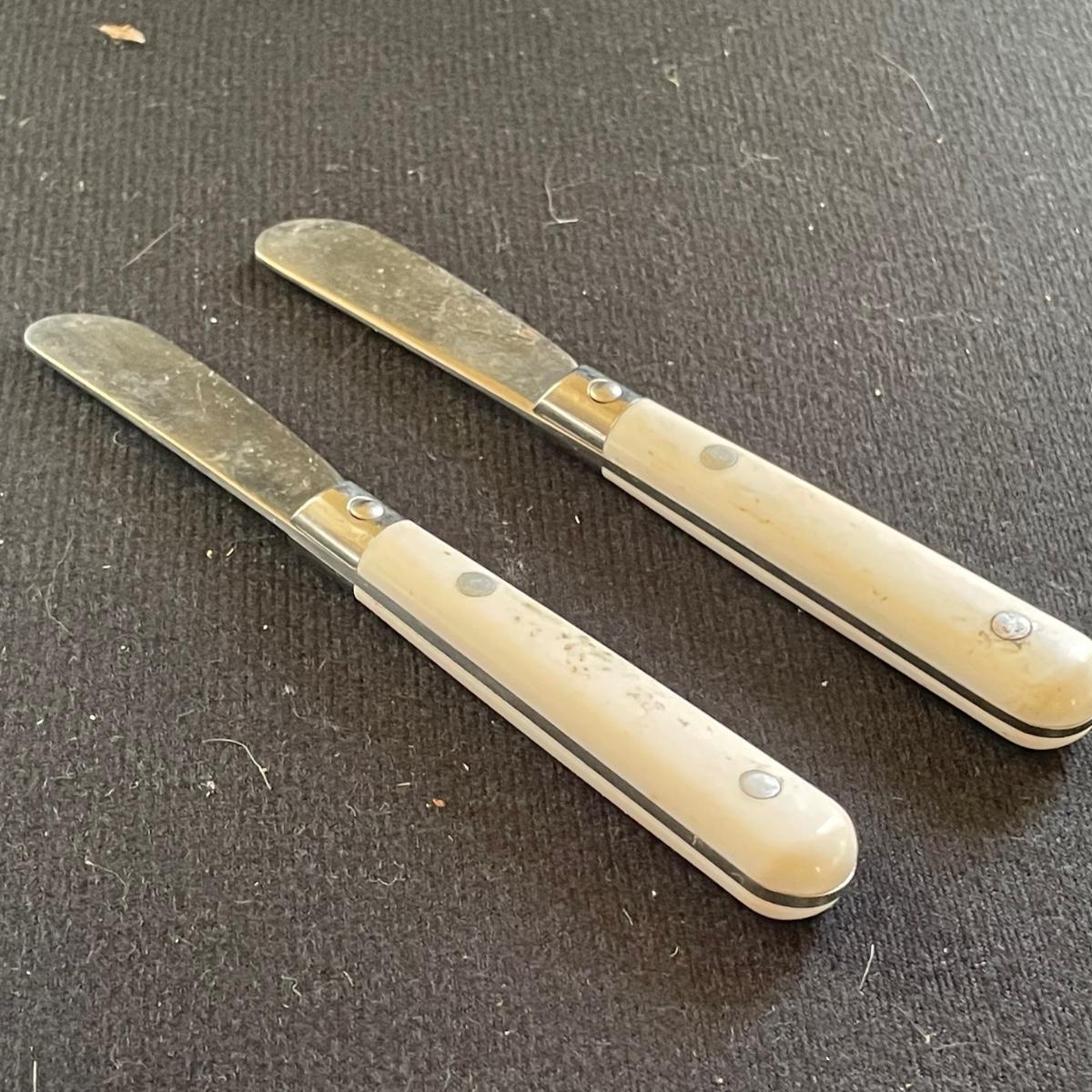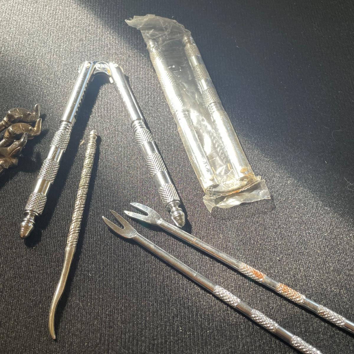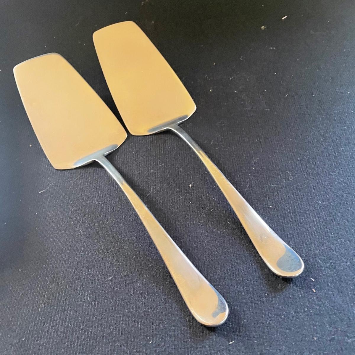 These 4 floral plates from Pier 1 Imports are ceramic. Lot also includes 2 floral China serving platters, a glass cheese dome, metal desert forks, cheese serving utensils and more. Marks found are shown in photos. The elephant metal sticks appear to be cocktail stirrers. Items are in good condition with just some minor scratches in the stainless.