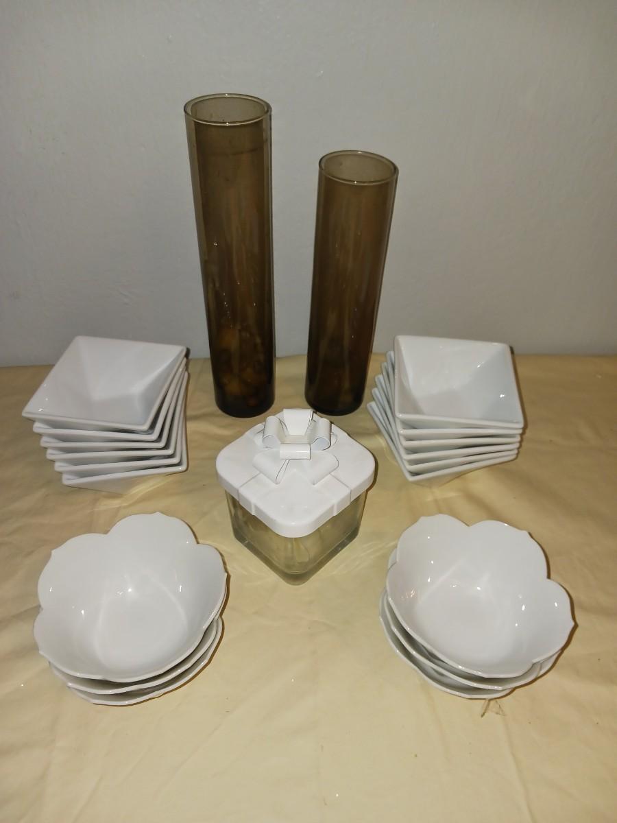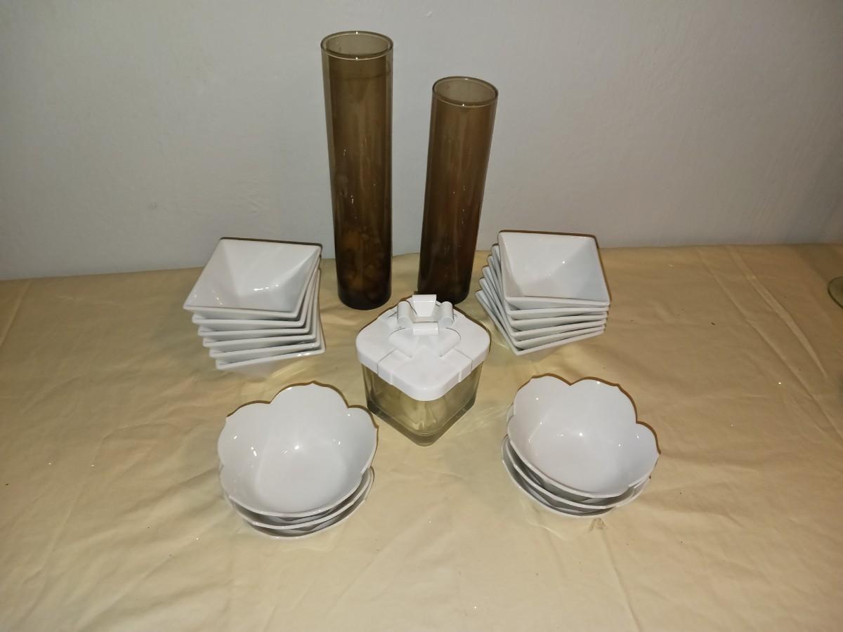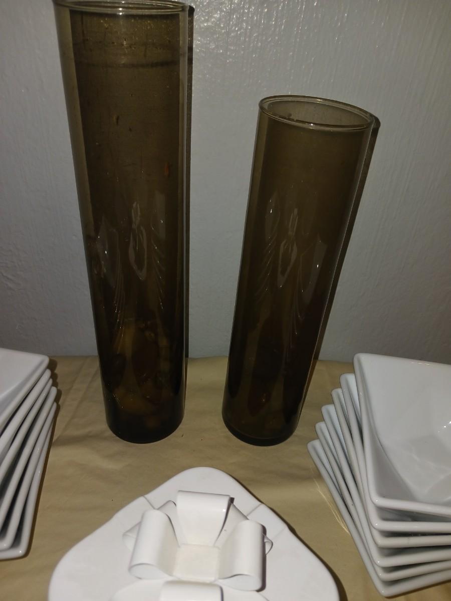 PIER 1 IMPORTS AND LOTUS SHAPED BOWLS, 2 SMOKE GLASS VASES