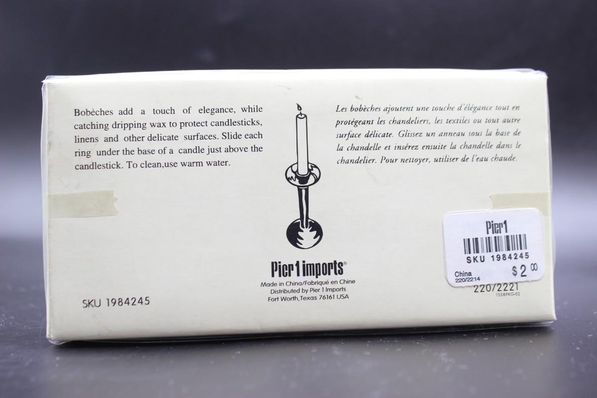 Pier 1 Imports Bobeches Clear Glass Wax Catcher, there are no cracks or chips to the glass and is in good useable condition. Comes with original packaging, check pictures for more details and for sizing.
