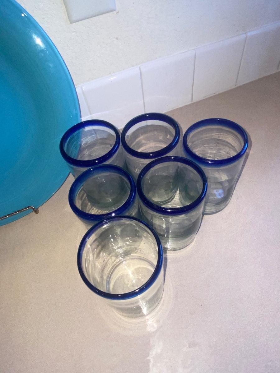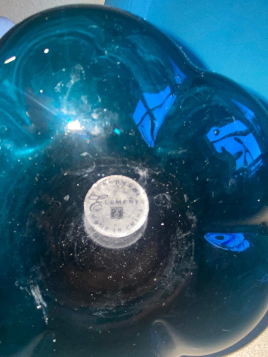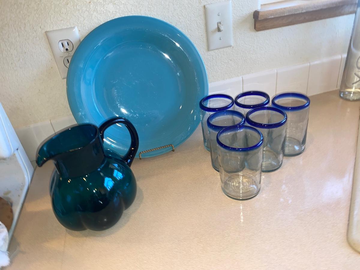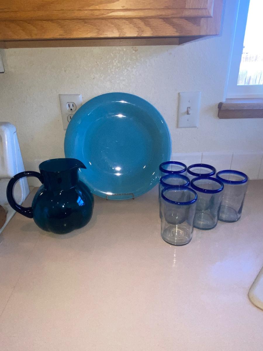 PIER 1 IMPORTS DRINKING GLASSES, HAND CRAFTED TEAL GLASS PITCHER AND SERVING PLATTER