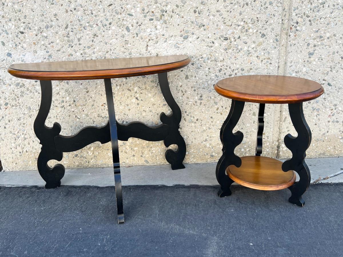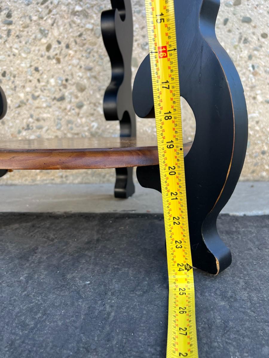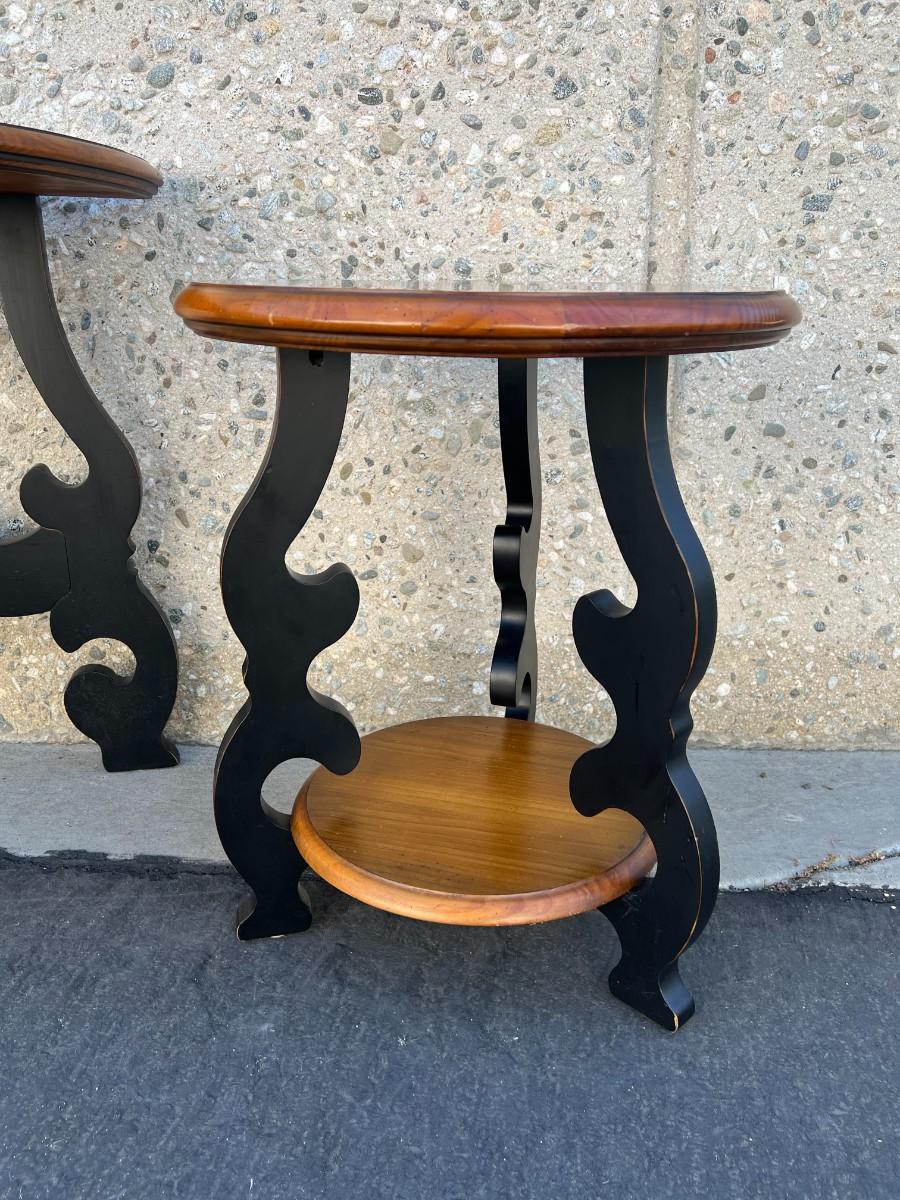 There is a crack to one of the legs of the largest end table, but there is no other significant damage and is in overall fair displayable condition. Check pictures for more details and for sizing.