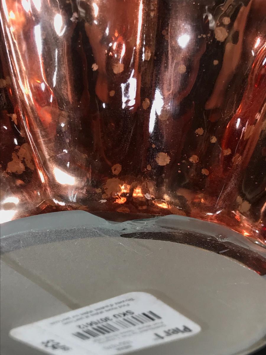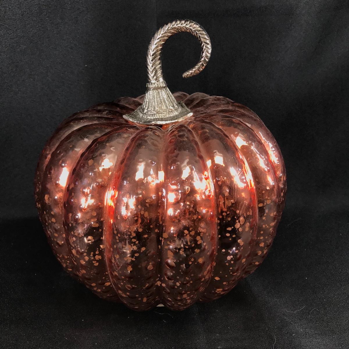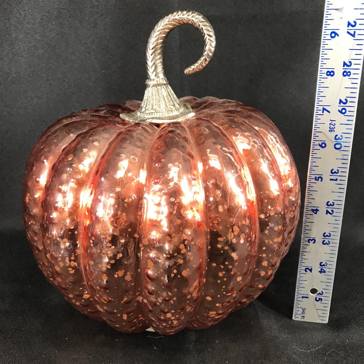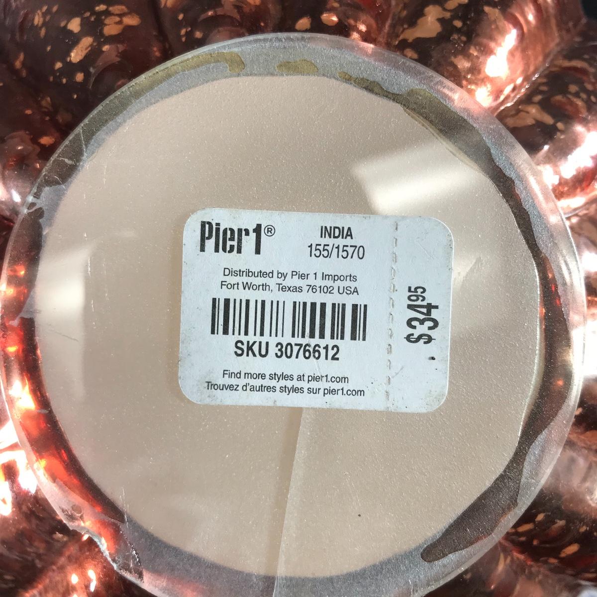 For auction is a Pier 1 Imports° Halloween Pumpkin Decor Piece. there is one small chip in the glass ring around the base; see pictures.