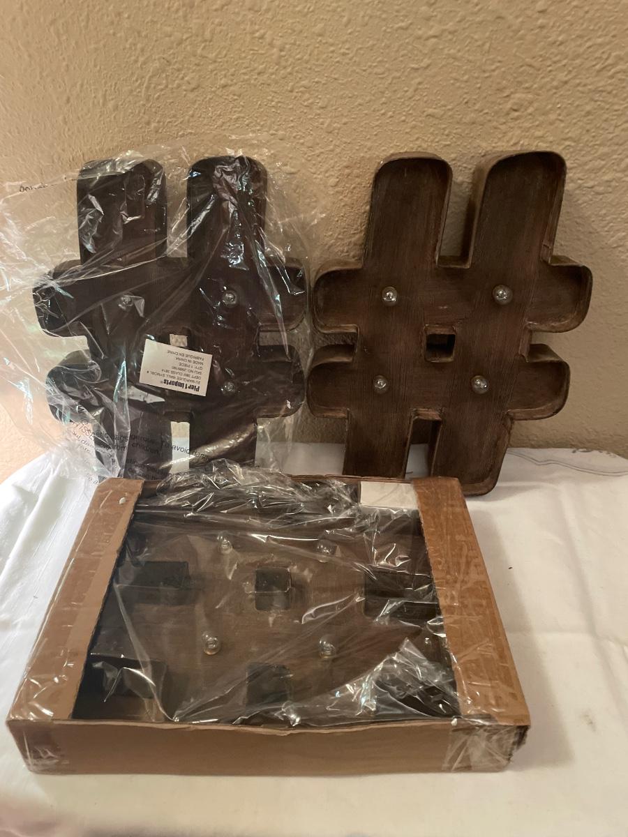 New in box includes 3. Requires 2 AA batteries and has extra lightbulbs. Pound sign or hashtag symbols.
