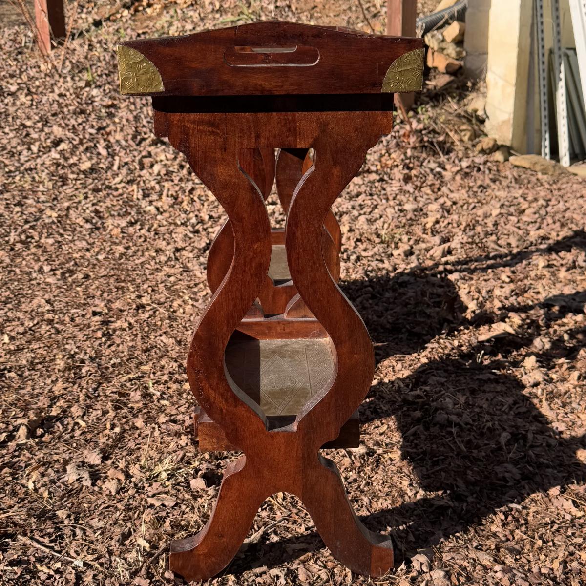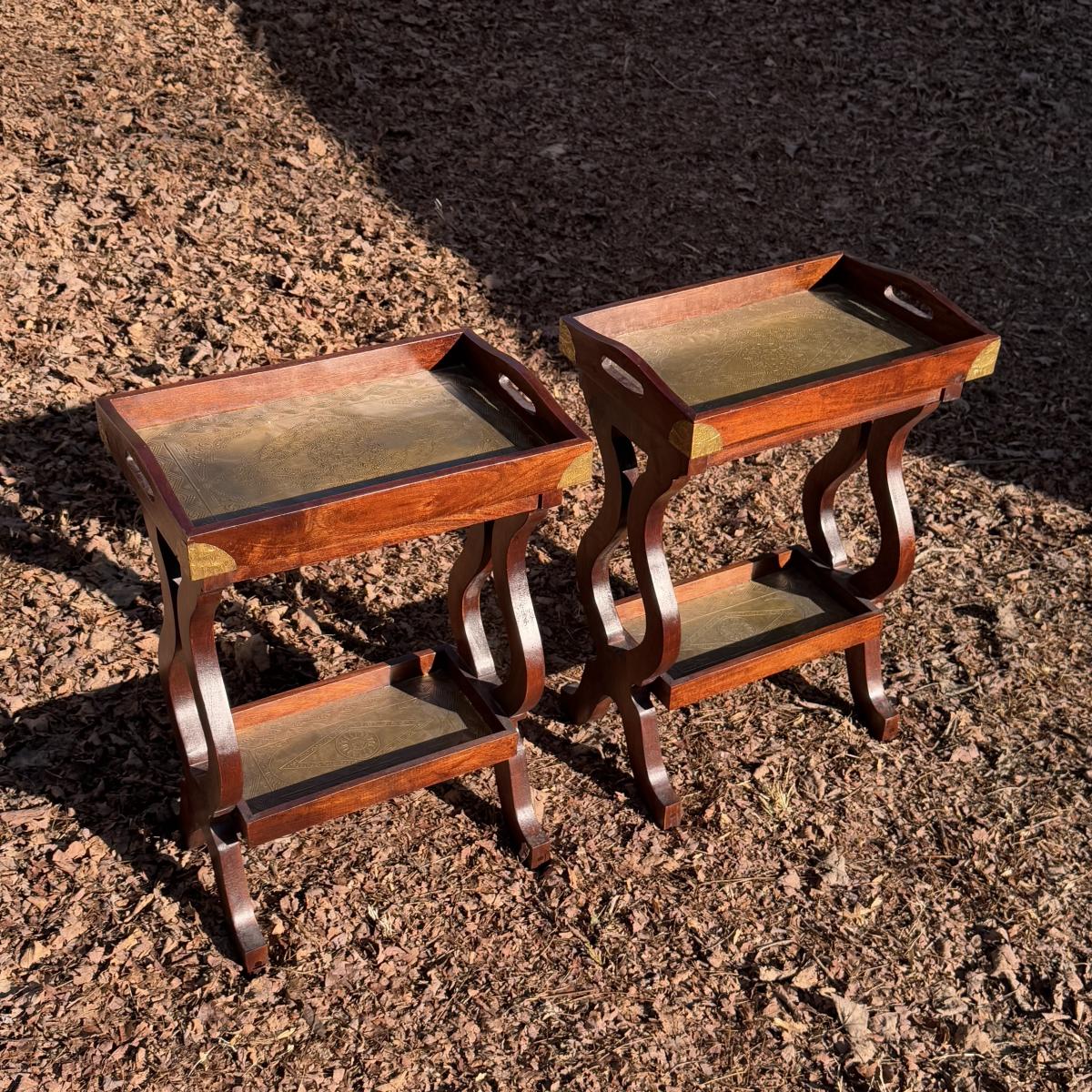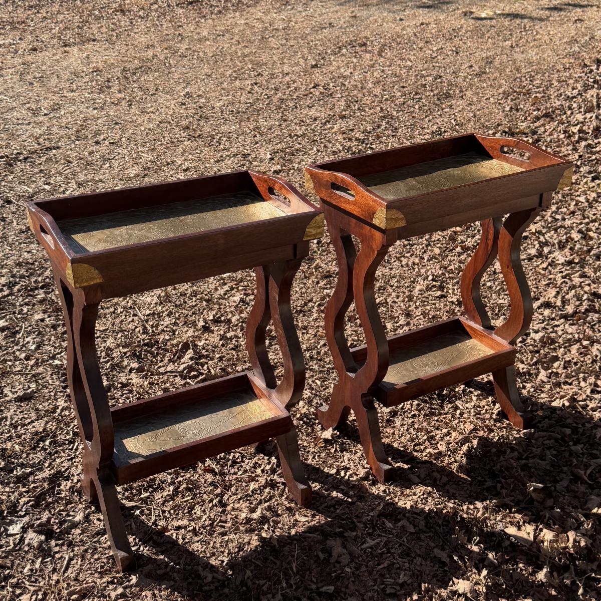 This lot includes two Pier 1 Imports sari tray end tables. They are made of wood with a dark finish and metal accents that appear to be brass. The tables individually measure 18” x 12” x 26”H. Local pickup only.