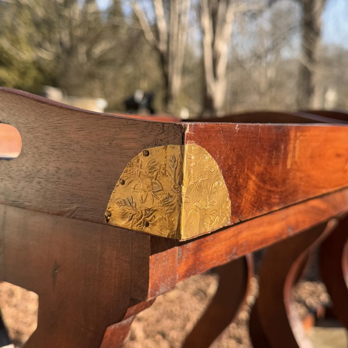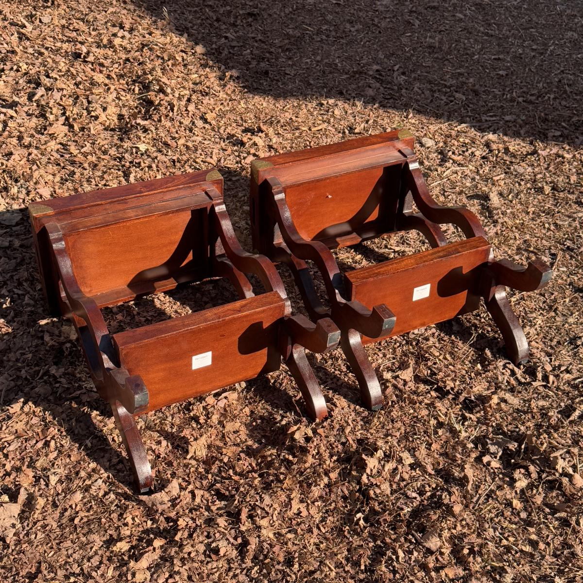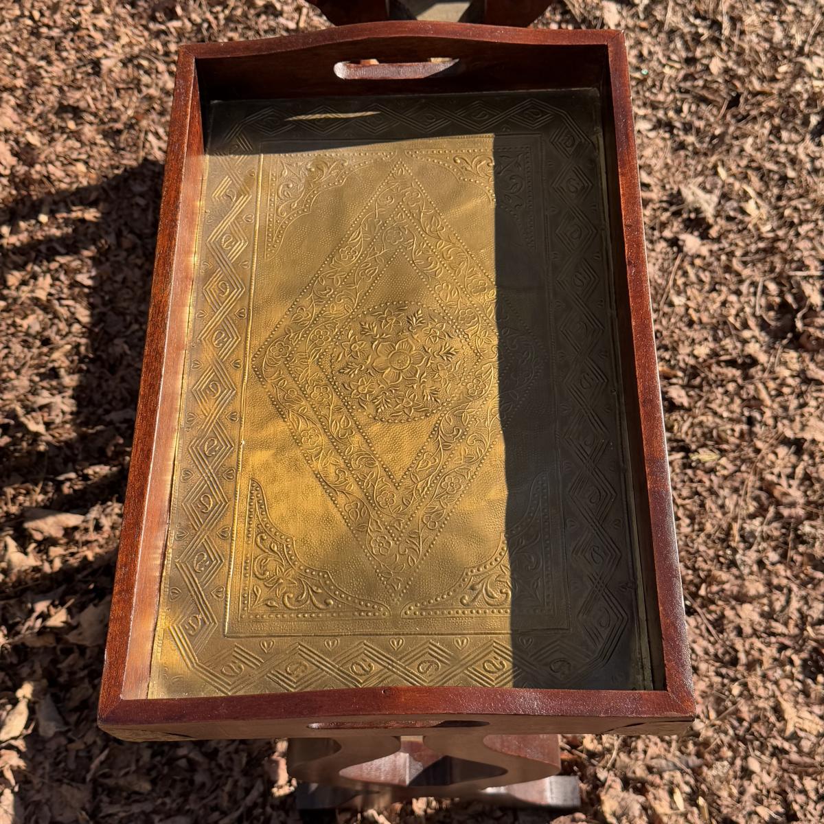 This lot includes two Pier 1 Imports sari tray end tables. They are made of wood with a dark finish and metal accents that appear to be brass. The tables individually measure 18” x 12” x 26”H. Local pickup only.