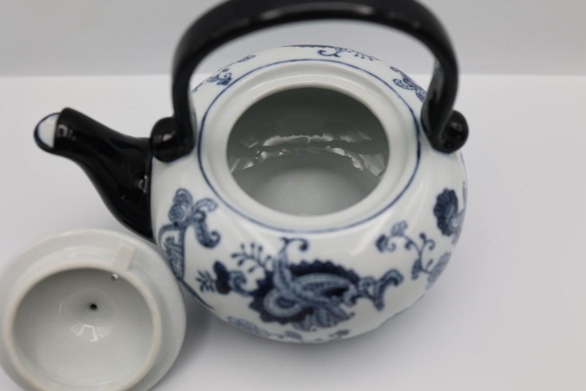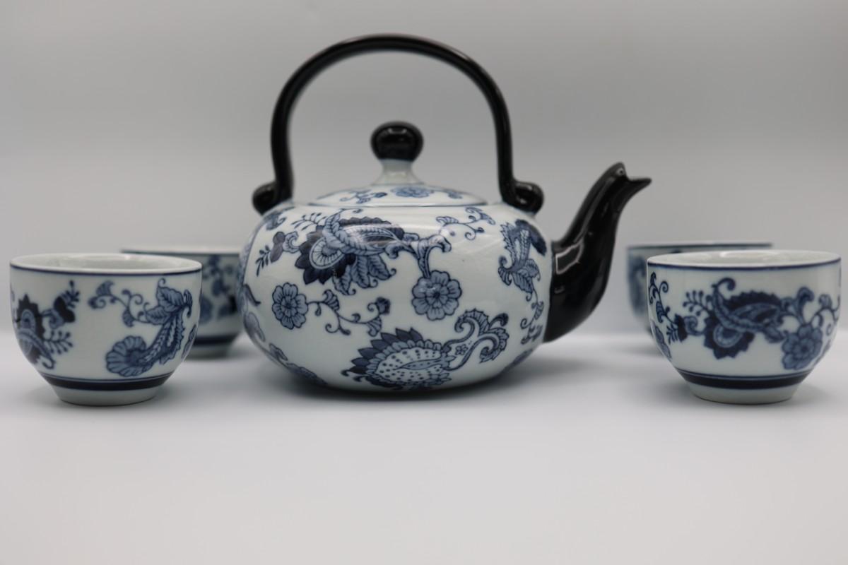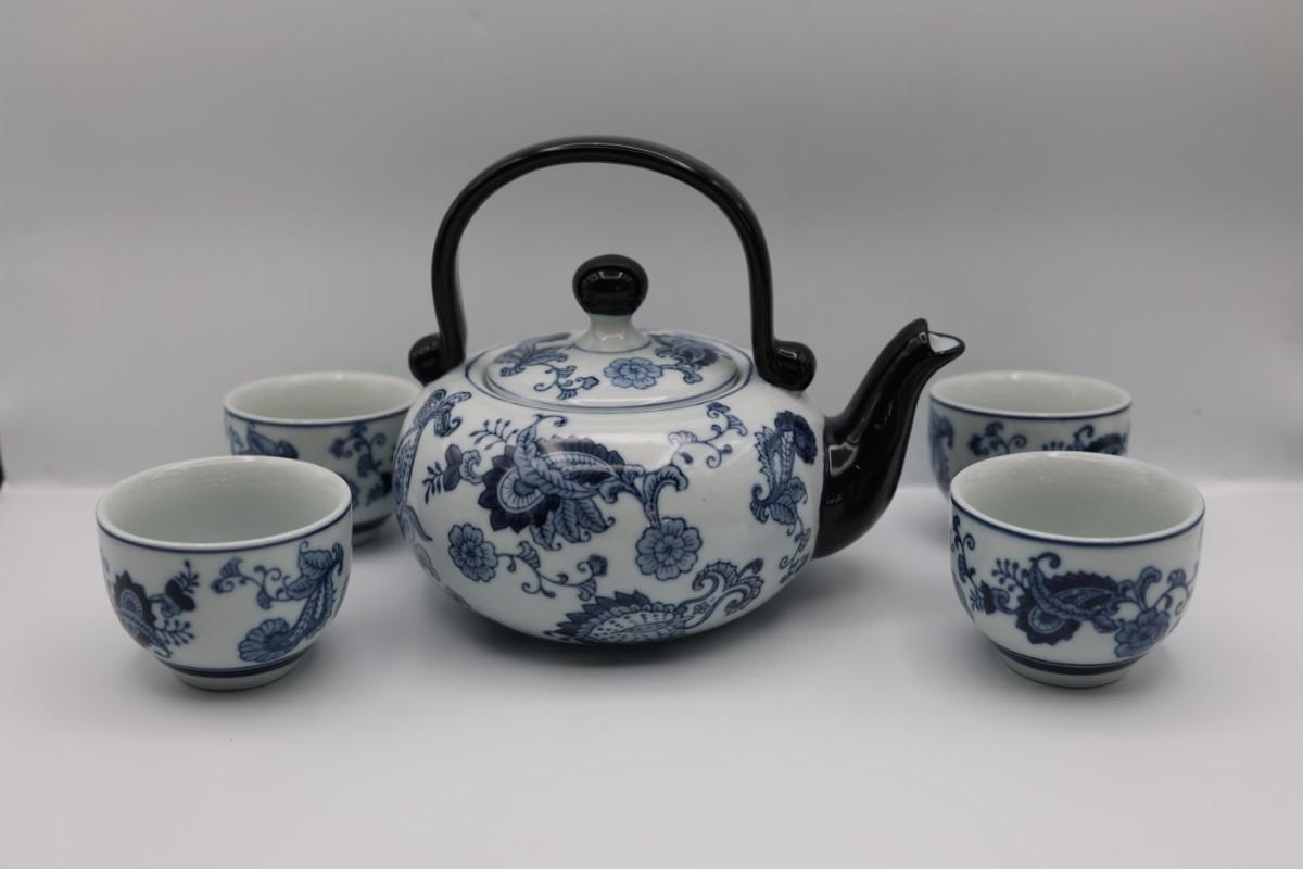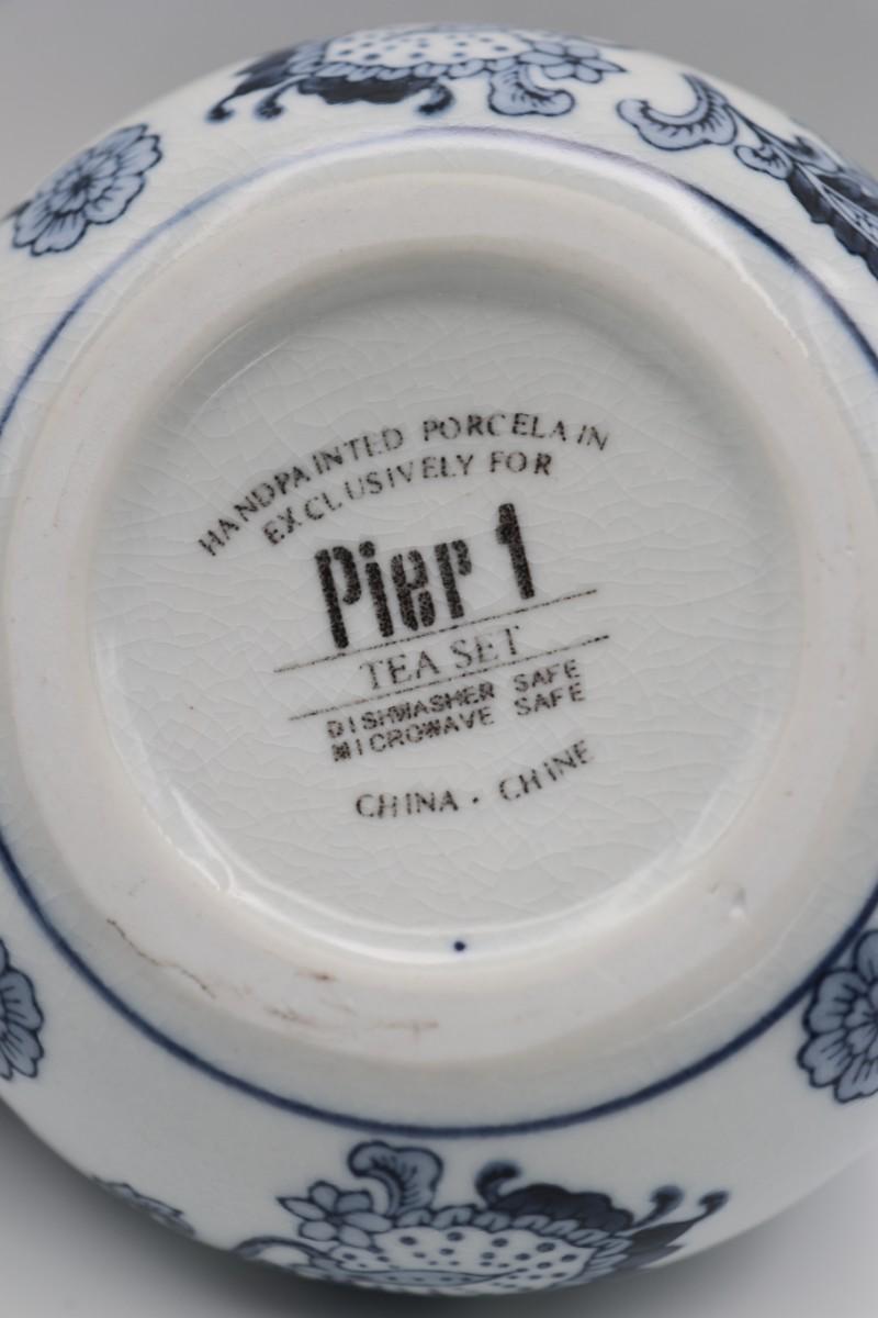 Pier 1 Imports Porcelain Hand Painted White Blue Tea Pot & Four Cups Set