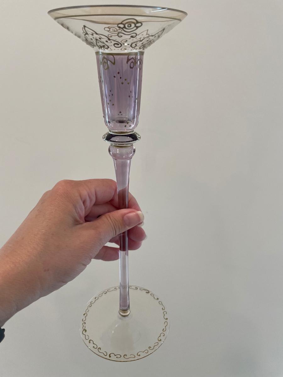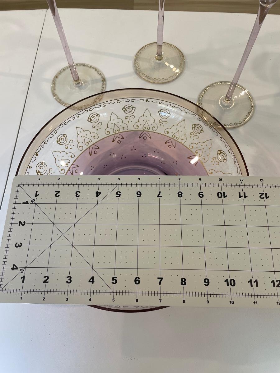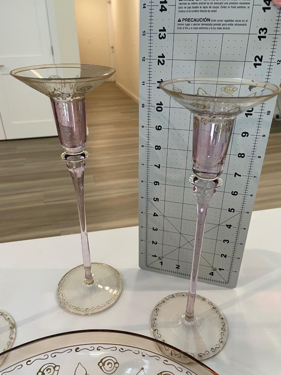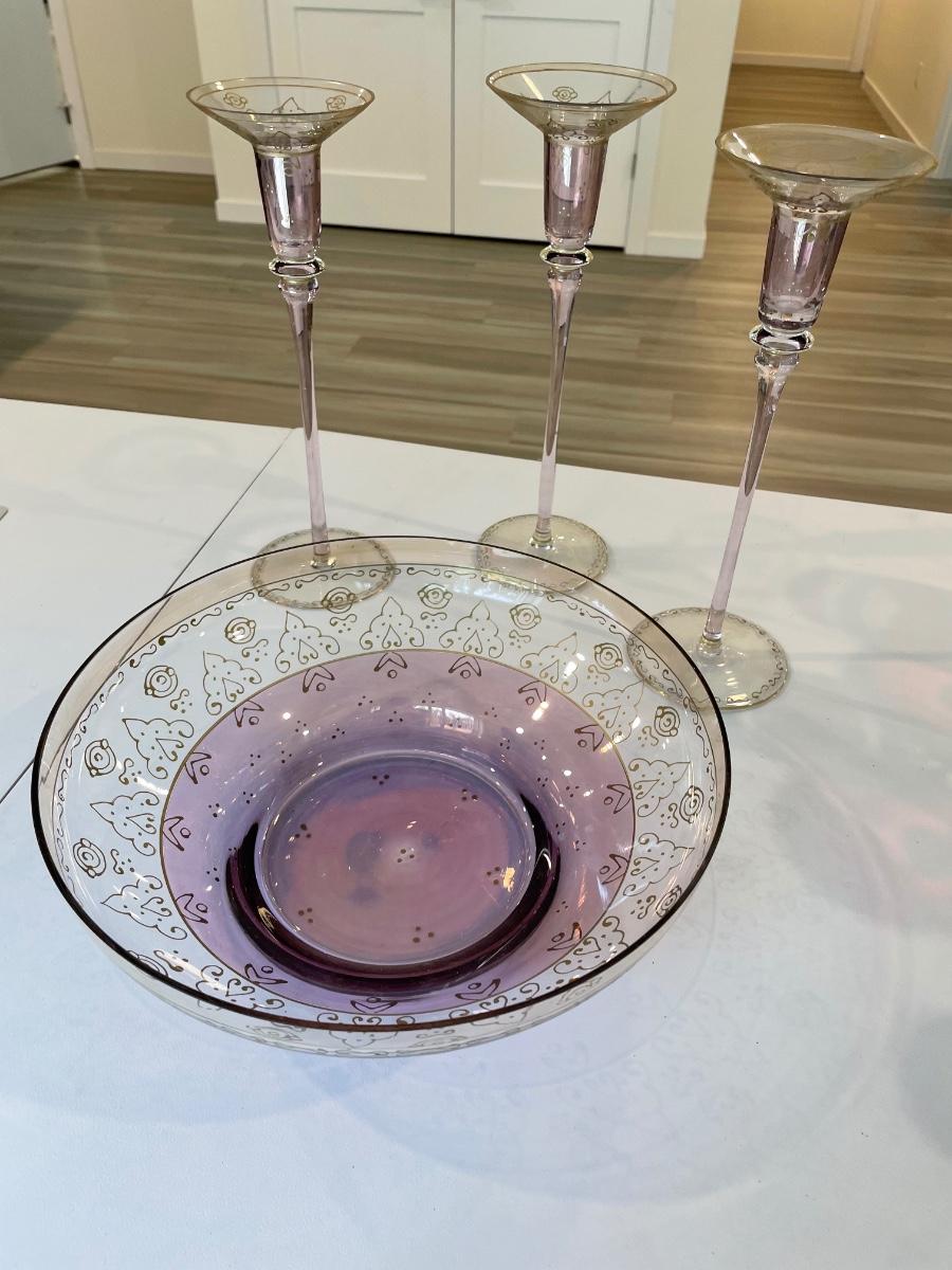 Set of 3 candlestick holders and bowl are in excellent condition. Soft lavender and gold colored.
