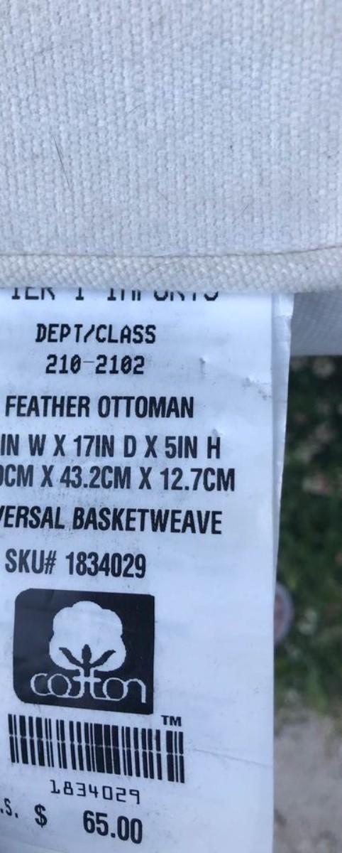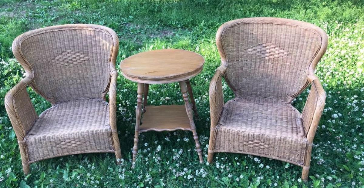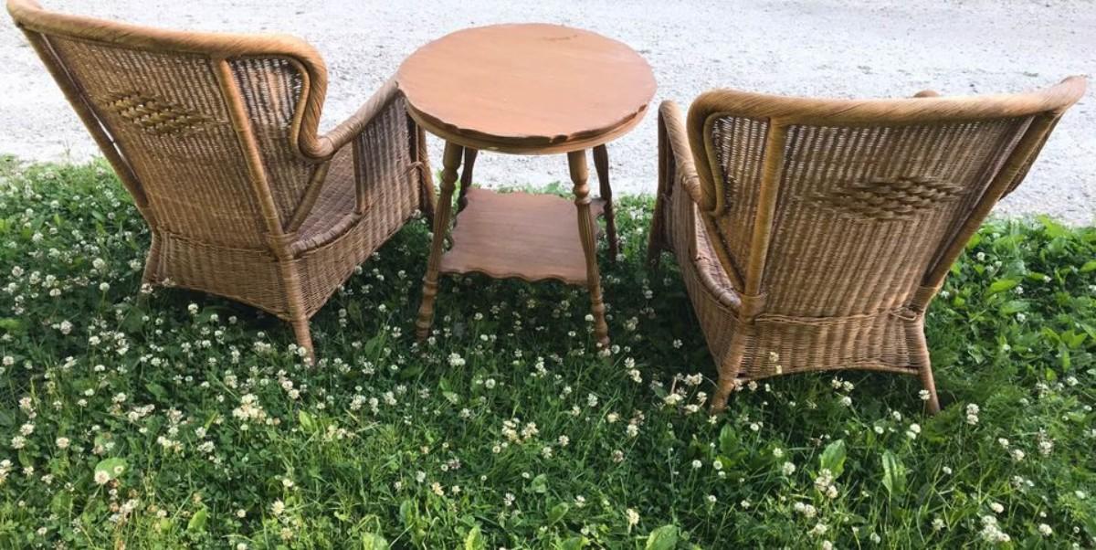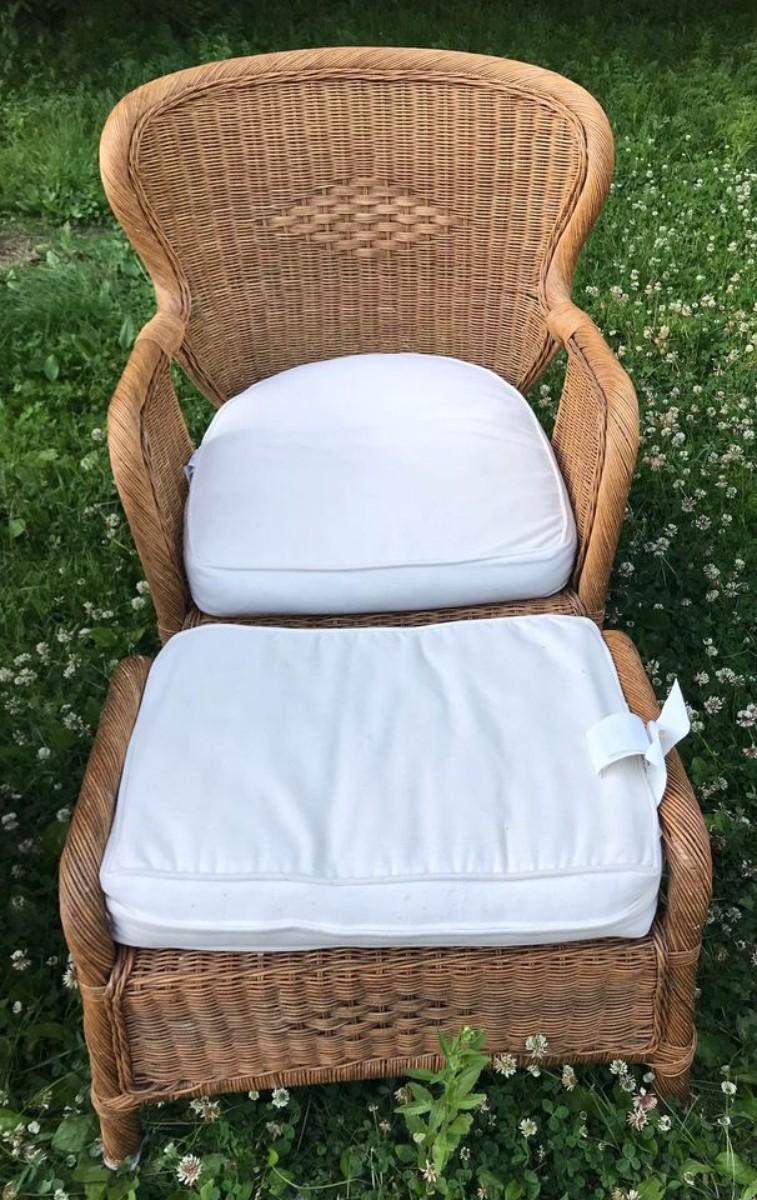 Winner will receive the two Pier 1 ~ gently used wicker chairs, the new Pier 1 ( not used ) cushions ~ a Pier 1 gently used ottoman . Also included is the antique parlor lamp table that was painted to match the wicker. Only outside to photograph . Gently used indoors for a staging.