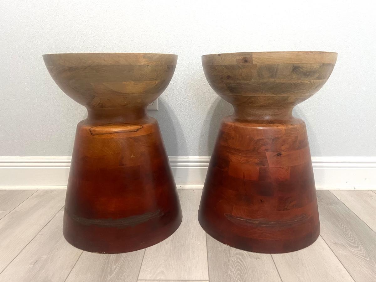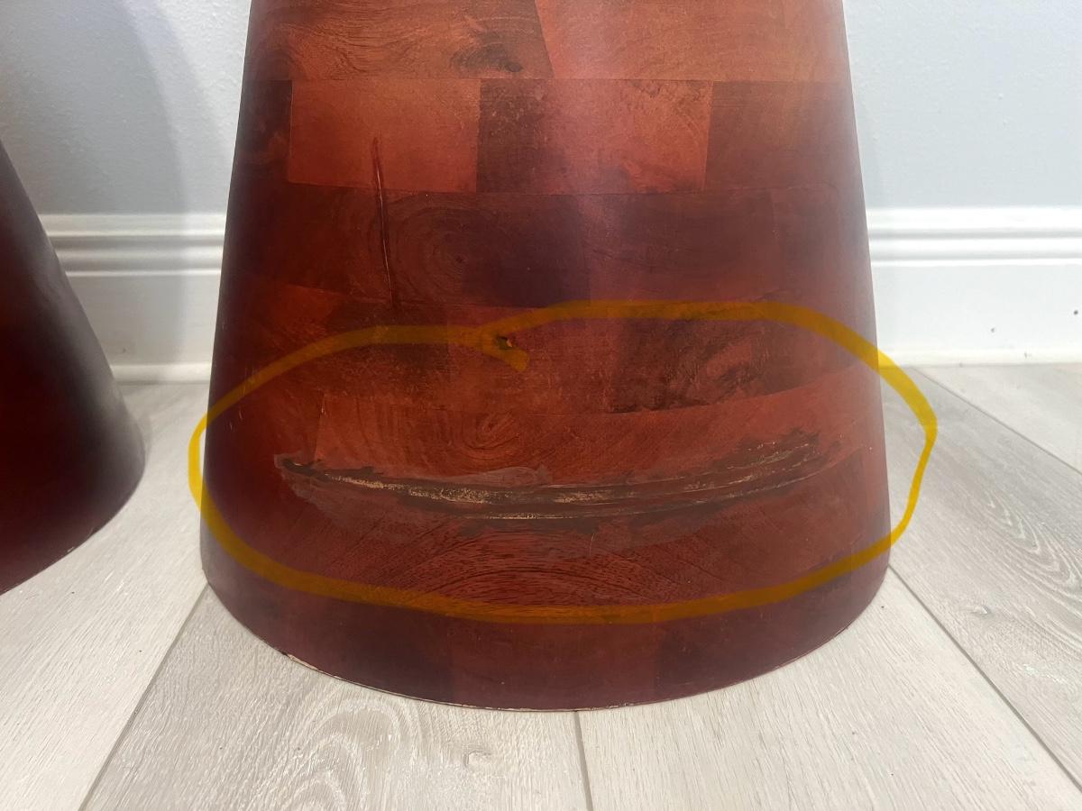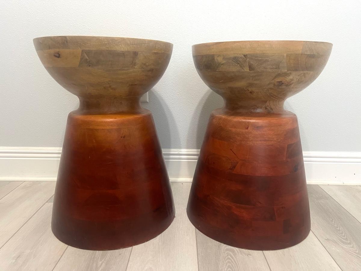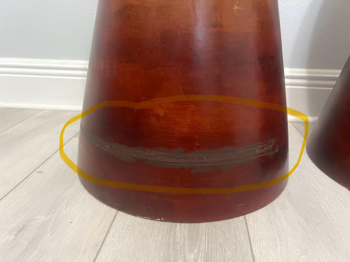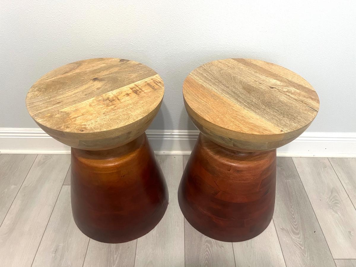 Pier One end tables. These were used as pedestals for wooden statues. Each measures 15-1/2” round X 22” tall. Notice in pictures each one has a scratch along the bottom.