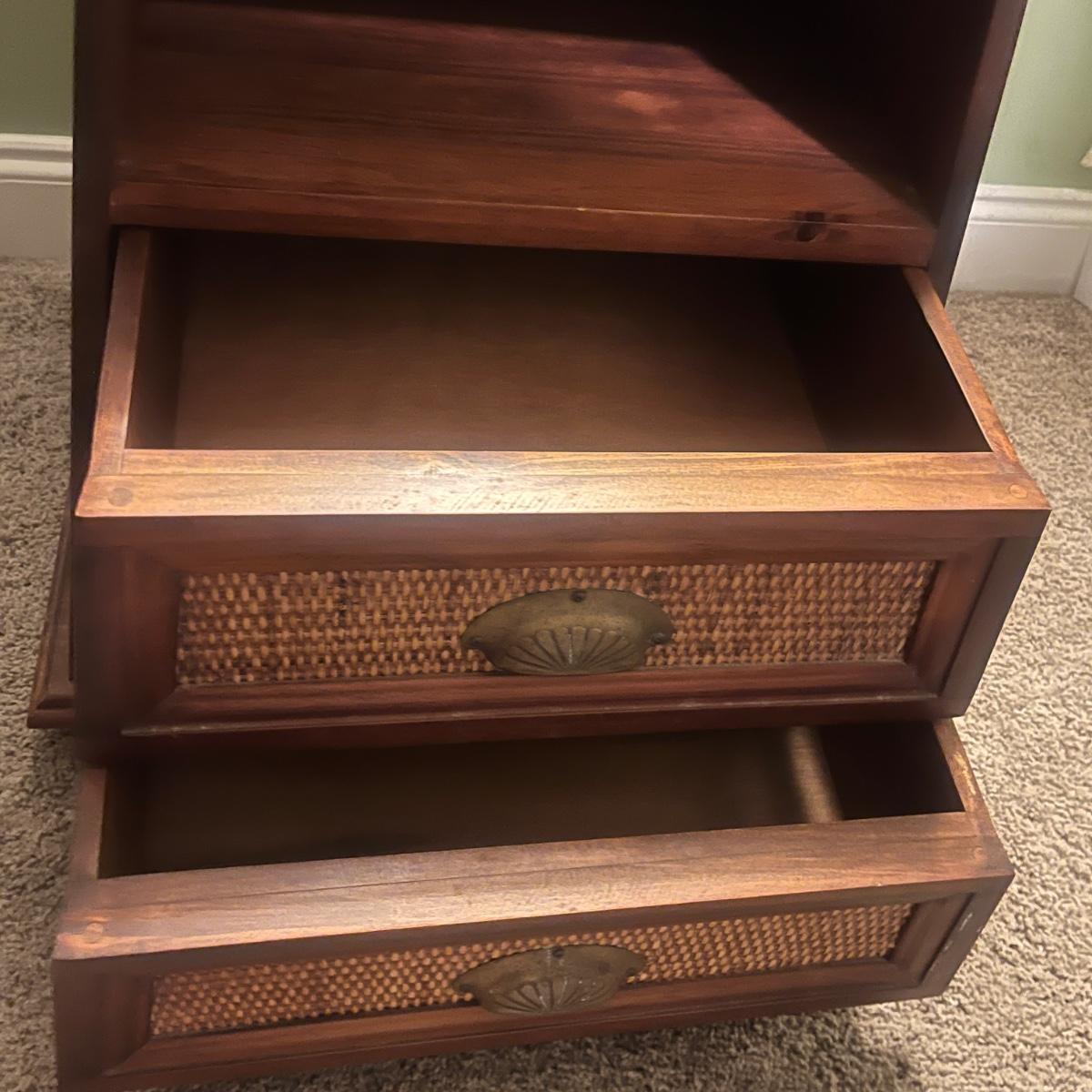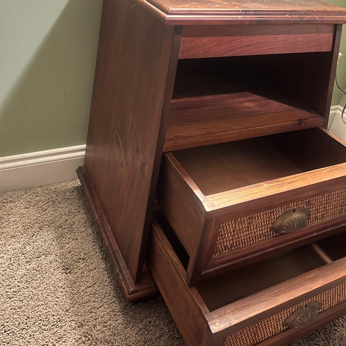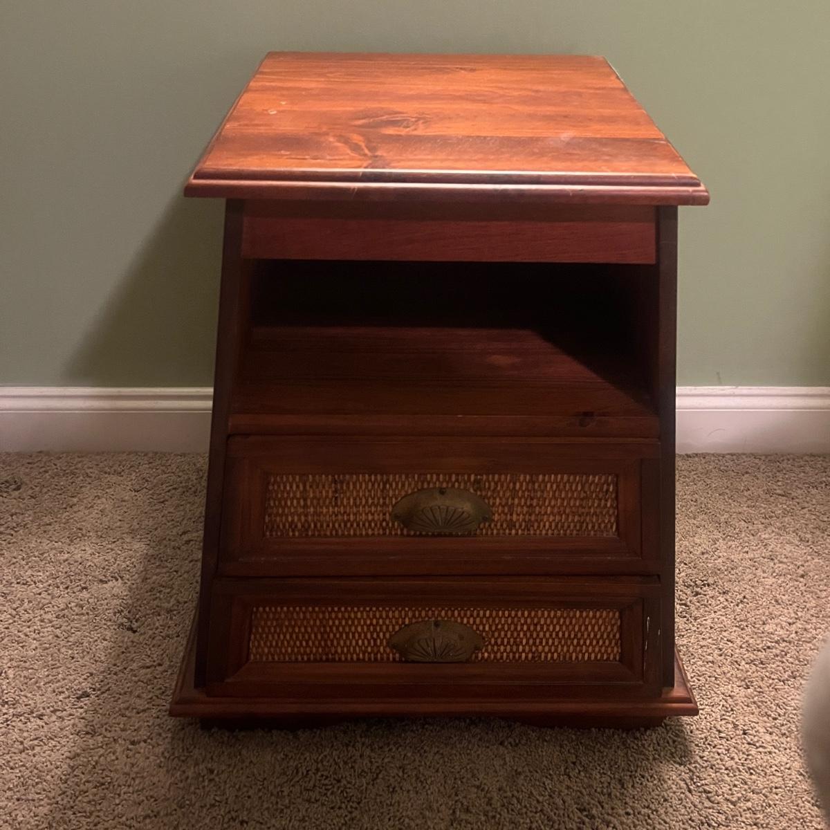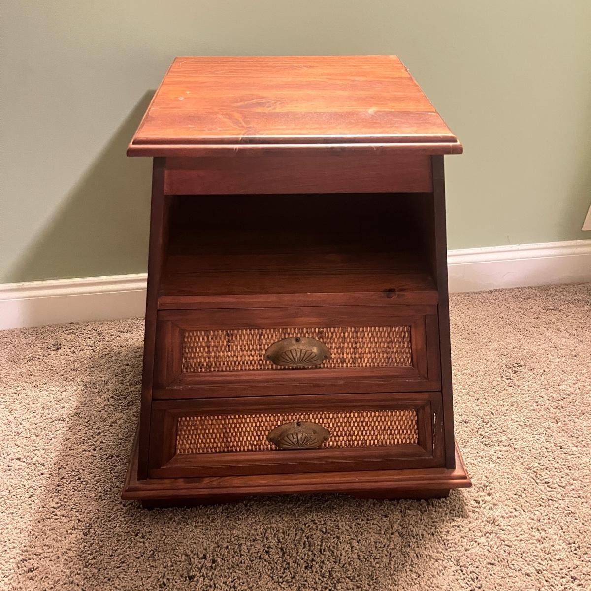 Lot includes a solid wood Pier1 wooden two drawer end table that measures 22” x 19” x 25”H. Piece appears to be from the Pyramid collection and tapers out at the bottom.