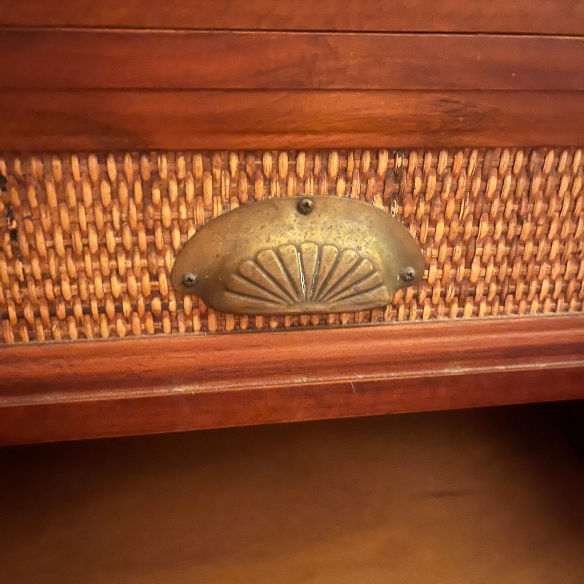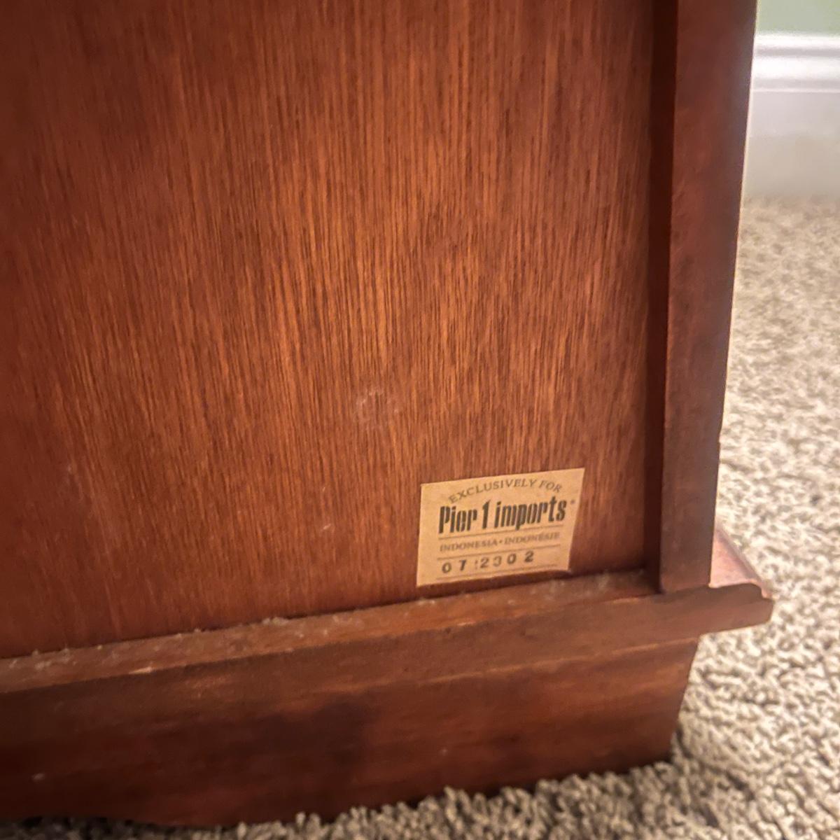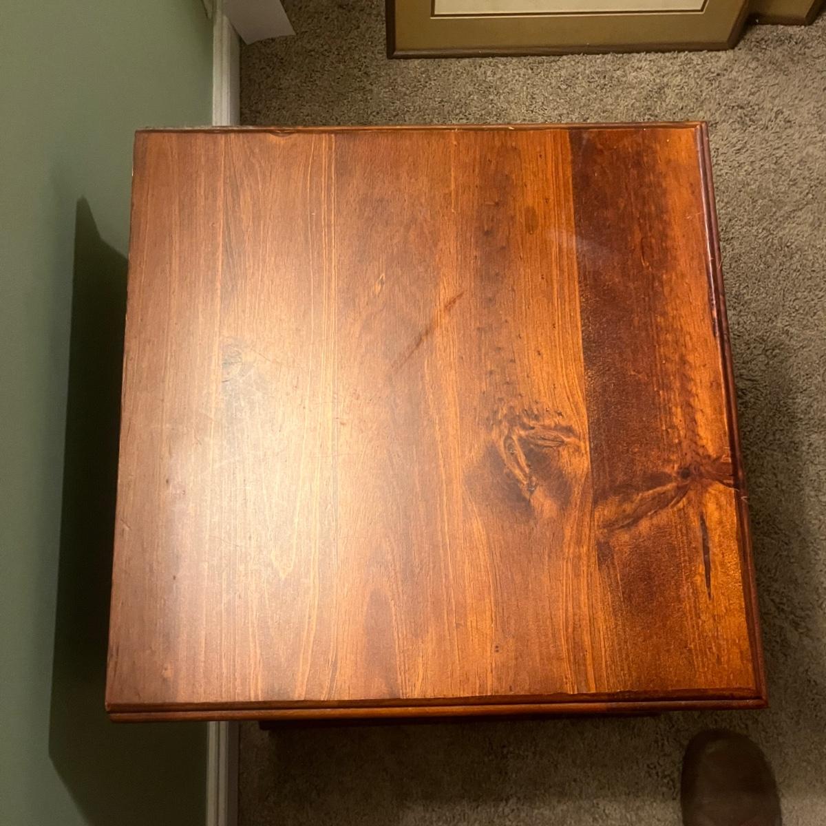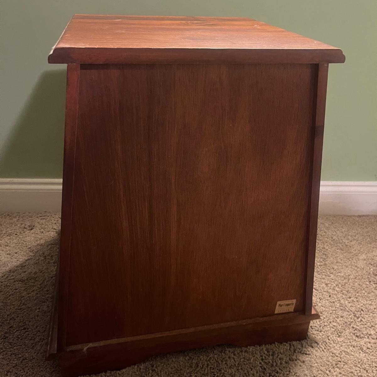 Lot includes a solid wood Pier1 wooden two drawer end table that measures 22” x 19” x 25”H. Piece appears to be from the Pyramid collection and tapers out at the bottom.