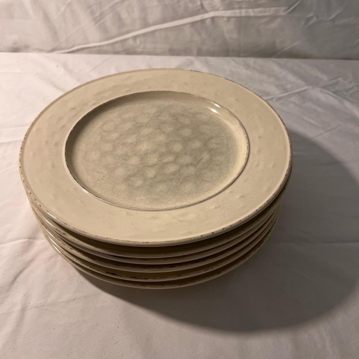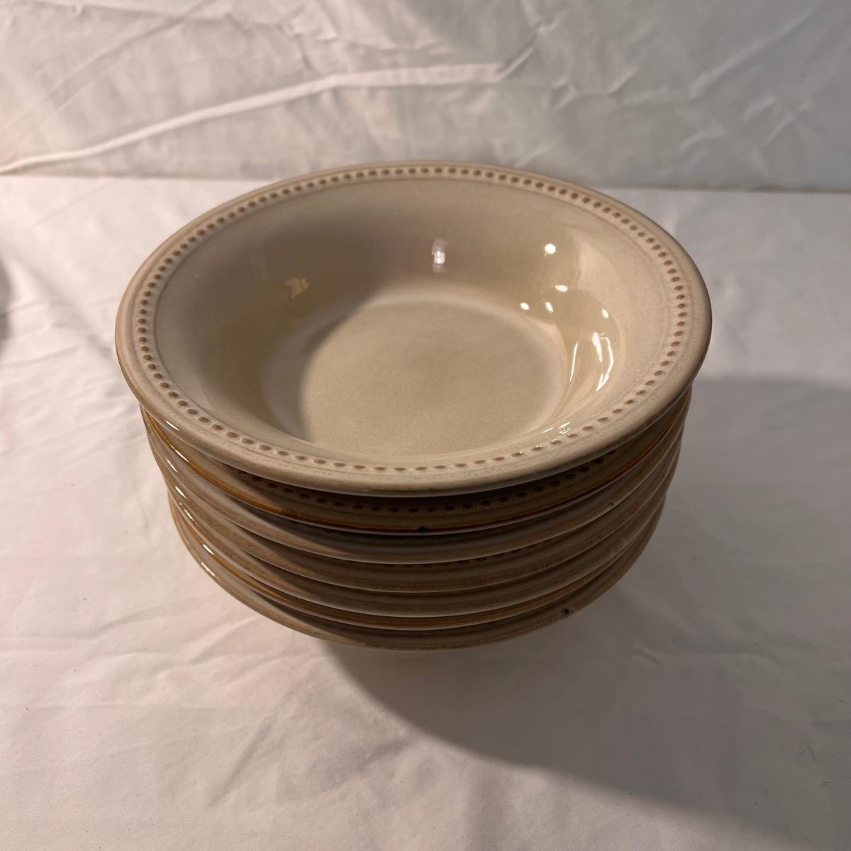 This lot includes seven Pier1 Imports Stoneware bowls from the "œSpice Route Sesame" collection. Also included are six, what it appears to be, stoneware plates that are unlabeled. The plates are 11"D and the bowls measure 8.25"D x 2"H. Local Pickup Only