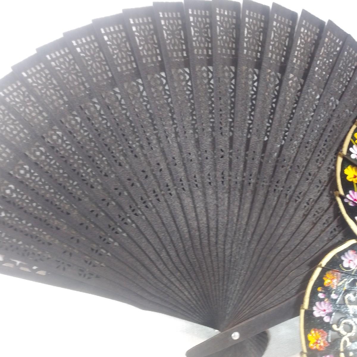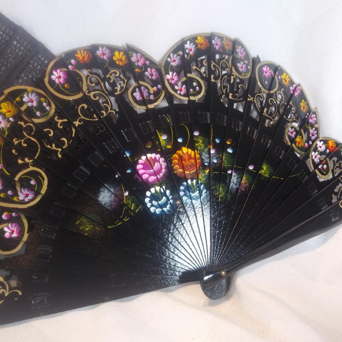 This auction lot is for a grouping of Pierced Ornate Wooden Fans. This group of three have very decorative cut outs. One is mat black, the other two are hand-painted. They are amazing. All are in very good condition.