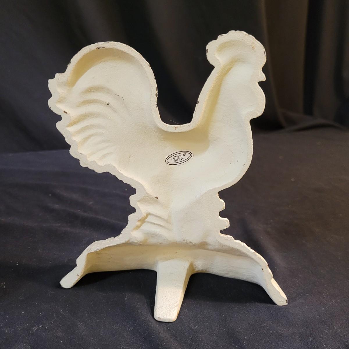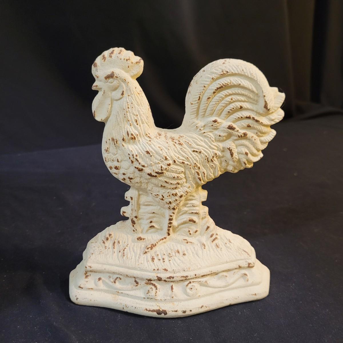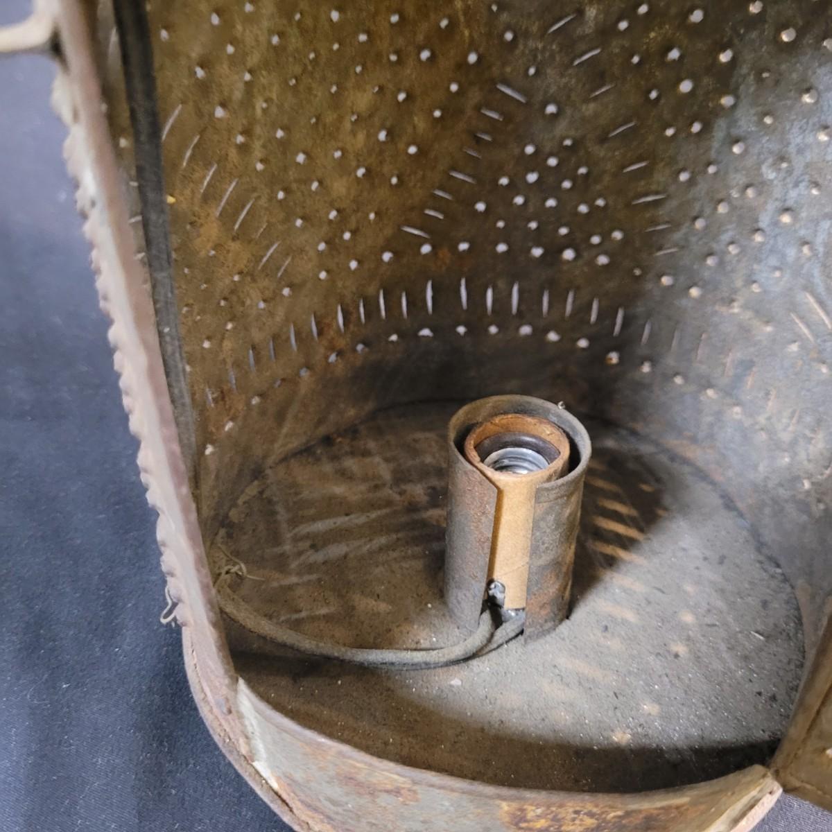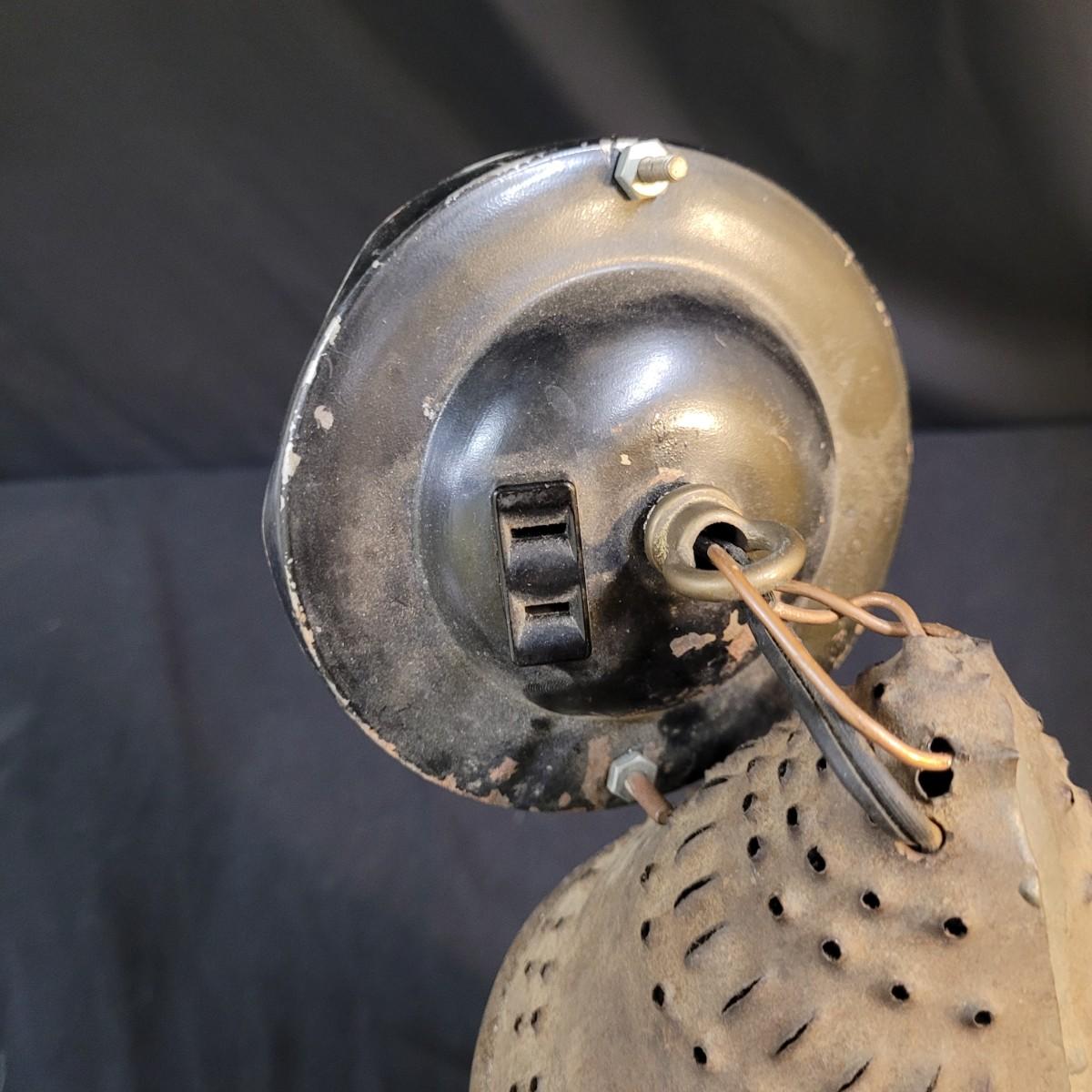 Tin lantern has moderate rusting throughout but body and hinges are intact. Unable to test electrical equipment. Rooster doorstop is heavy for size, with some paint chipping (see photos). Lantern measures approximately 6"DIA x14.5"H. Shipping available.