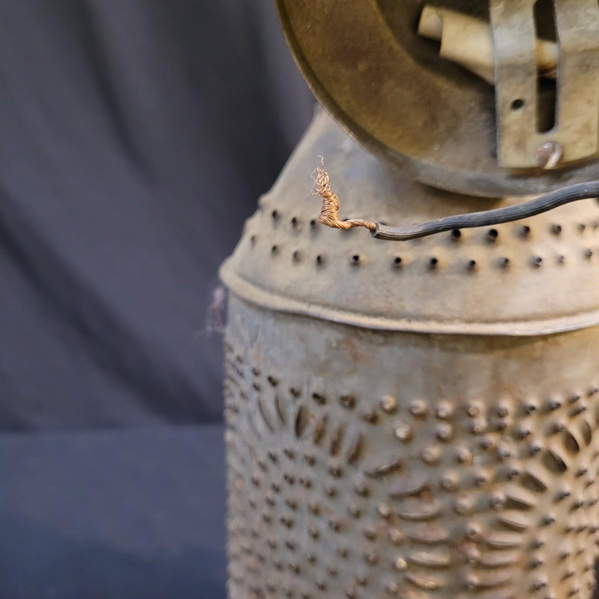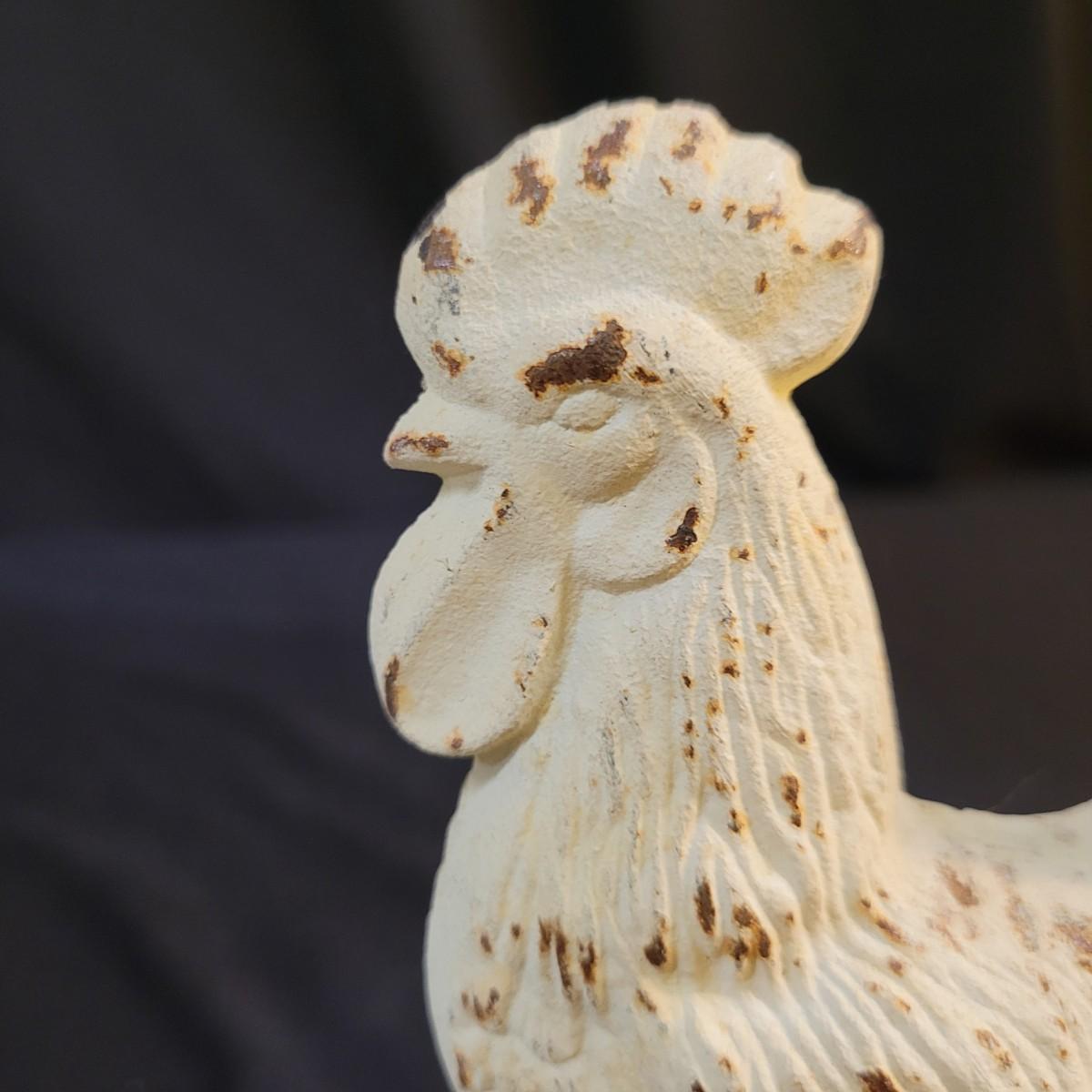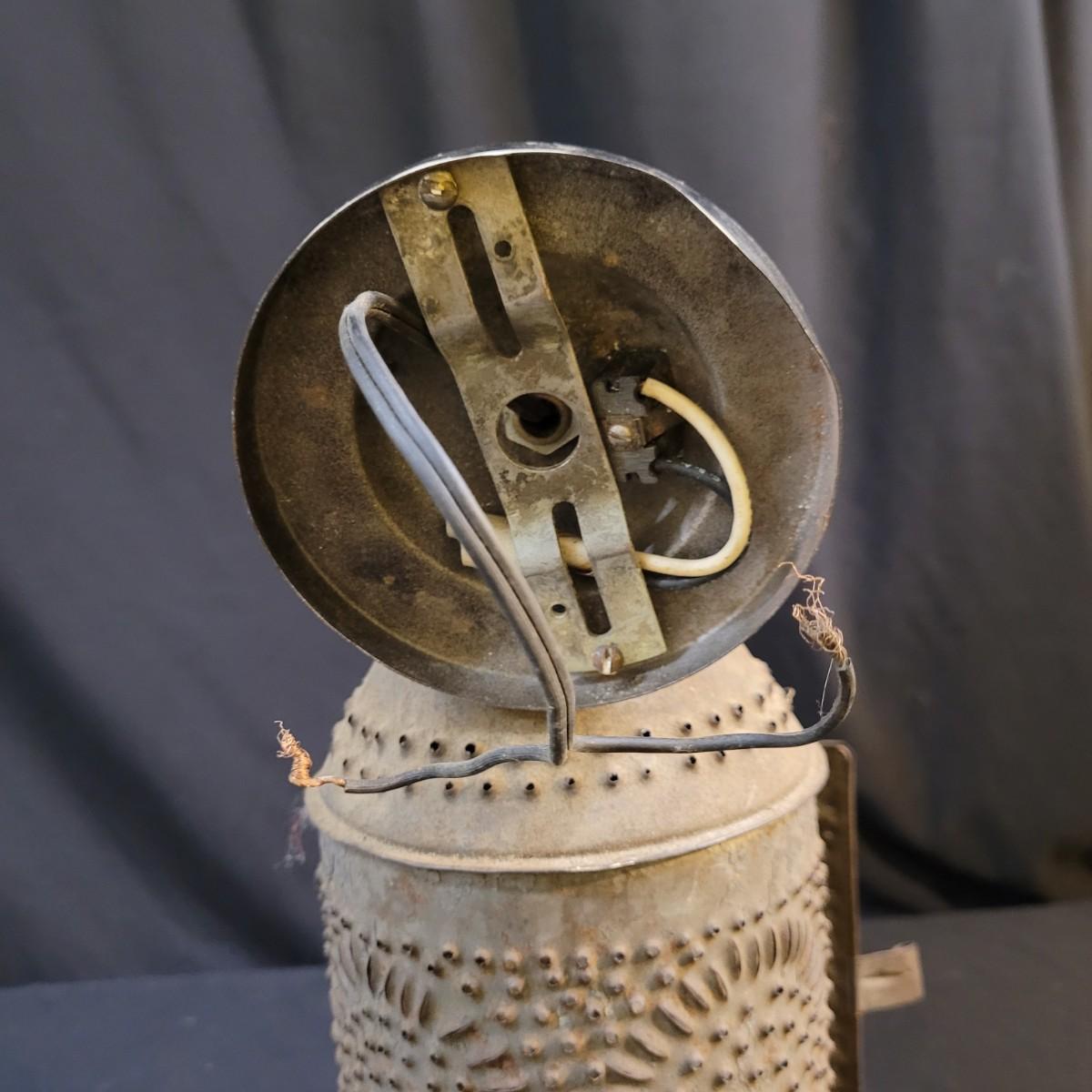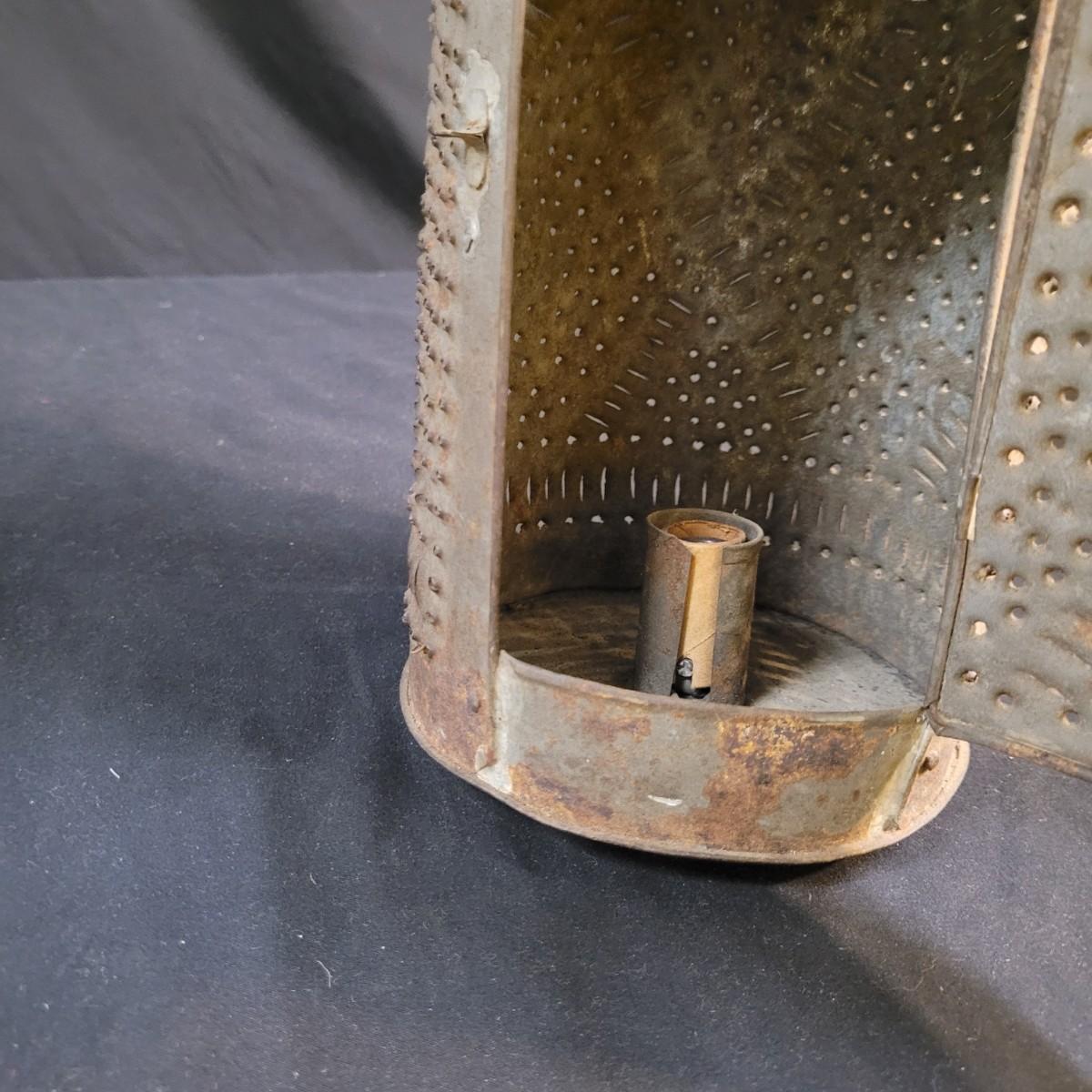 Tin lantern has moderate rusting throughout but body and hinges are intact. Unable to test electrical equipment. Rooster doorstop is heavy for size, with some paint chipping (see photos). Lantern measures approximately 6"DIA x14.5"H. Shipping available.