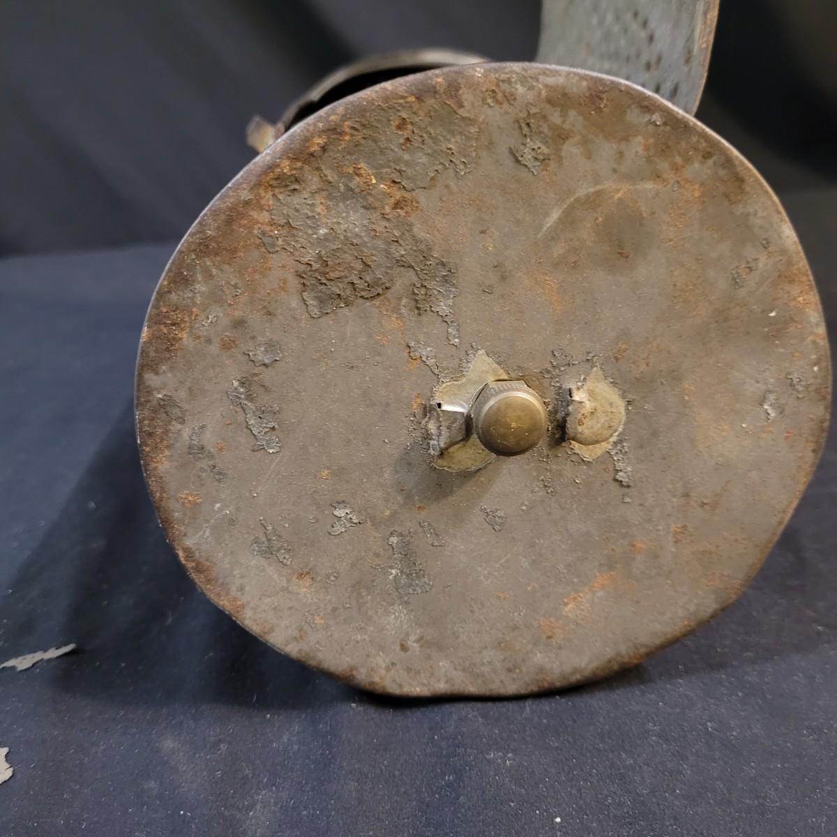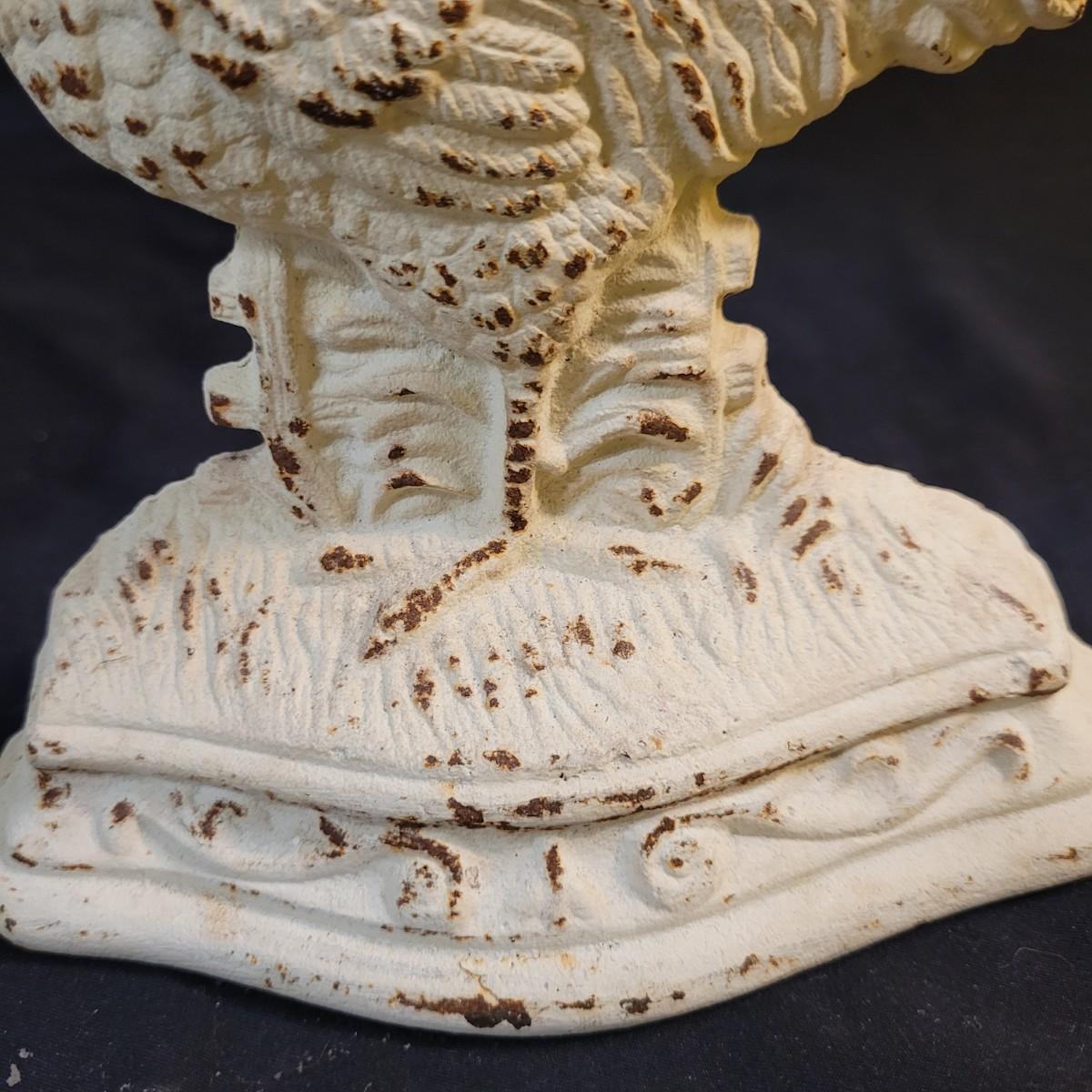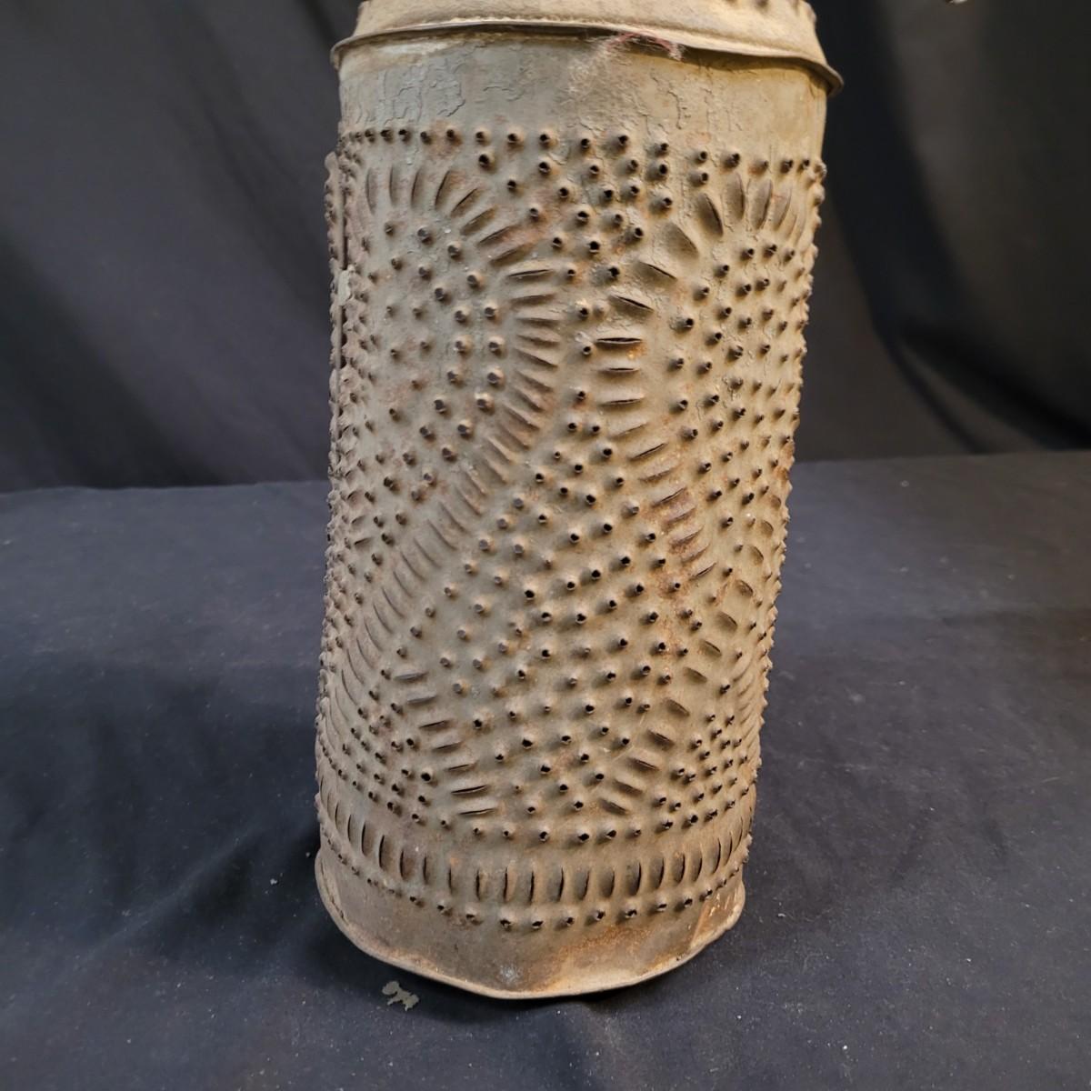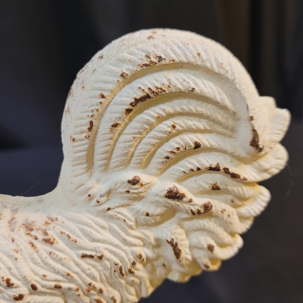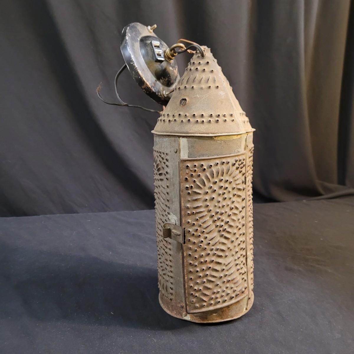 Tin lantern has moderate rusting throughout but body and hinges are intact. Unable to test electrical equipment. Rooster doorstop is heavy for size, with some paint chipping (see photos). Lantern measures approximately 6"DIA x14.5"H. Shipping available.