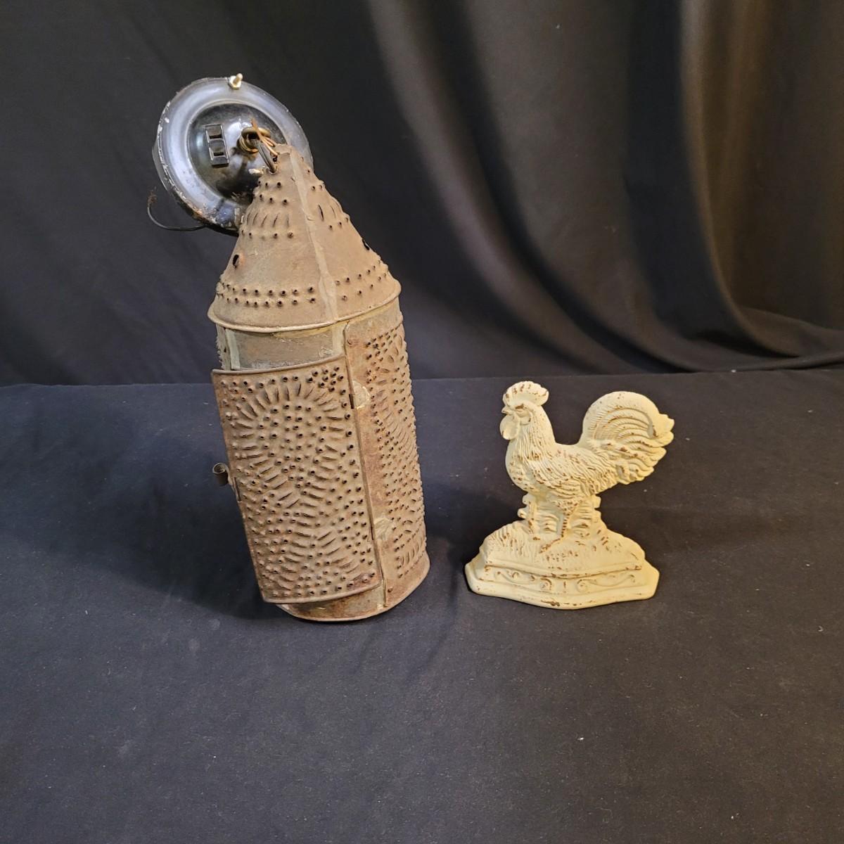 Pierced Tin Electric Hanging Lantern and Cast Iron Rooster Doorstop (C-D-CE)
