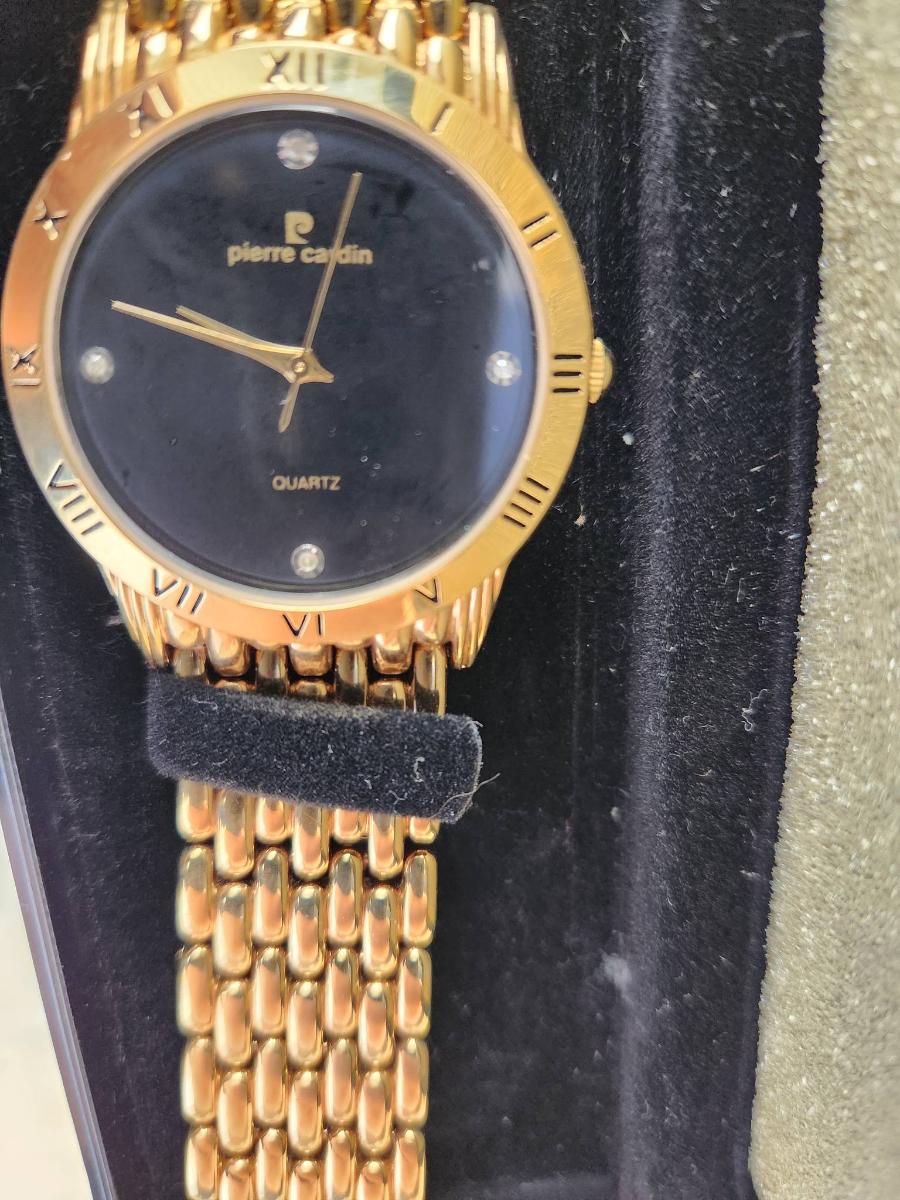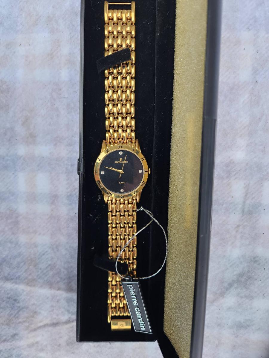 Pierre Cardin gold-tone quartz watch featuring a black dial with a Roman numeral bezel and four crystals at the 3, 6, 9, and 12 o'clock positions. It comes with a multi-link gold-tone bracelet. Presented in its original box with tag attached. No visible damage or signs of significant wear. A classic, elegant timepiece.