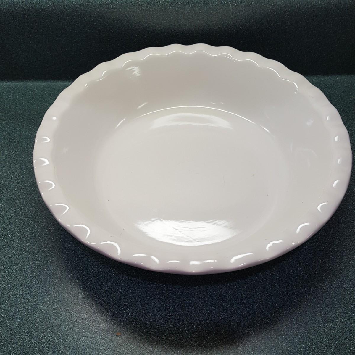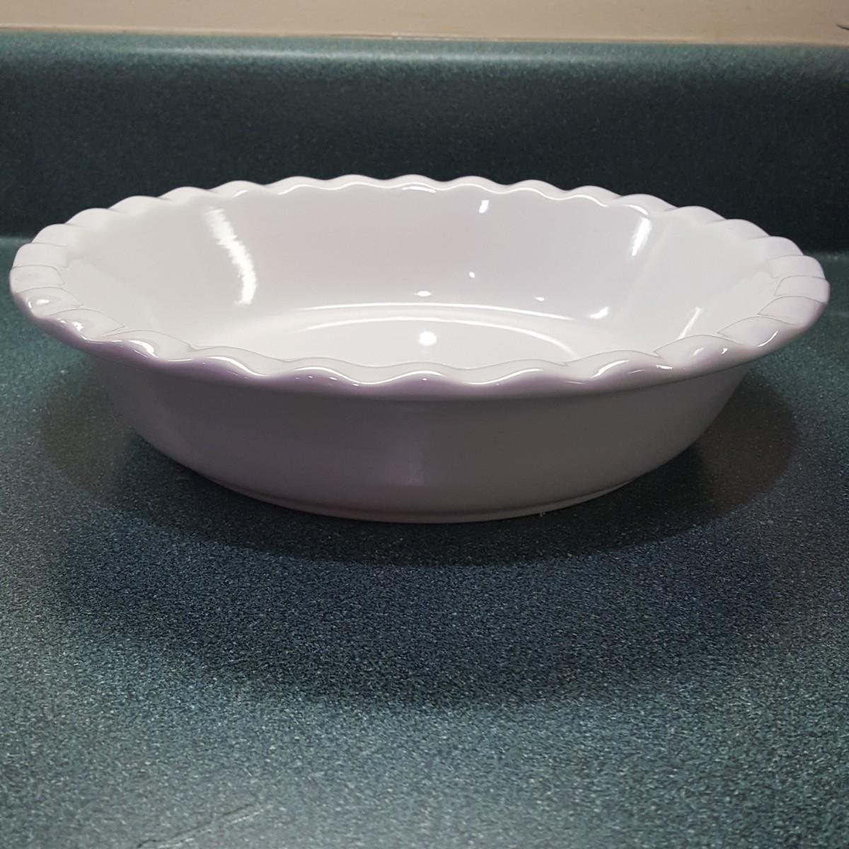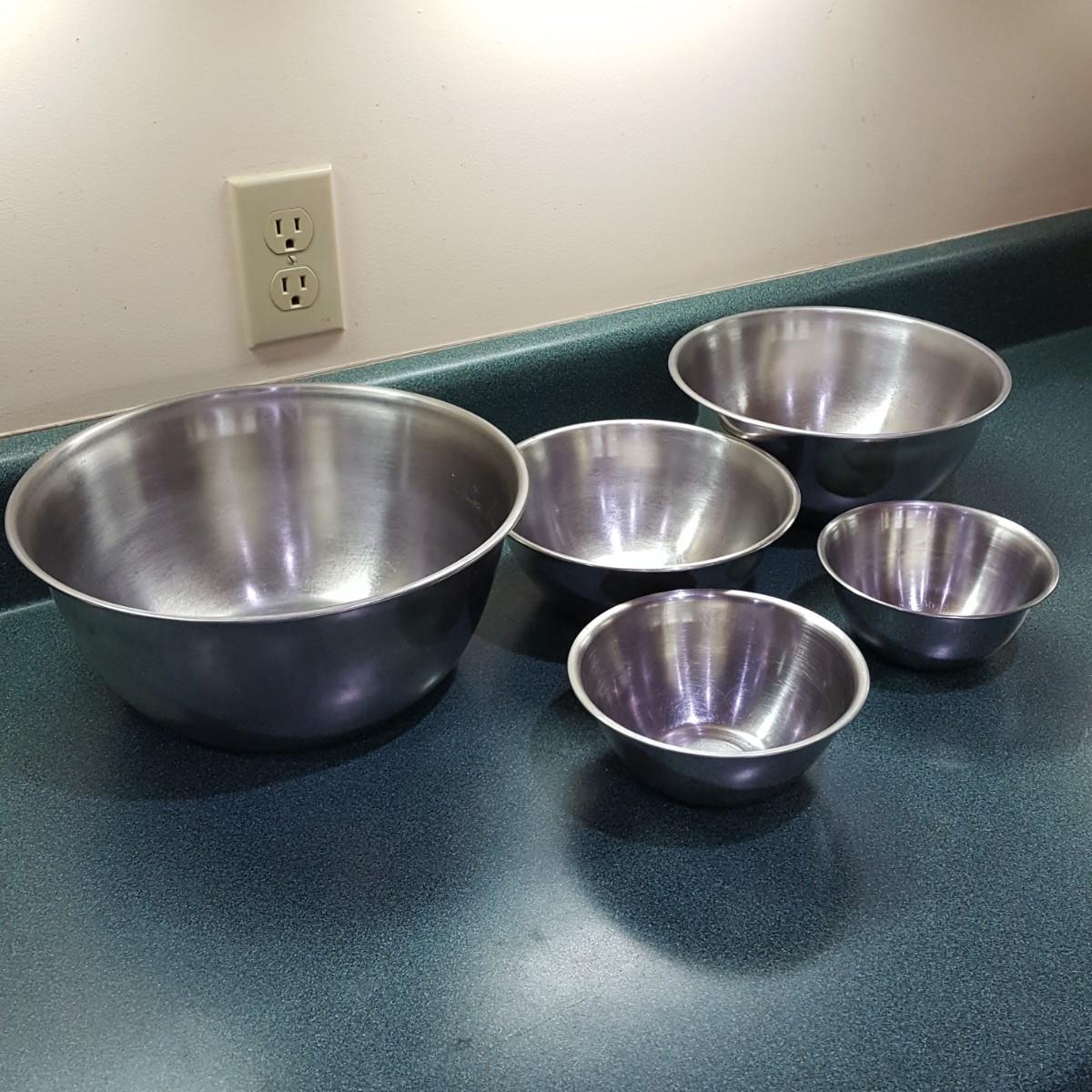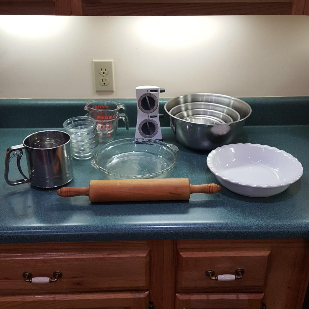 This lot contains 1 white ceramic pie pan (10 inches x 3 inches), 5 Anchor brand small clear bowls (4 inches x 2 inches), 2 Pyrex 1 cup measuring cups, 1 metal shifter, 1 vintage, wooden looking rolling pin, 5 metal, stacking mixing bowls, 1, 2 tiered timer by Progressive, and 1 glass Pyrex pie pan (9.5 inches).. All pieces appear to be in good condition. The rolling pin has some wear on it, see pictures for details.