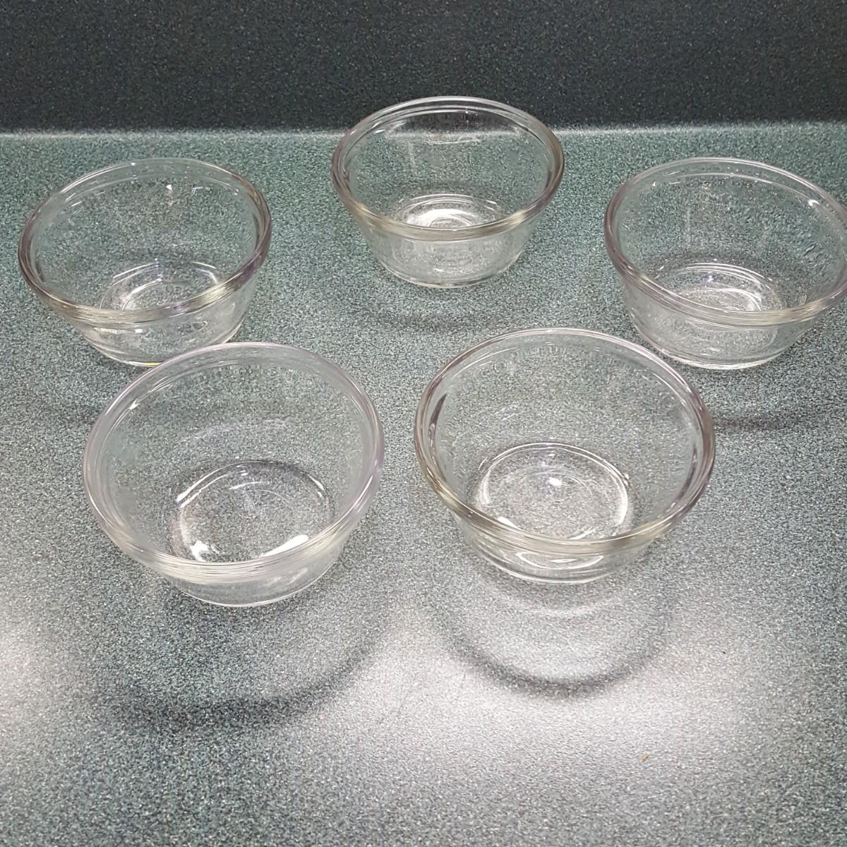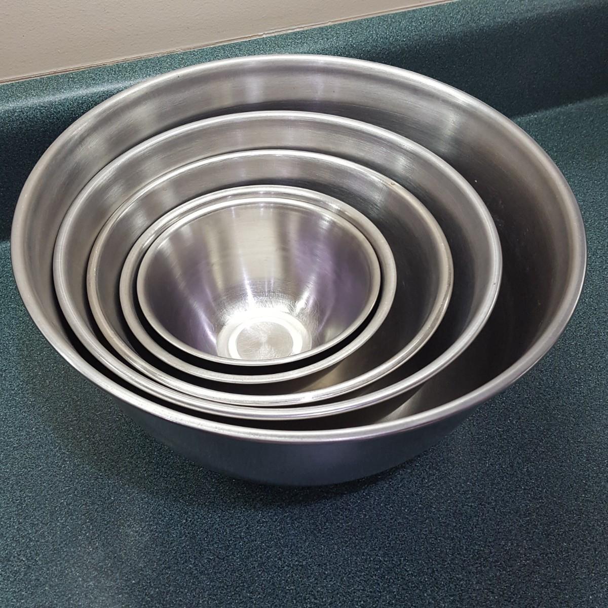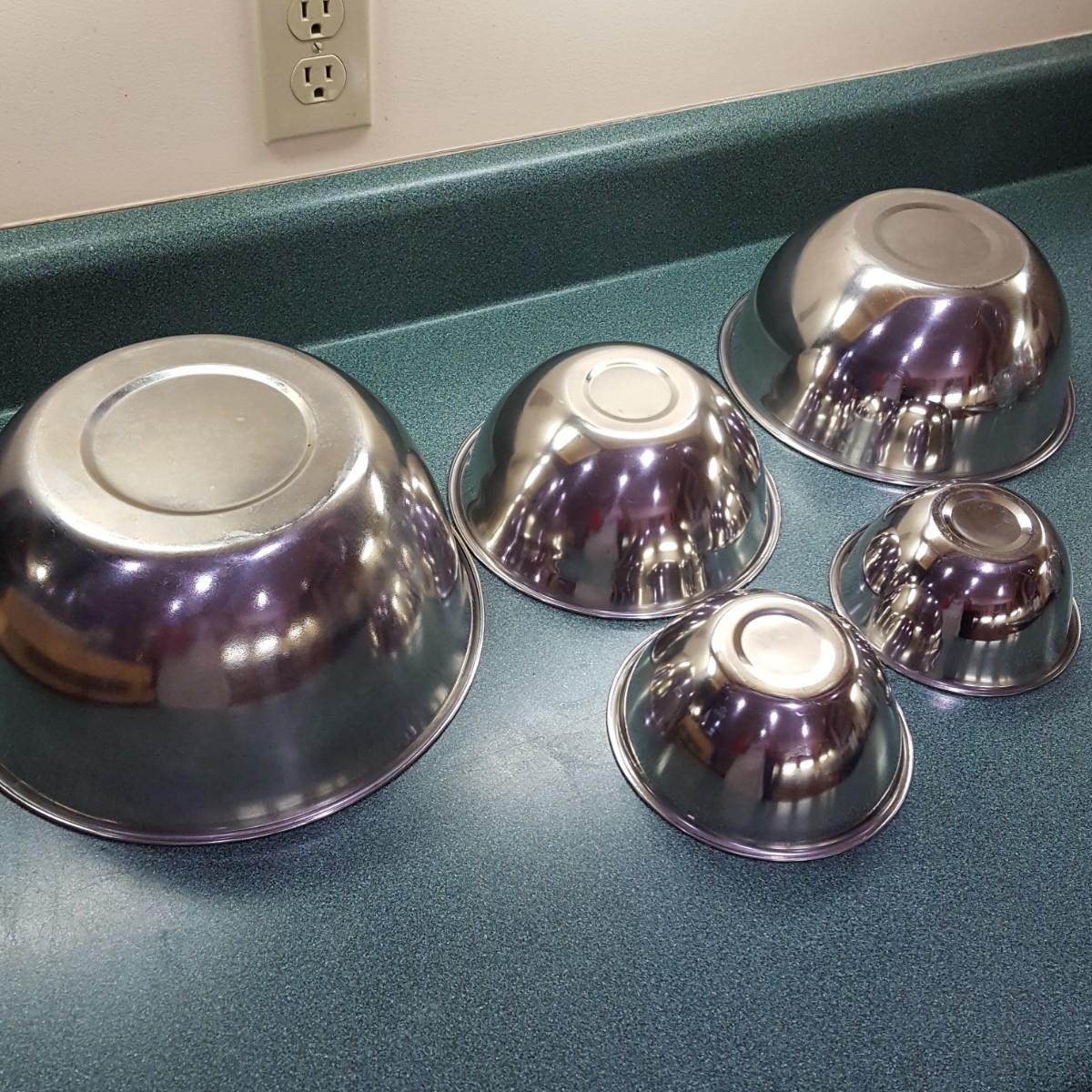 This lot contains 1 white ceramic pie pan (10 inches x 3 inches), 5 Anchor brand small clear bowls (4 inches x 2 inches), 2 Pyrex 1 cup measuring cups, 1 metal shifter, 1 vintage, wooden looking rolling pin, 5 metal, stacking mixing bowls, 1, 2 tiered timer by Progressive, and 1 glass Pyrex pie pan (9.5 inches).. All pieces appear to be in good condition. The rolling pin has some wear on it, see pictures for details.