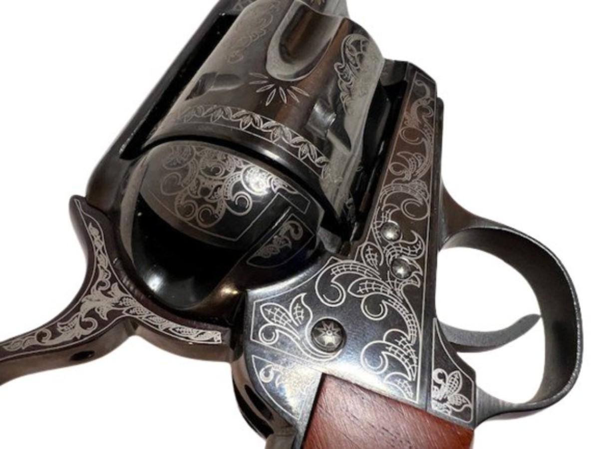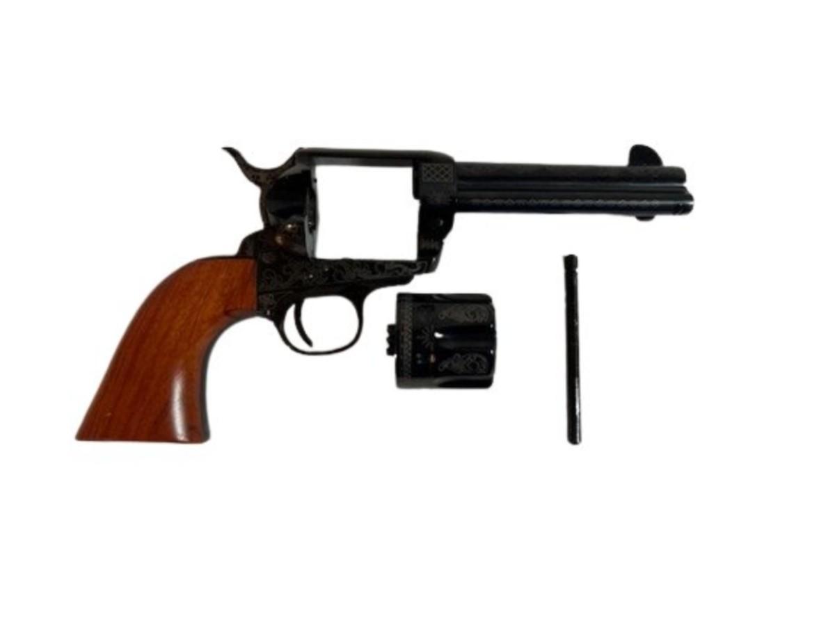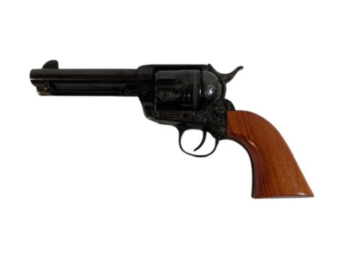 Model 1873. Caliber is .45 LC. Historical reproduction. Made in Italy. Single action. Laser engraved. Gently used. Includes original box and paperwork. Serial number E118538. Not tested. [LF]