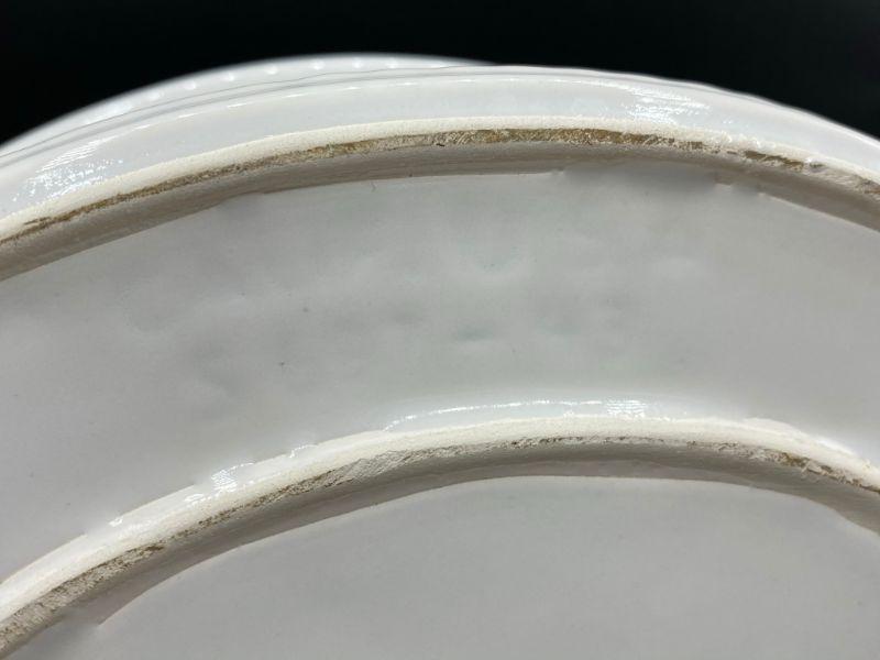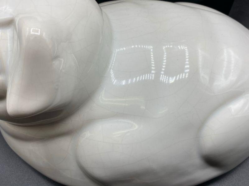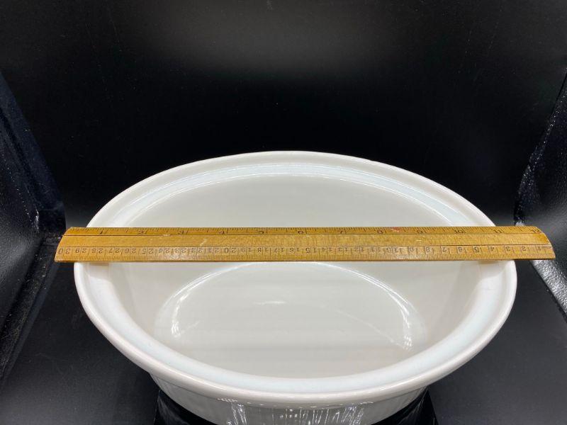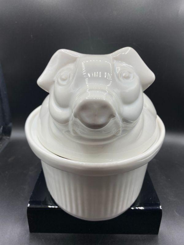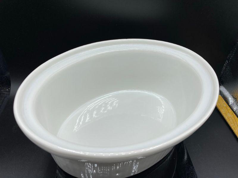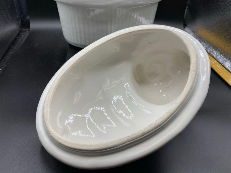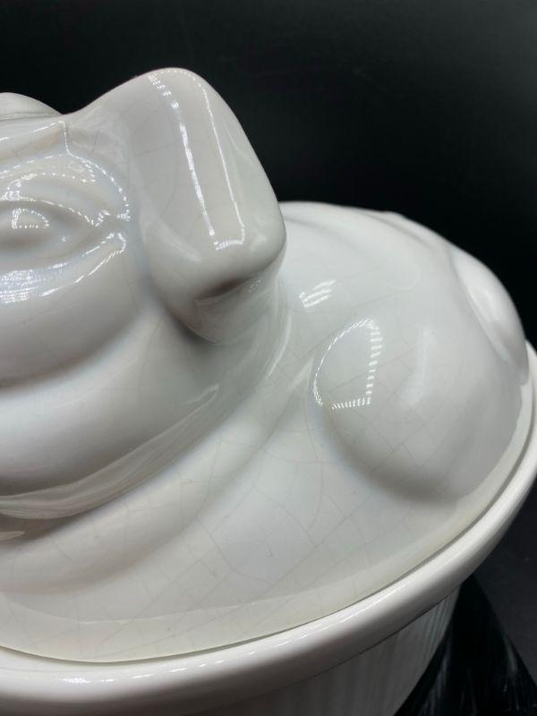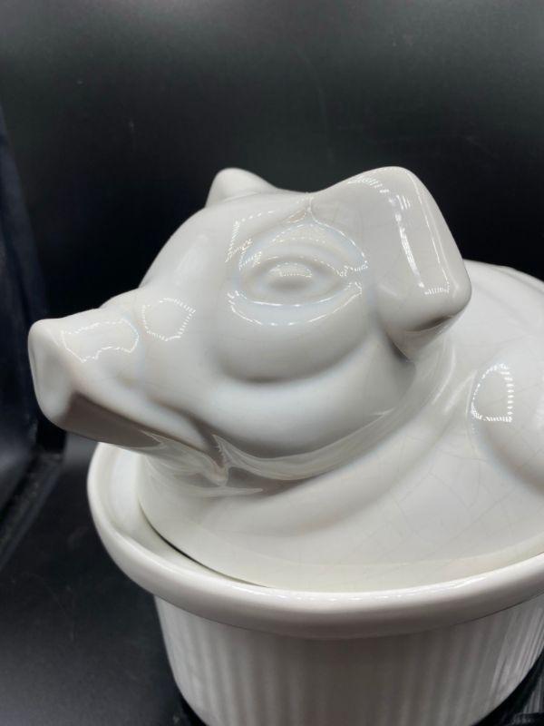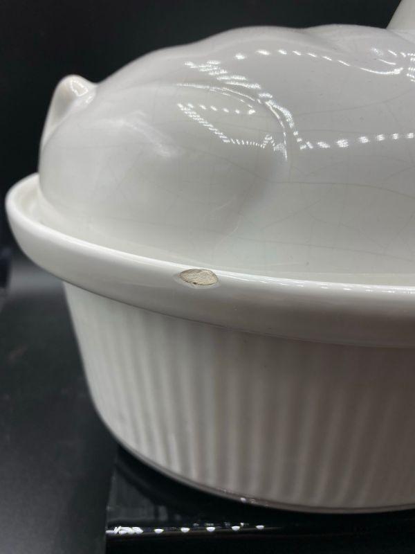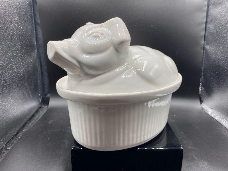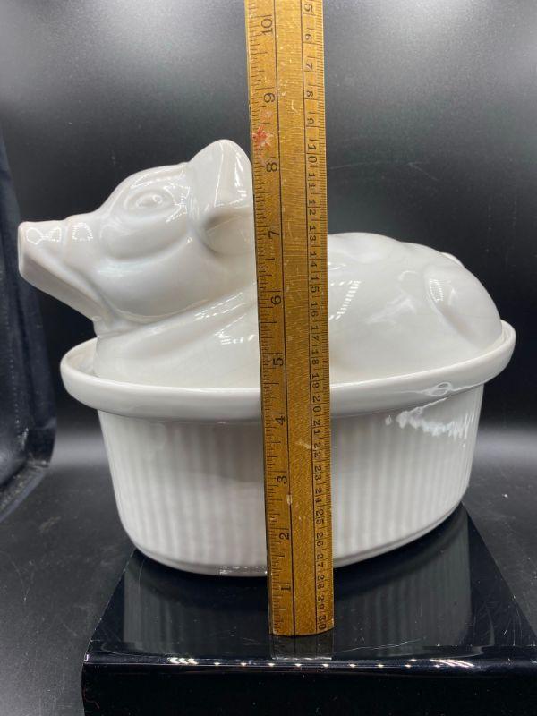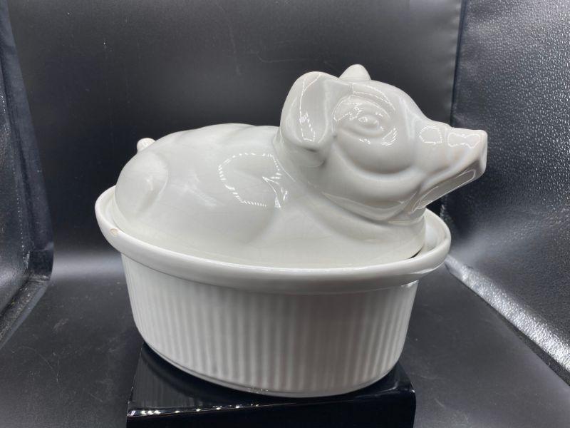 White oval casserole dish with a pig shaped lid. California pottery mark on the bottom. Crazing on the pig only. Good size, 11" across. Great conversation piece at the holidays or for display. Does have a small chip in the side of casserole dish.