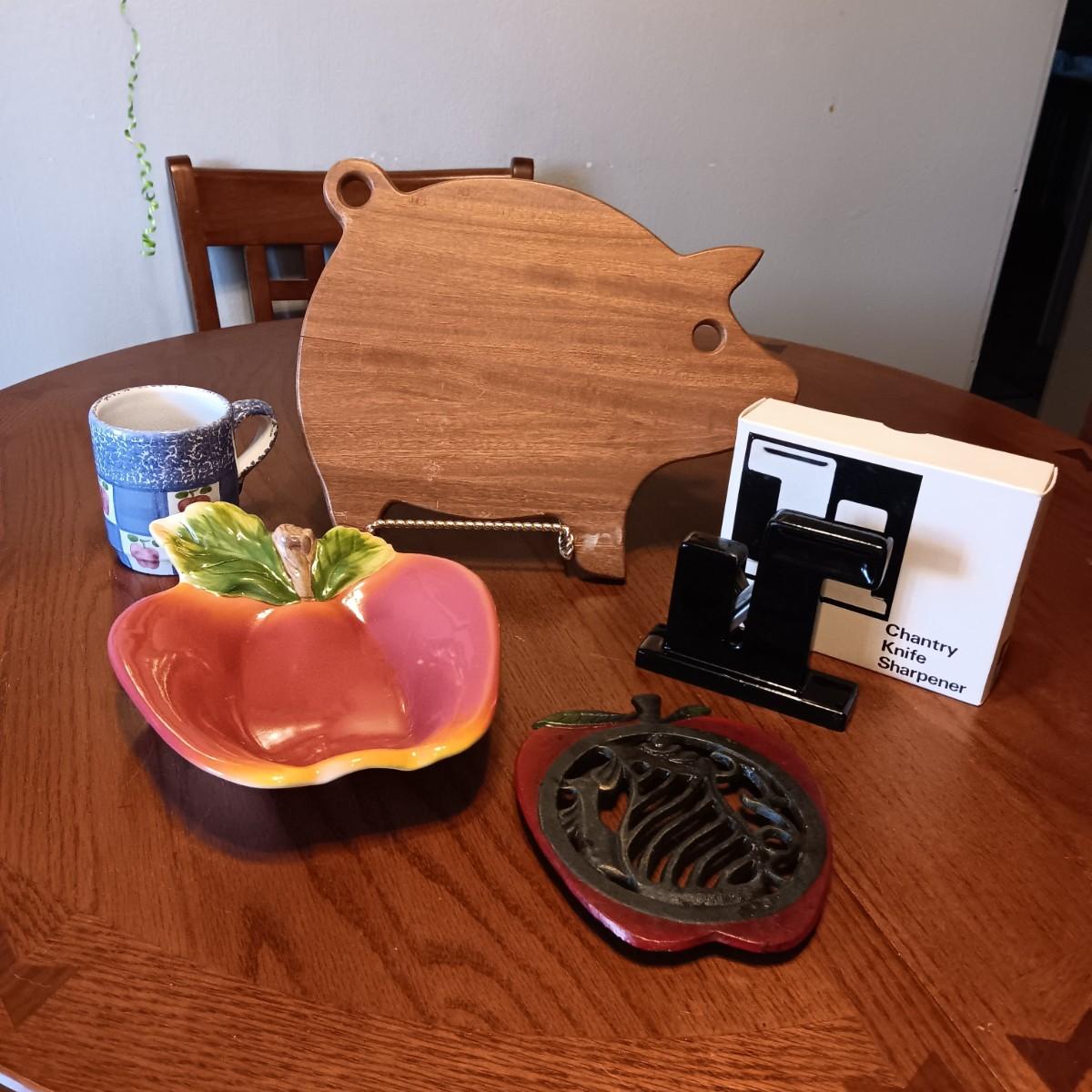 PIG CUTTING BOARD, CHANTRY KNIFE SHARPENER, APPLE DISH, TRIVET AND MUG