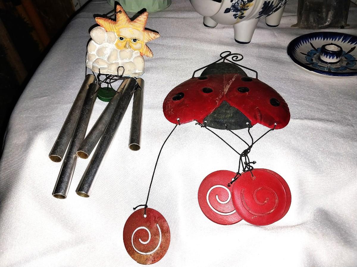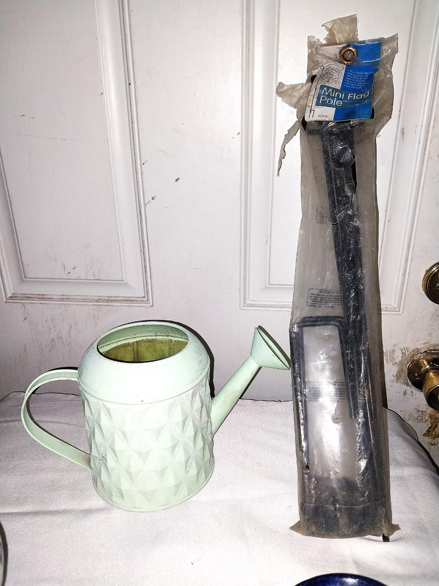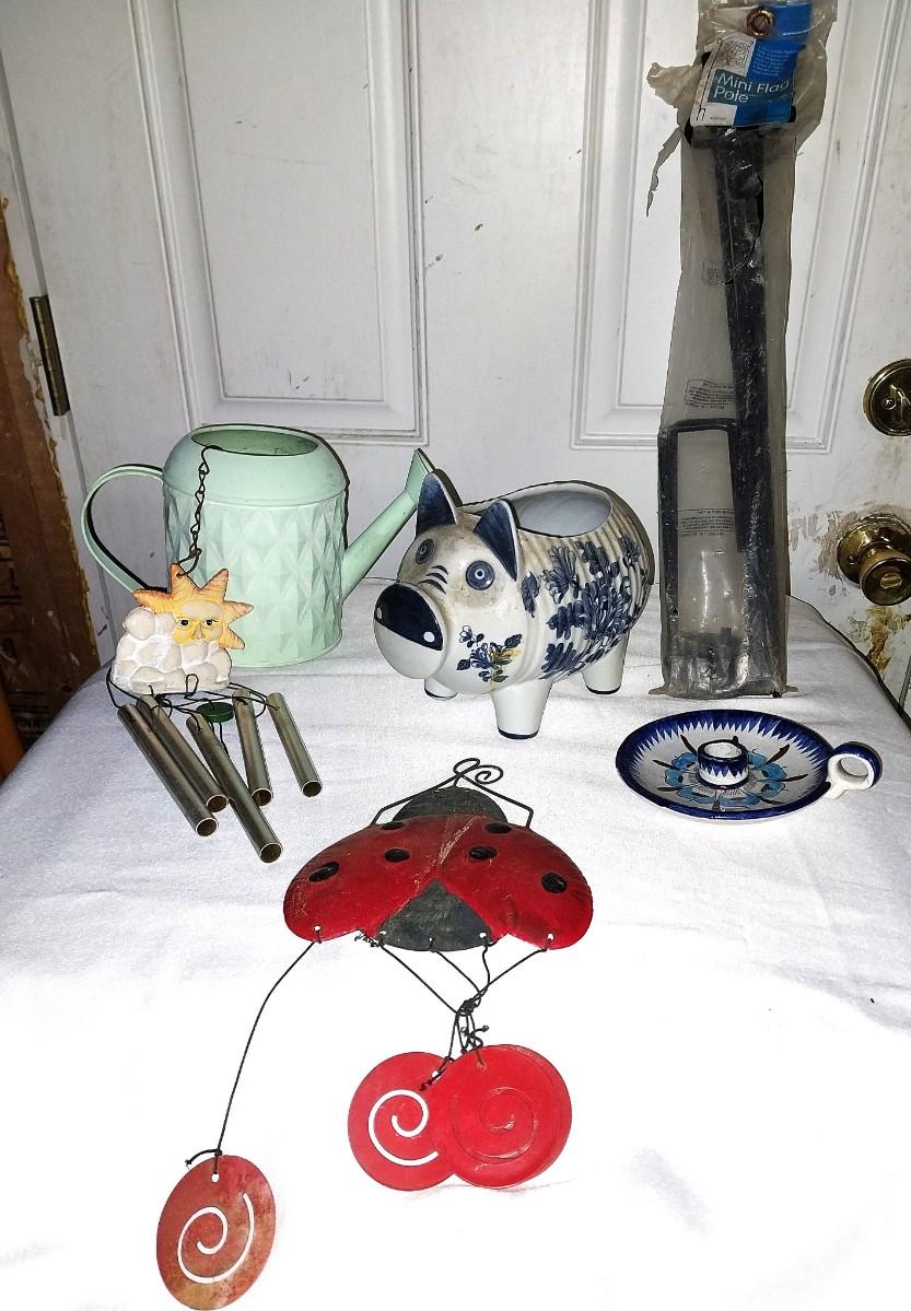 CERAMIC PIG POT- METAL WATERCAN-POTTERY CANDLE HOLDER-METAL AND CERAMIC WINDCHIMES-NEW YARD FLAG HOLDER