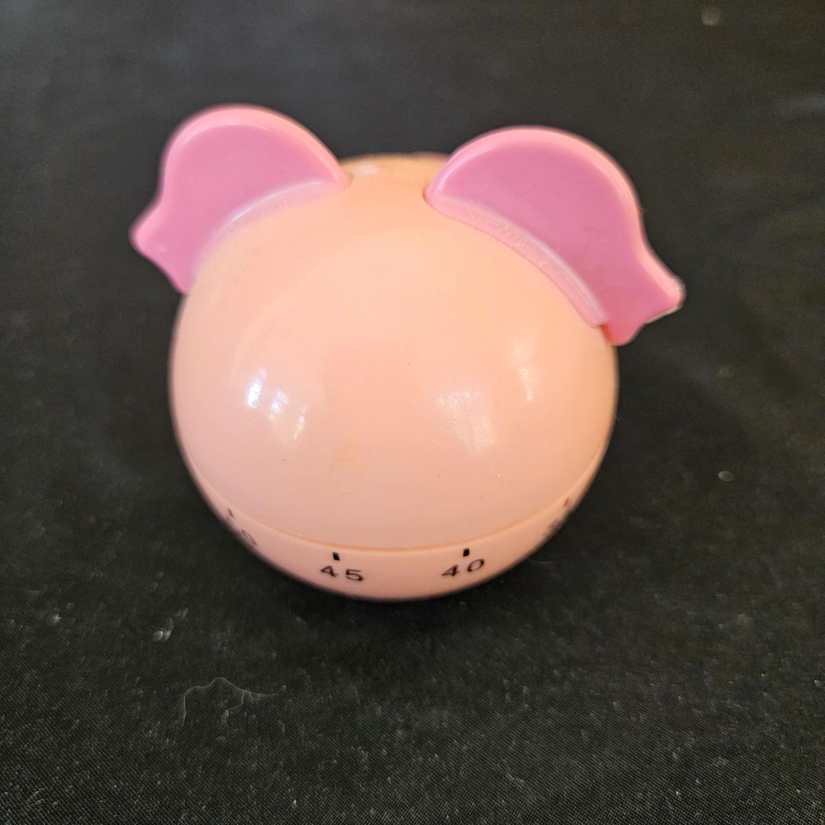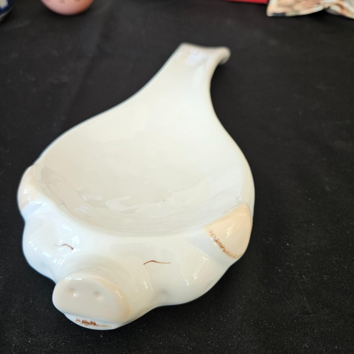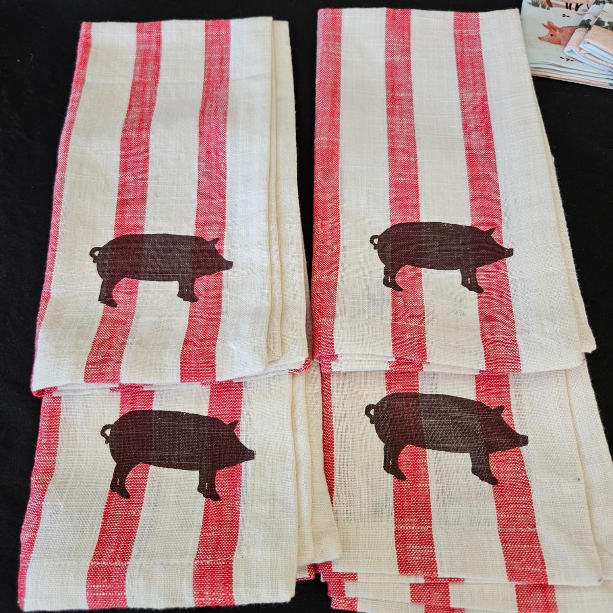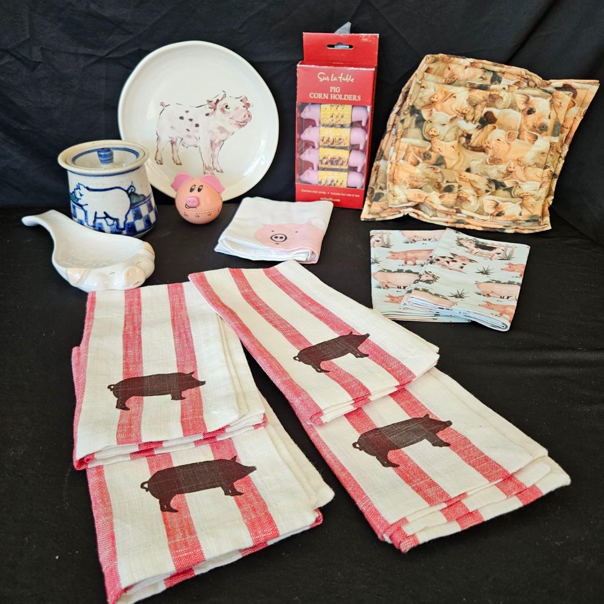 An assortment of pig themed kitchen items and decor that includes cloth napkins, tea towels, pot holders, a plate, a signed piece of pottery, corn holders, a spoon rest and a kitchen timer. The plate measures approximately 8.5"D. Shipping available