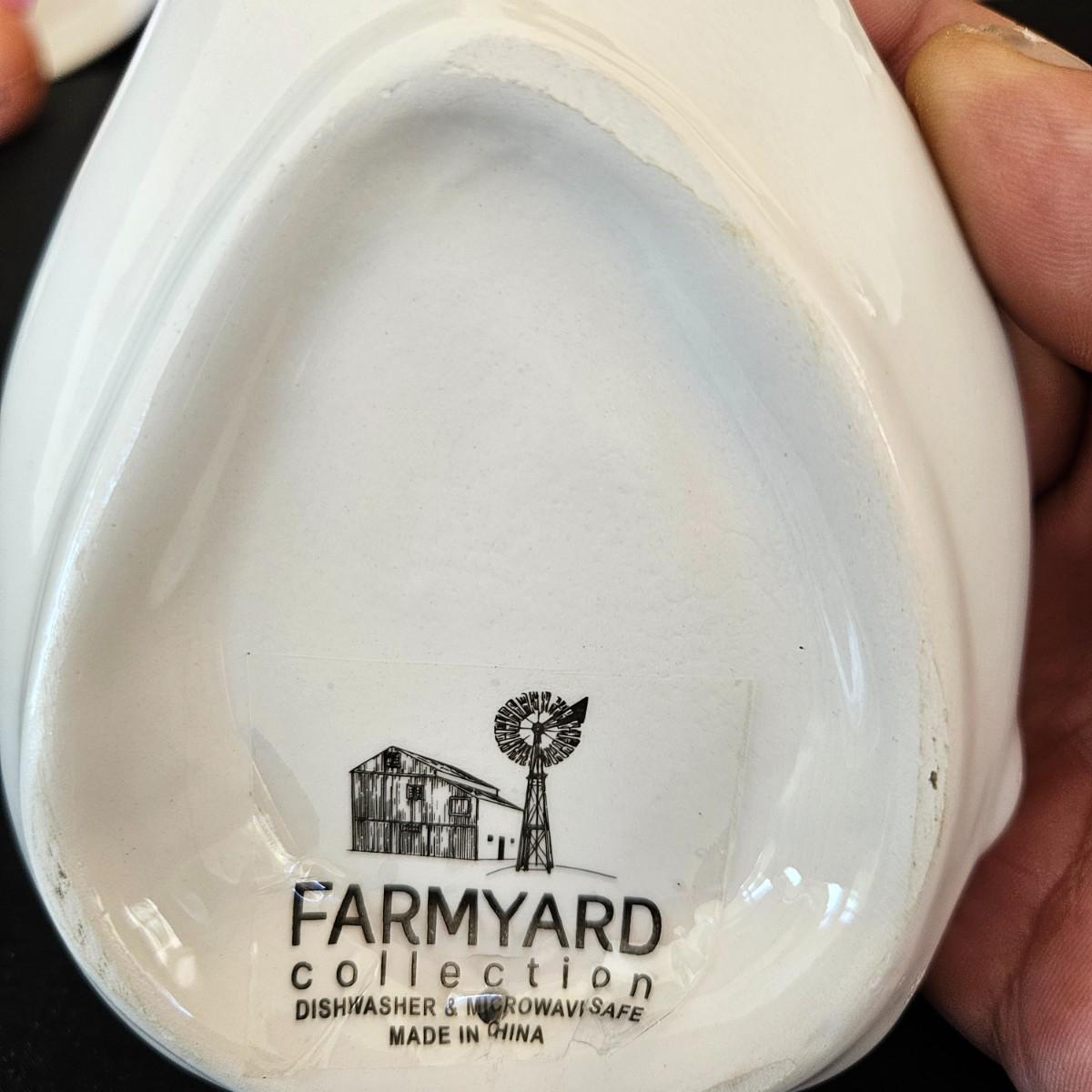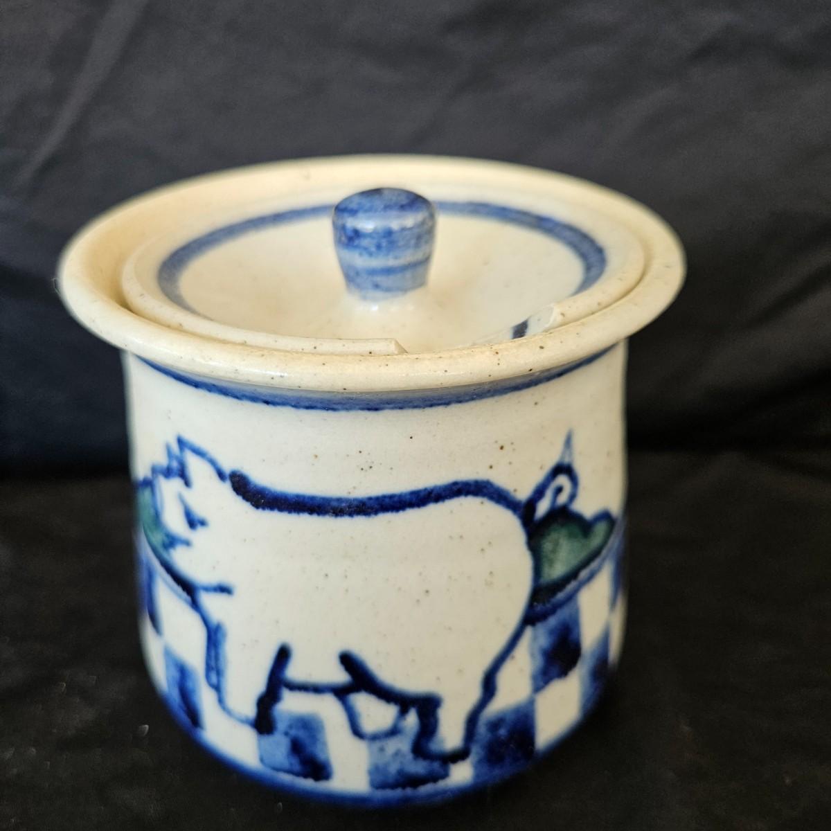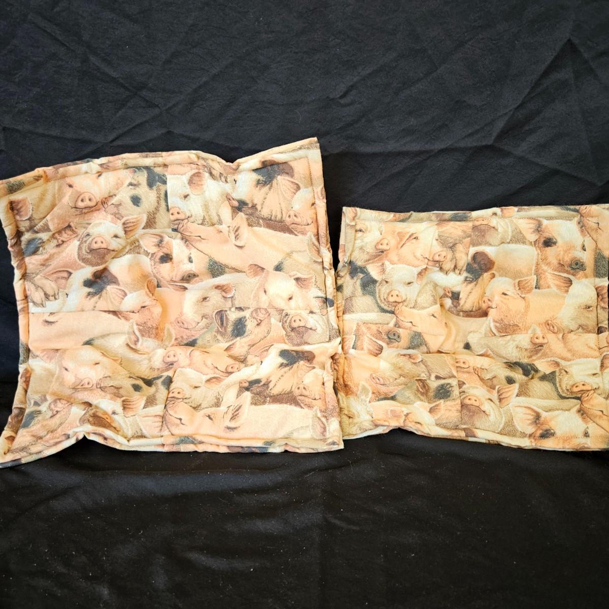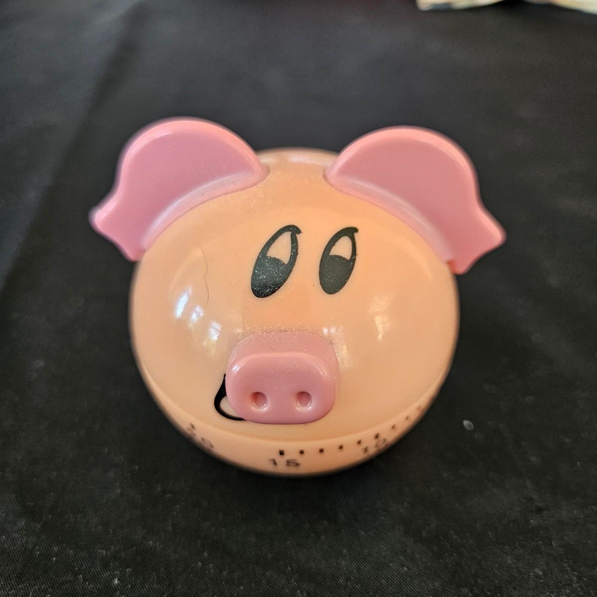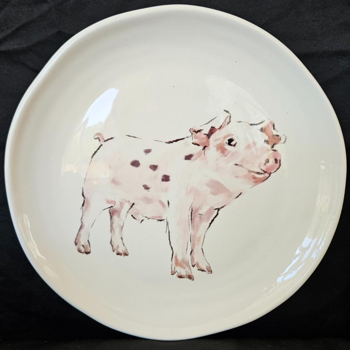 An assortment of pig themed kitchen items and decor that includes cloth napkins, tea towels, pot holders, a plate, a signed piece of pottery, corn holders, a spoon rest and a kitchen timer. The plate measures approximately 8.5"D. Shipping available