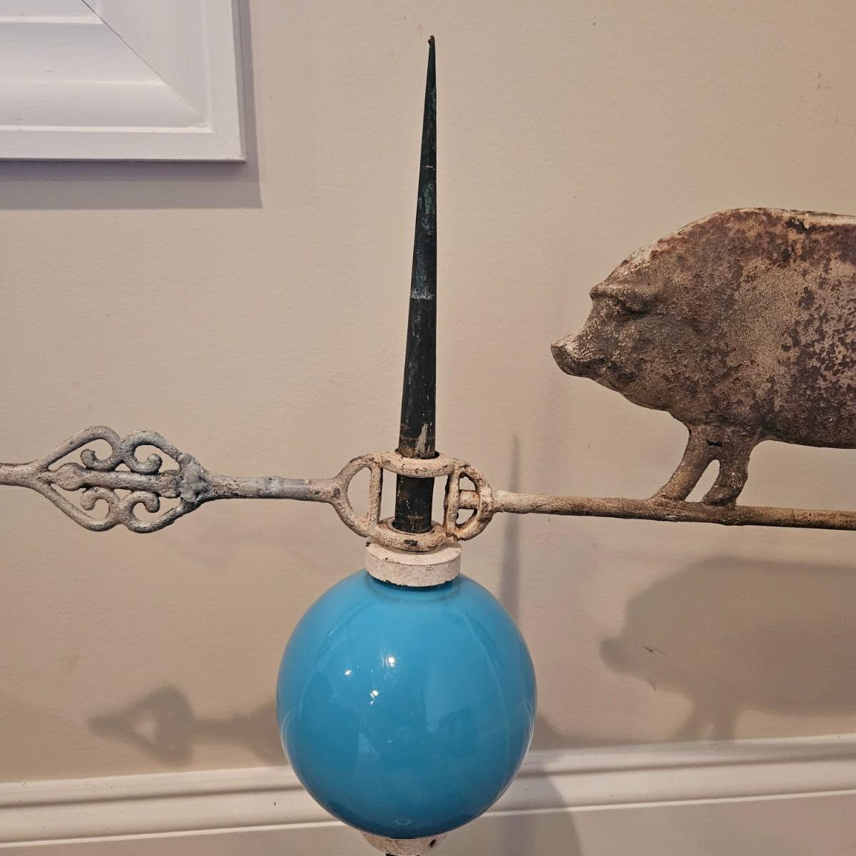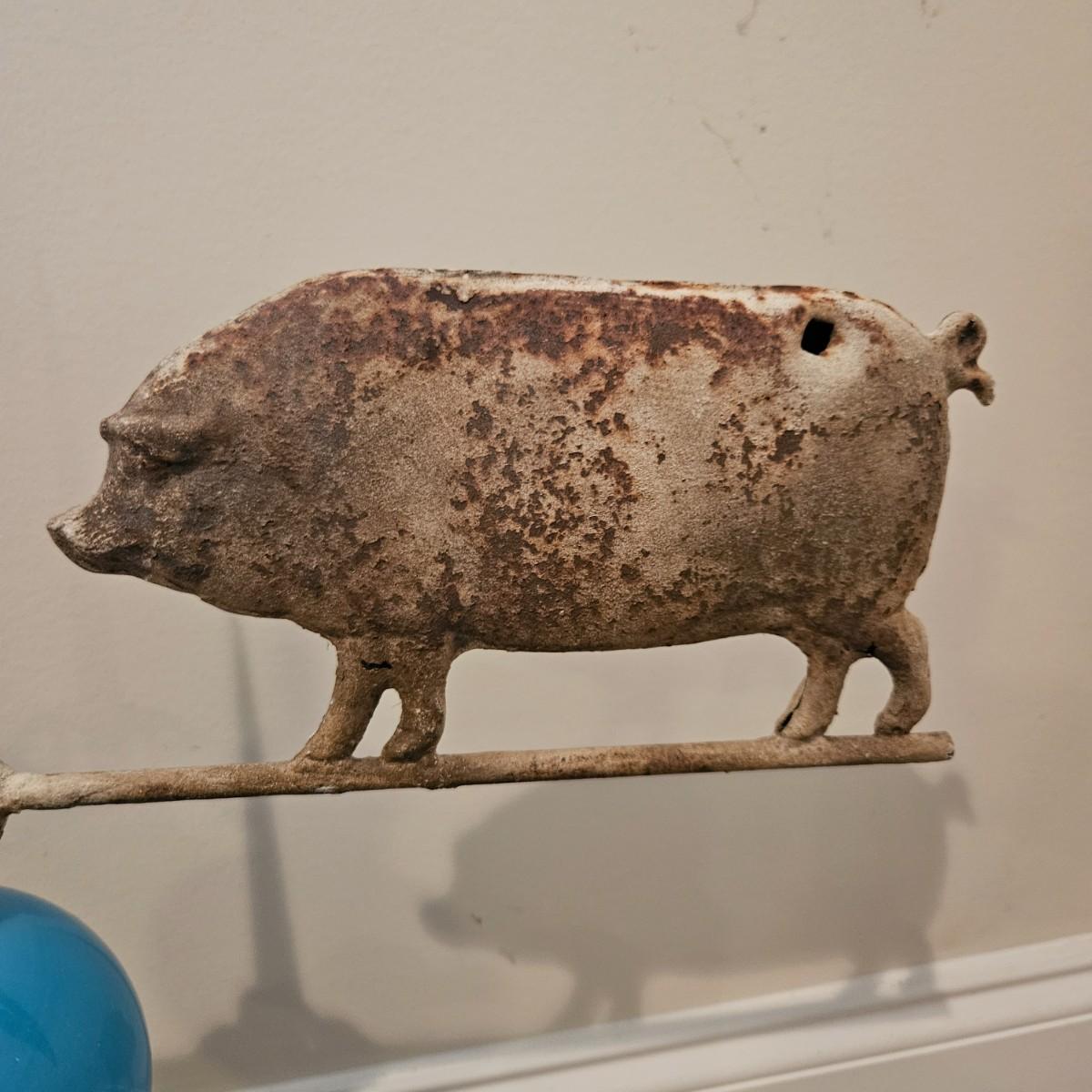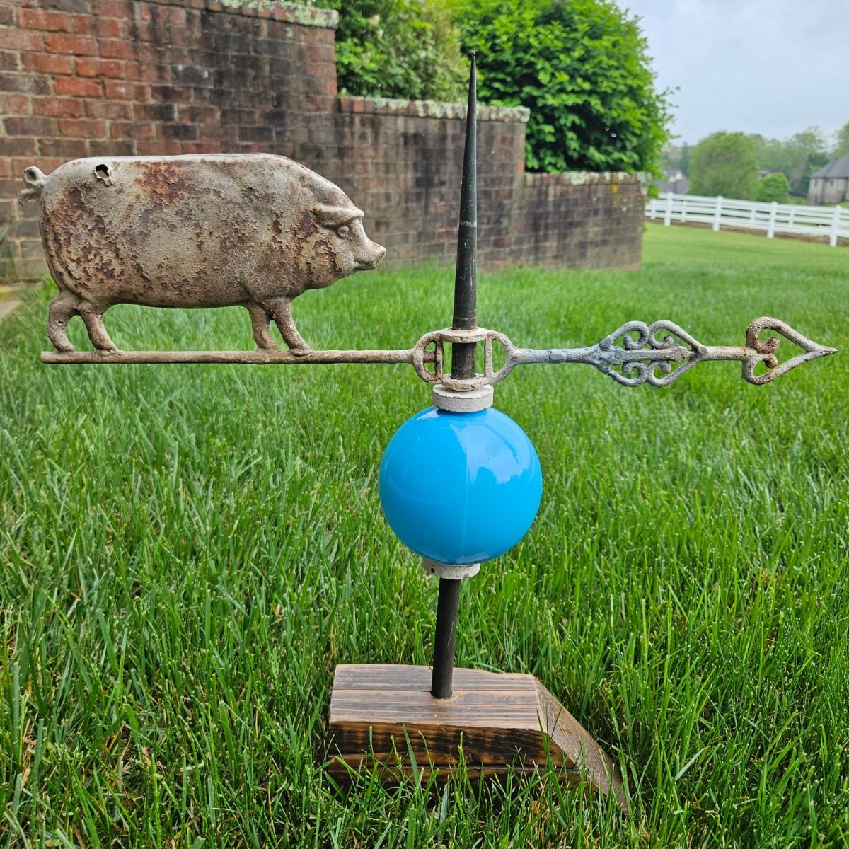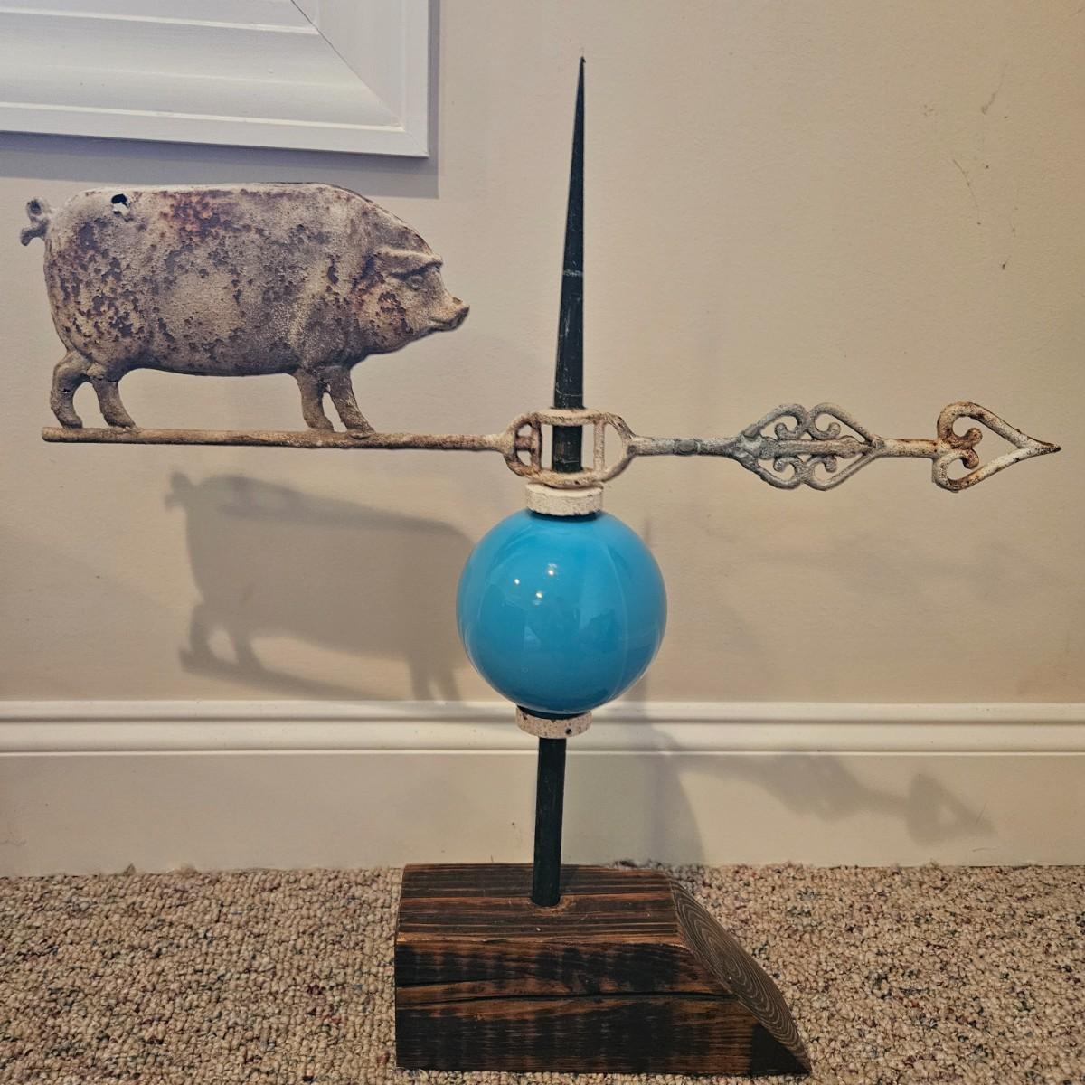 A pig weather vane that appears to made of tin with a blue glass orb mounted on a stained piece of wood. It measures approximately 20.5" x 4.5" x 21.5"H. It includes an extra bearing. Shipping available