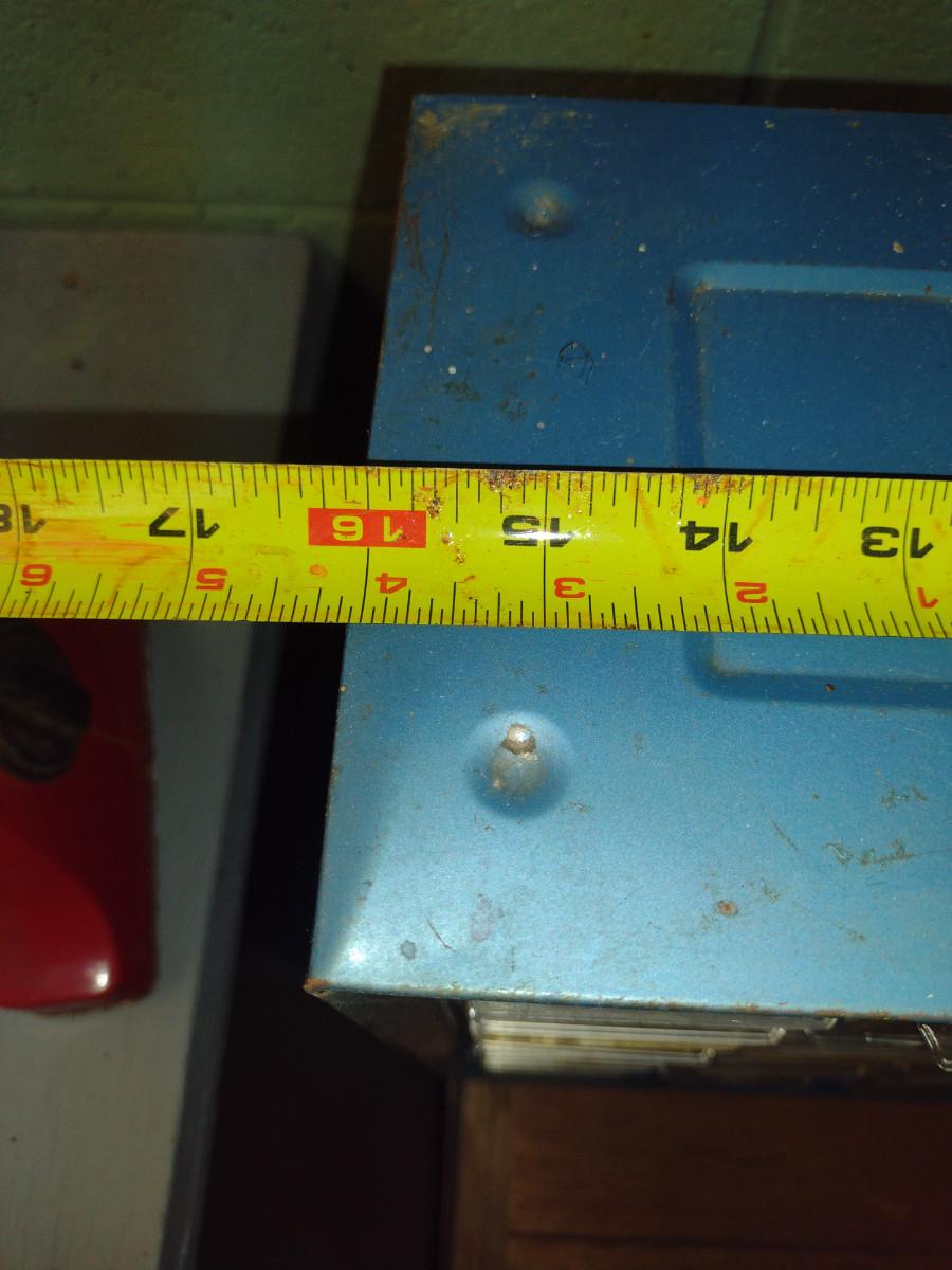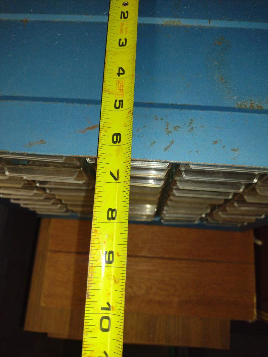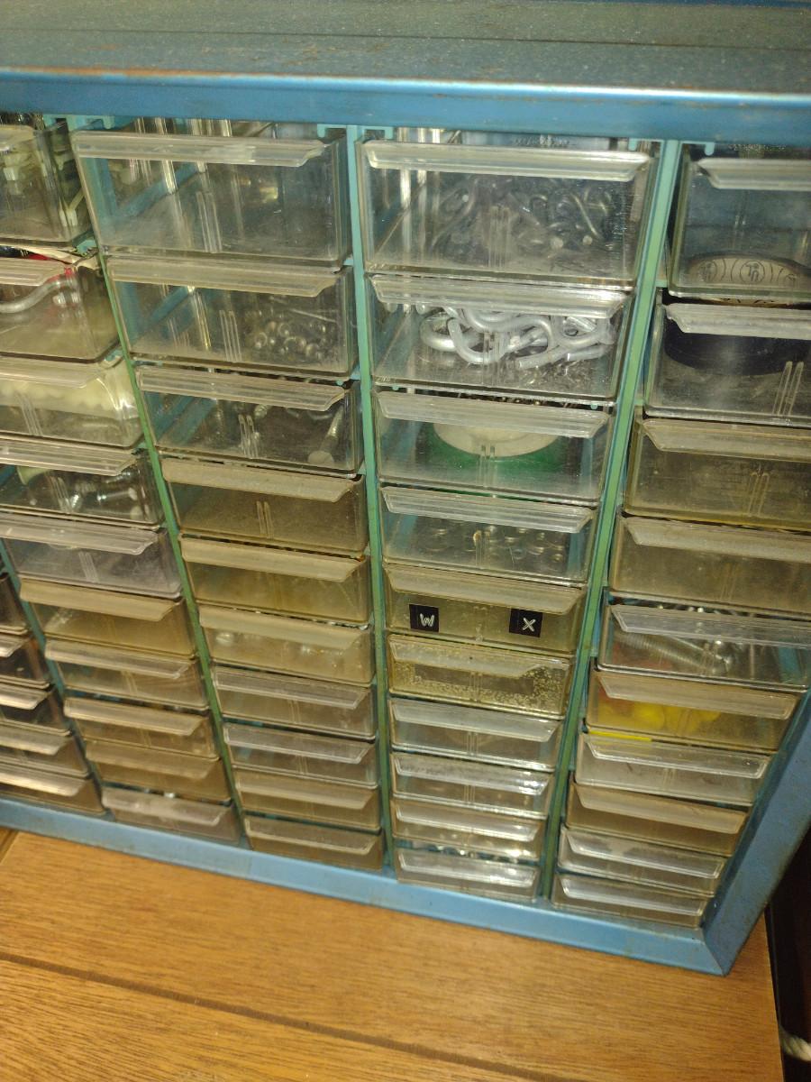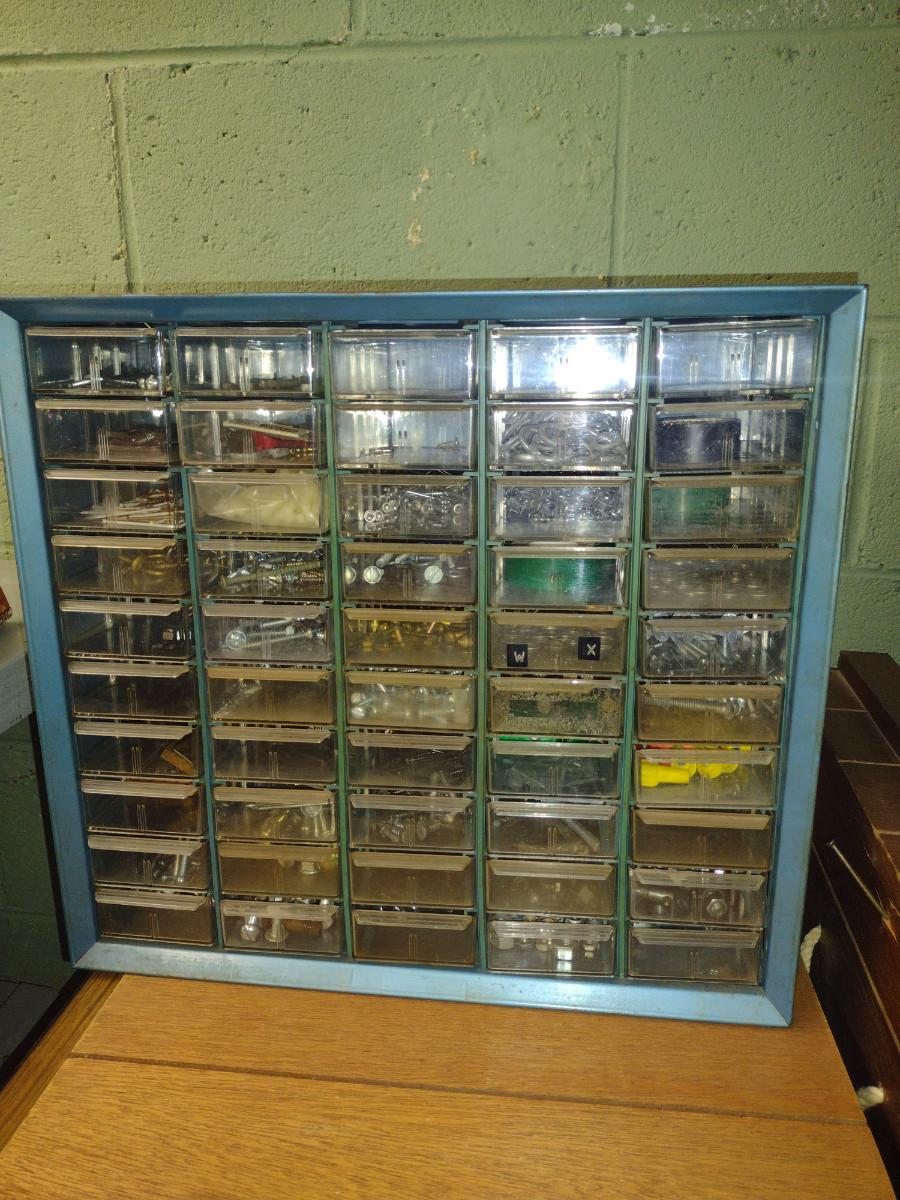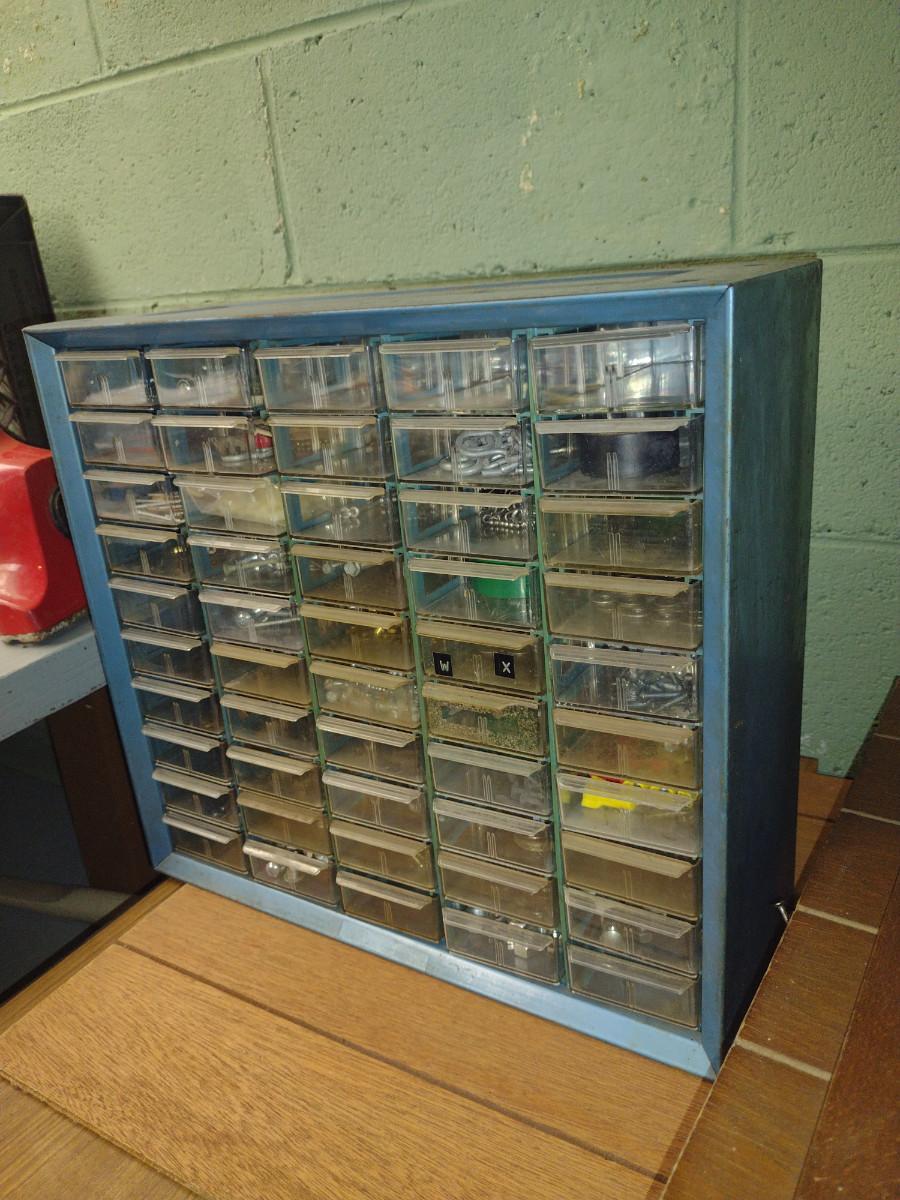 Pigeonhole Storage Box- Metal Body with Plastic Drawers- Approx 16" x 6 1/2" x 15" Tall. Contents included.