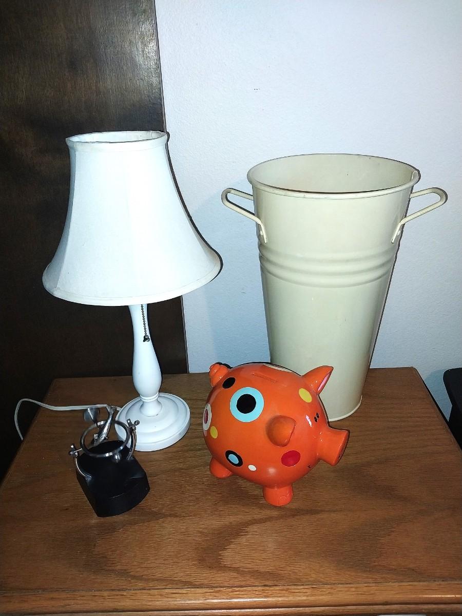 PIGGY BANK, BALANCING DOLPHIN, TABLE LAMP & METAL VASE