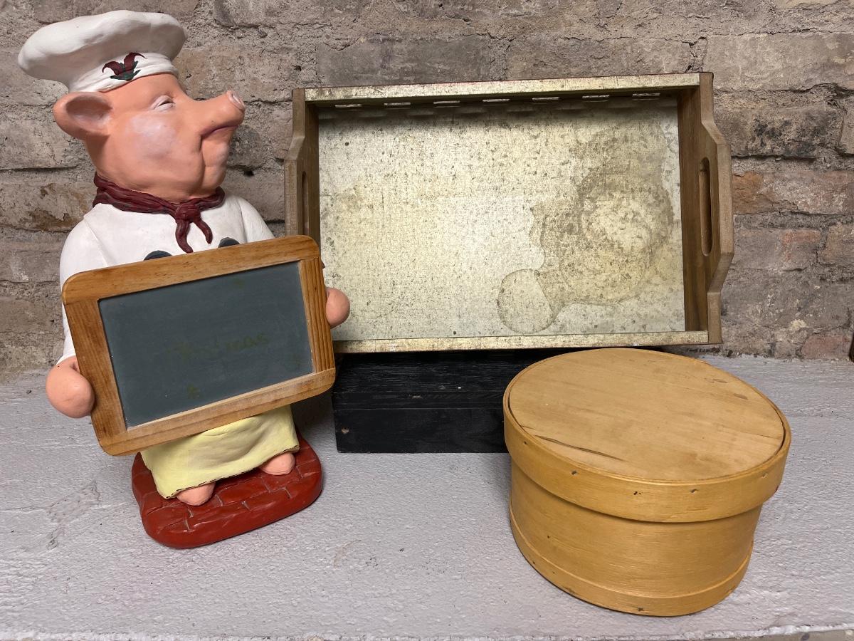 We called him the snooty pig with a chalk board! Neat metal and wood tray and a Dufeck's Birch Box